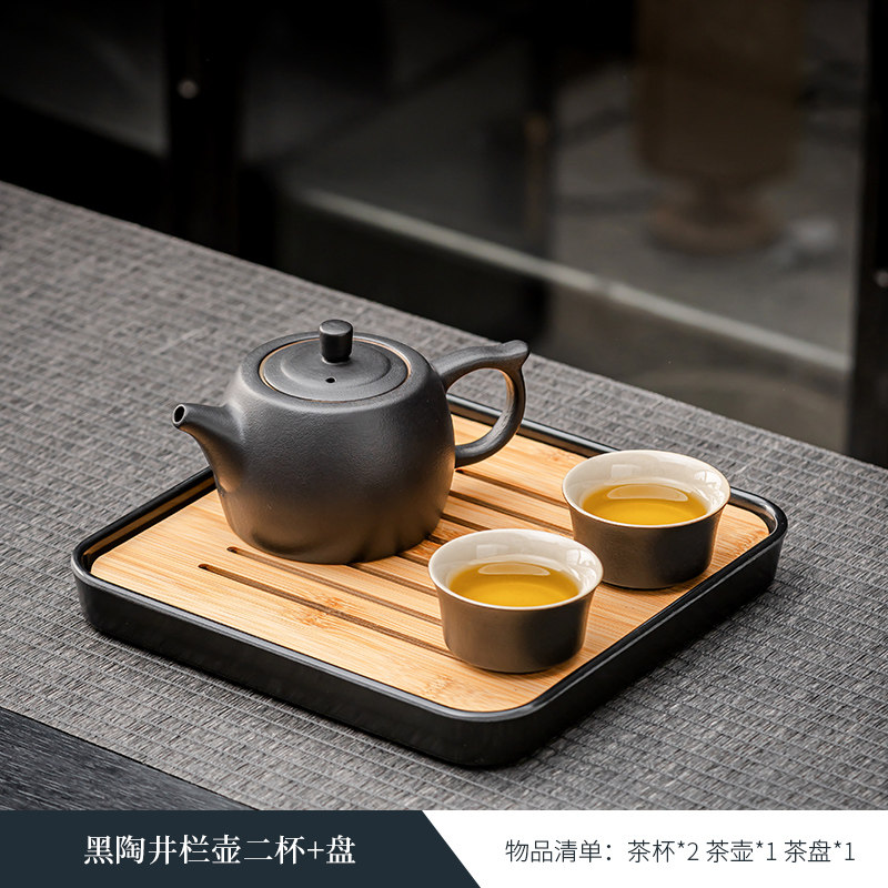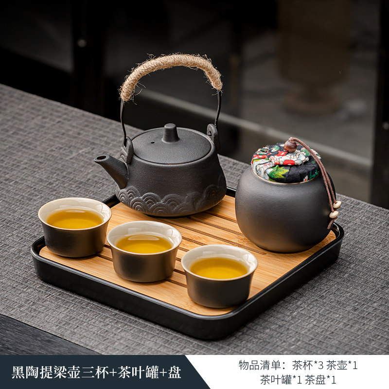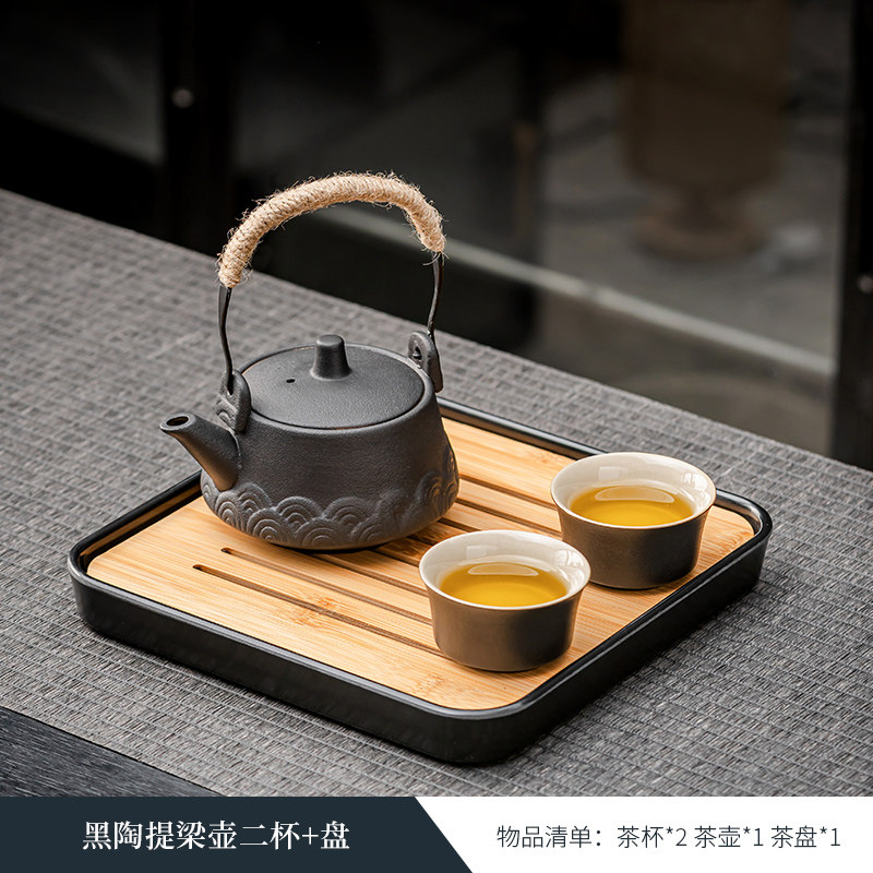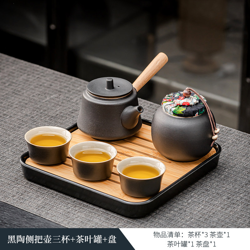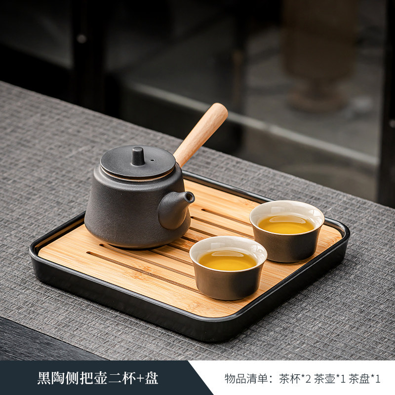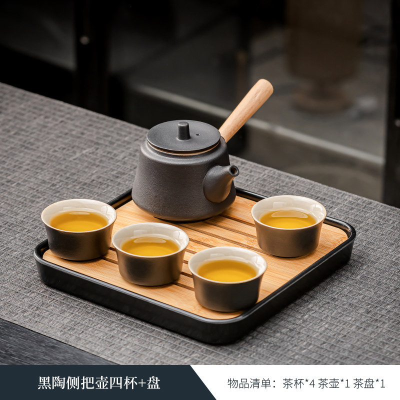black porcelain side handle pot three cups + tea pot + plate
