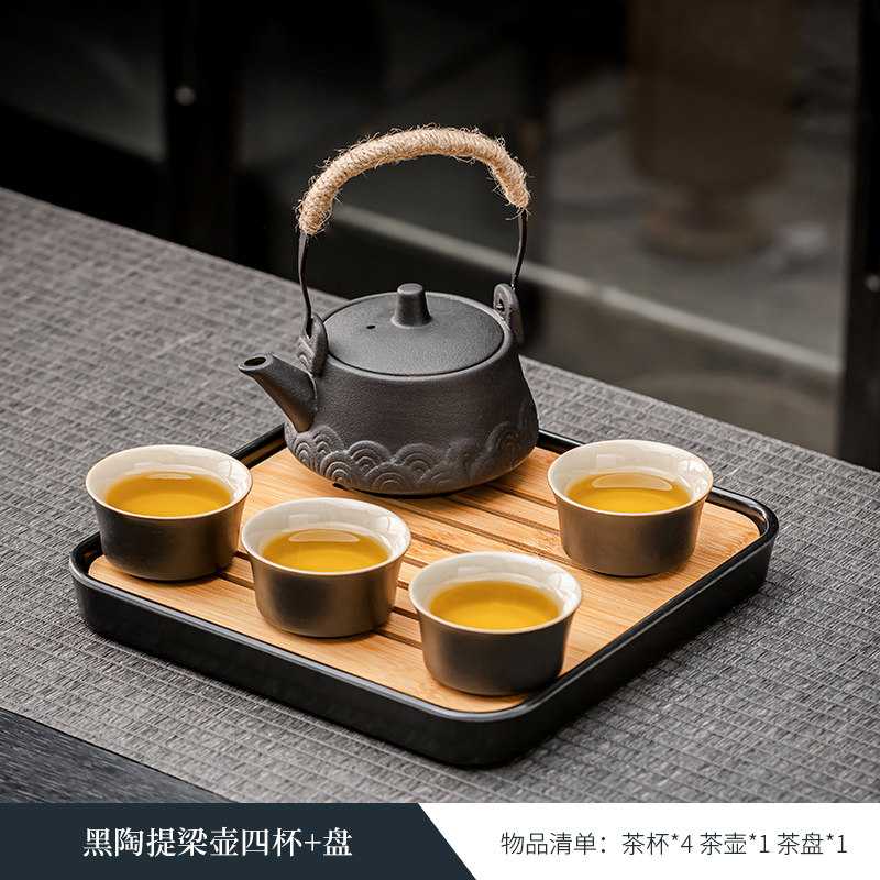 black porcelain side handle pot four cups + plate