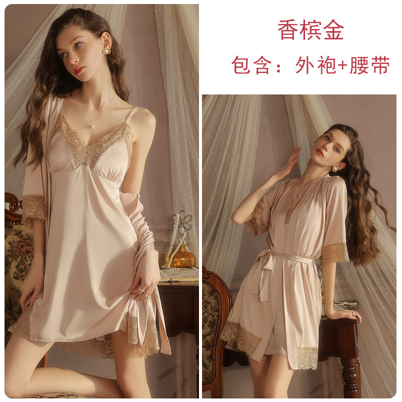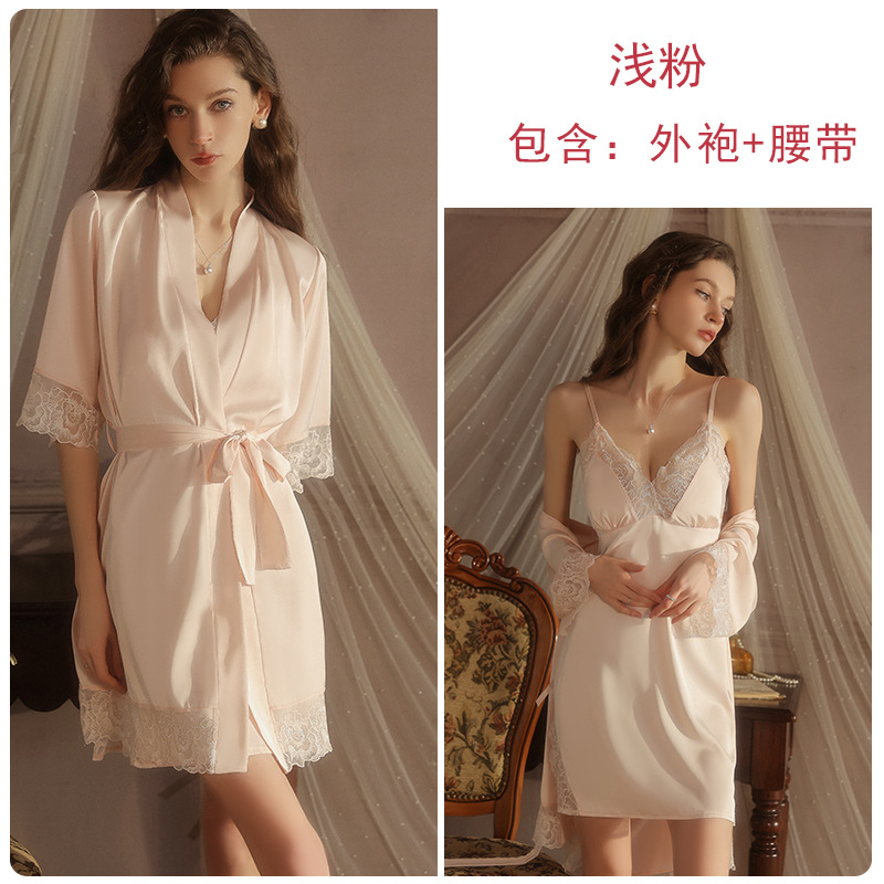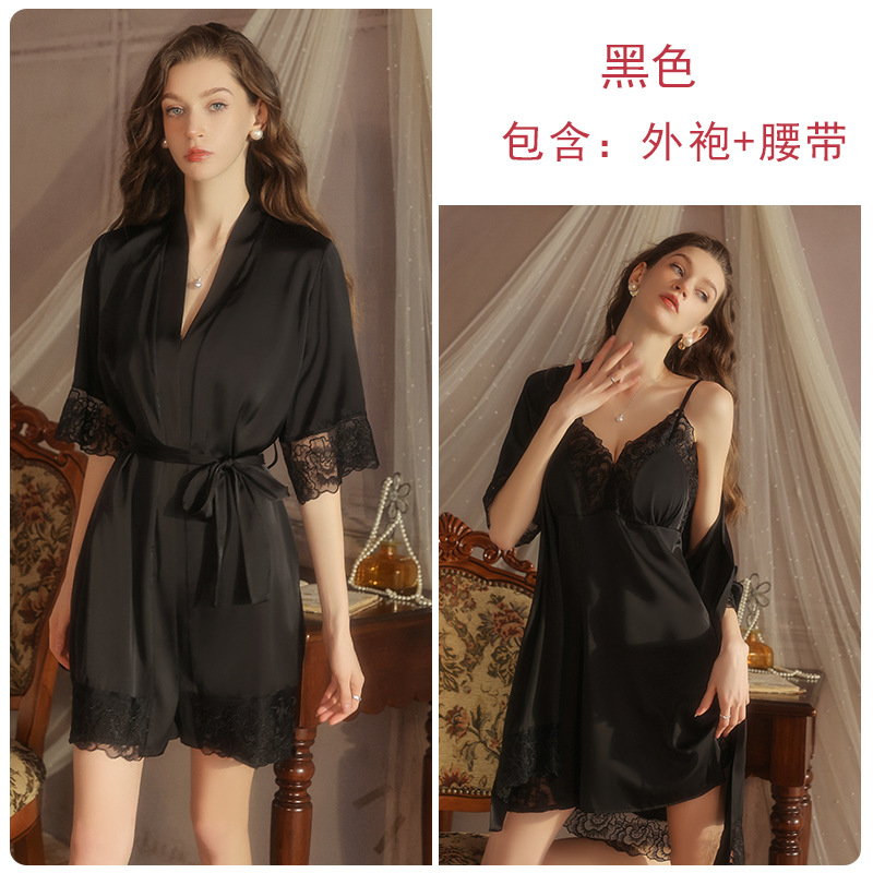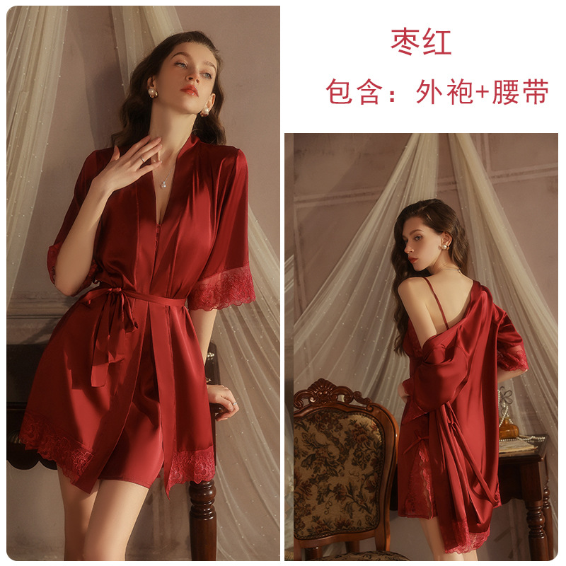 ruoruo satin double slit lace stitching chest pad deep v seduction braces nightdress half sleeve outerwear gown homewear 5618