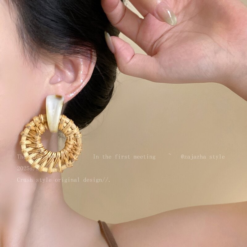 a pair of light brown rattan ear rings