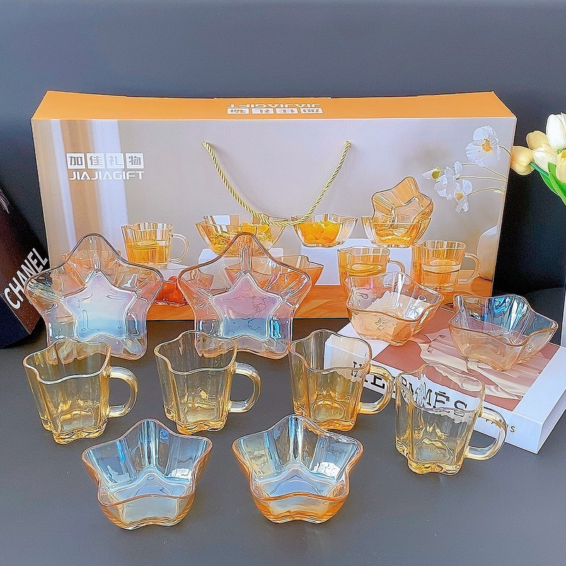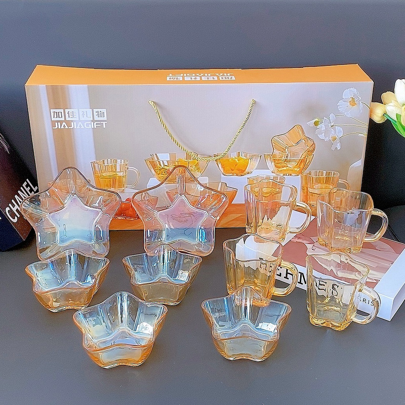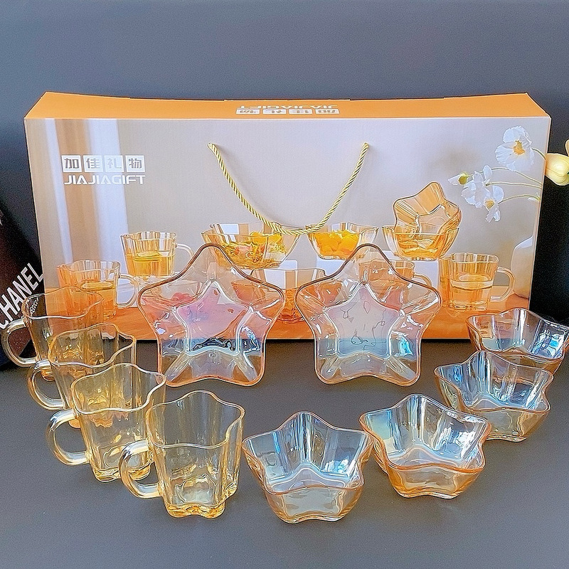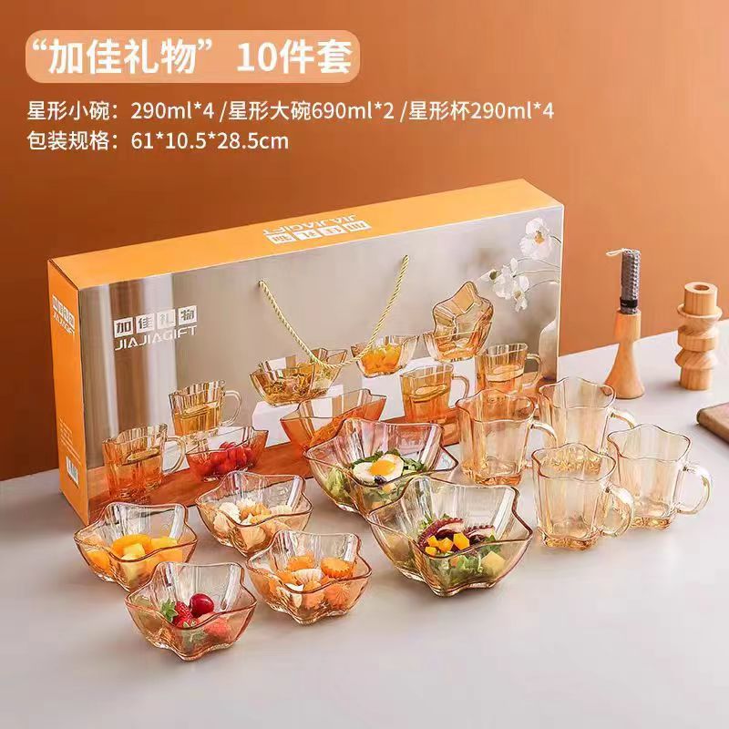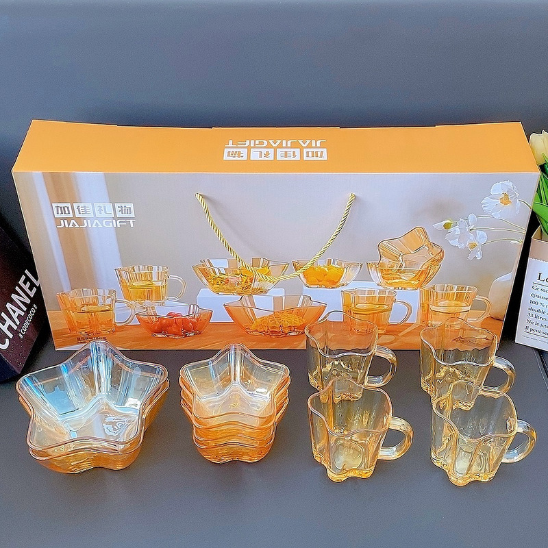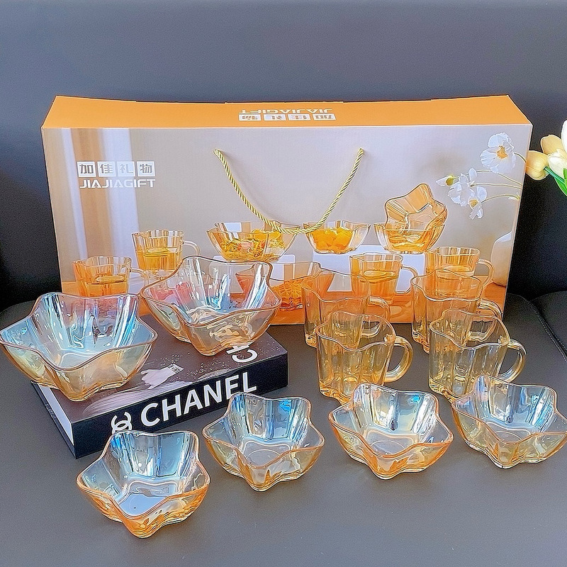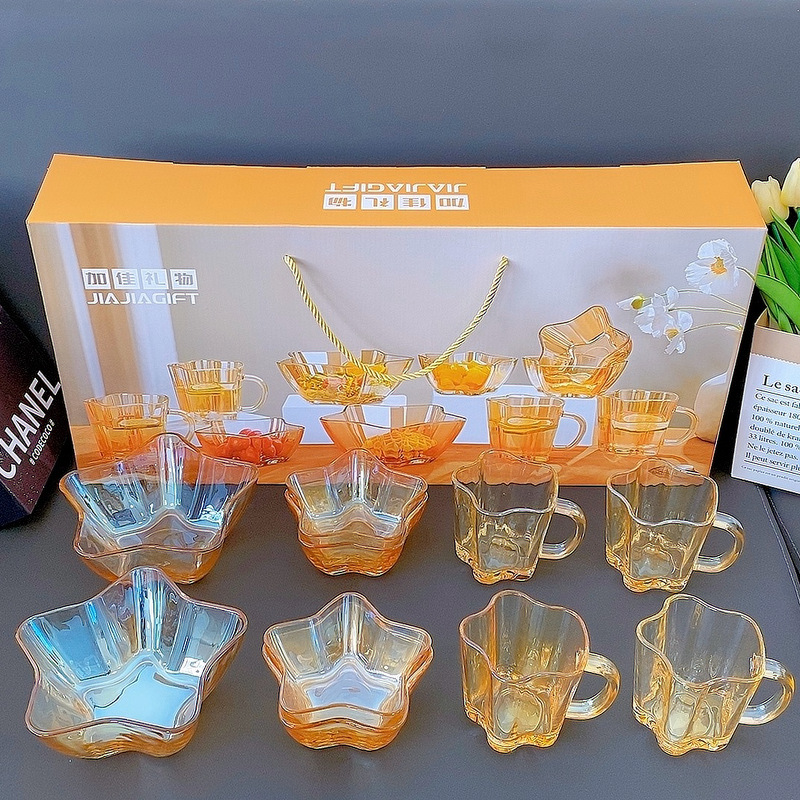 Beautiful and practical, this set of dishes is a great choice for both gifting and personal use. The amber color is beautiful and transparent, making it look very high-end. The set includes four small bowls, four cups, and two large bowls, perfect for holding fruits, salads, yogurt, milk, and cereal. Using these glow-in-the-dark dishes can make your mood better.