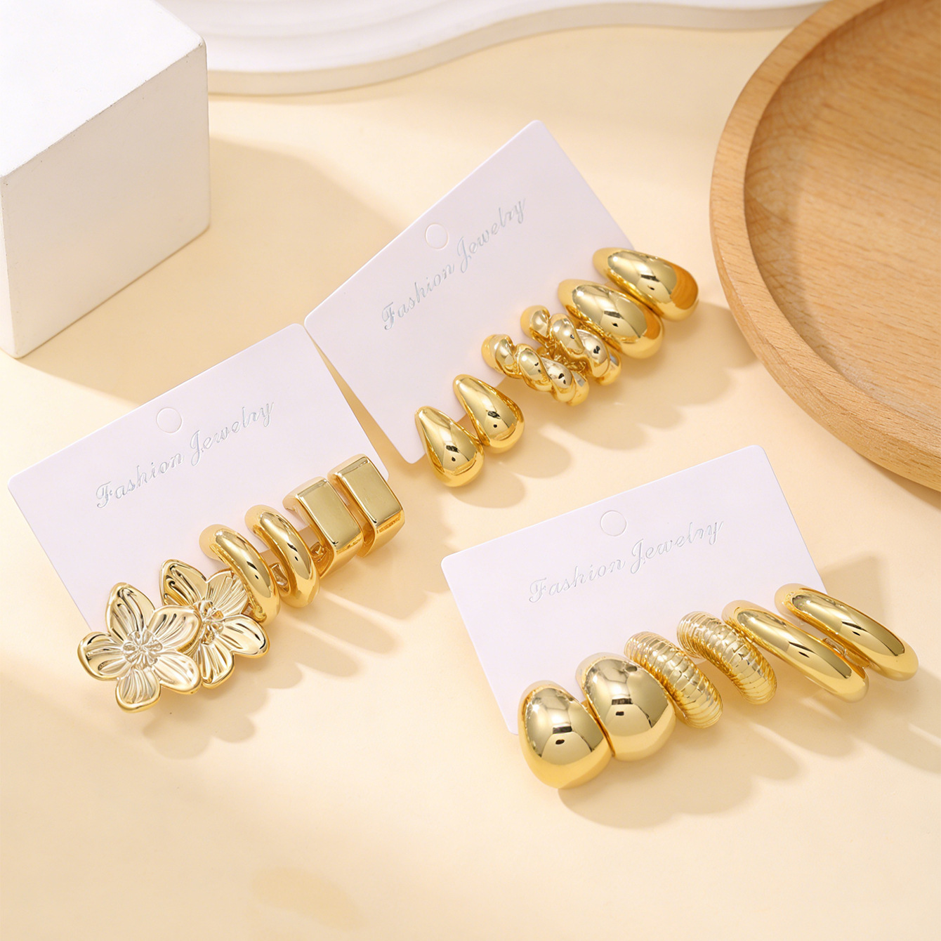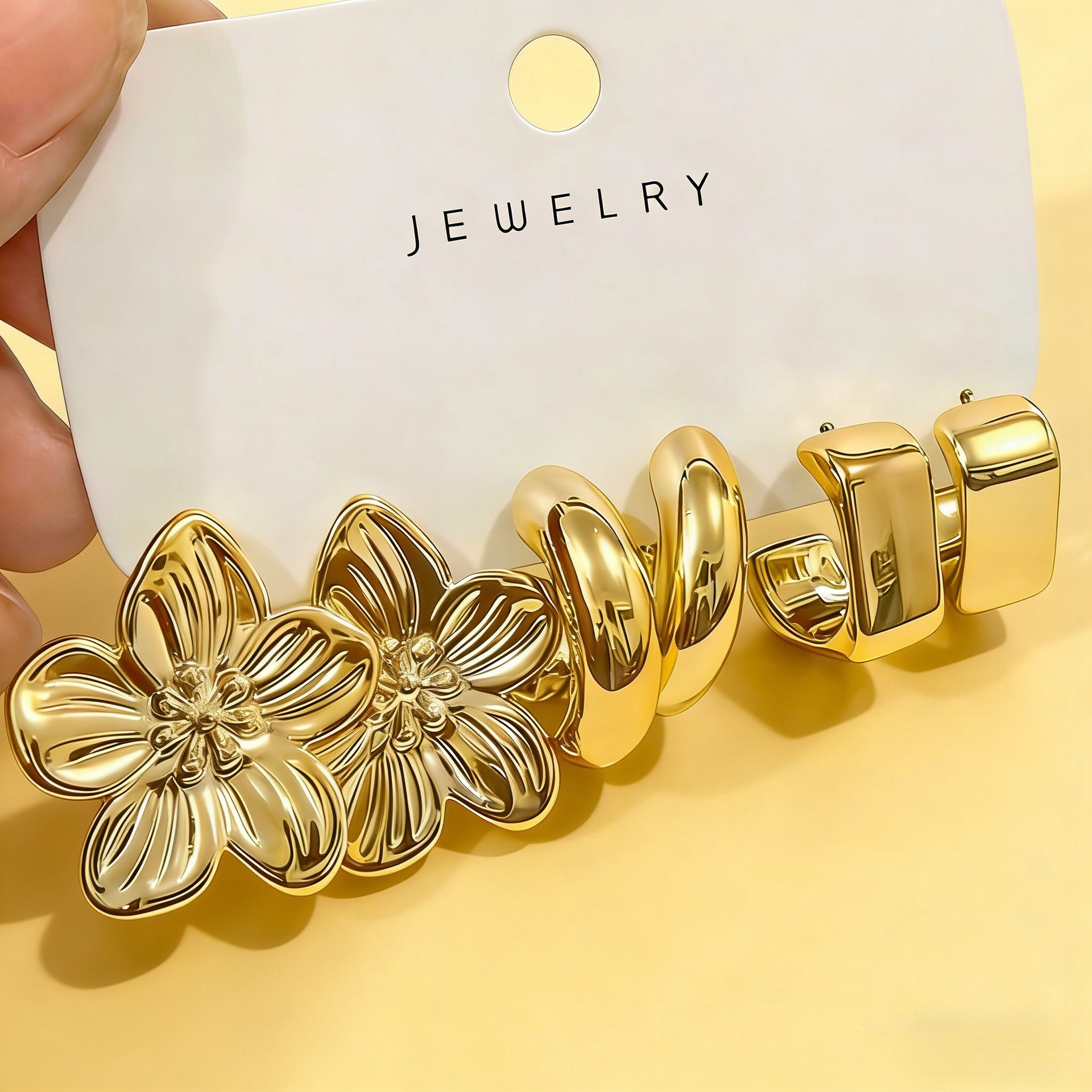 new flower-shaped square earrings, 3 pairs – gold color