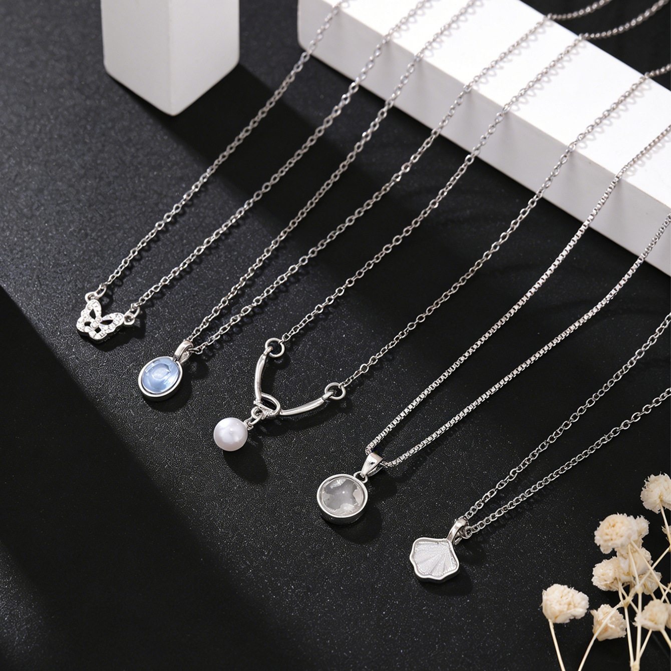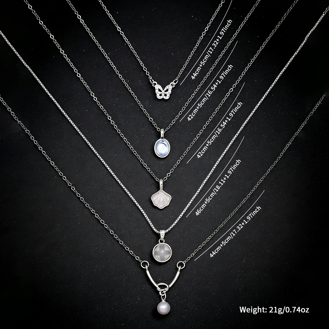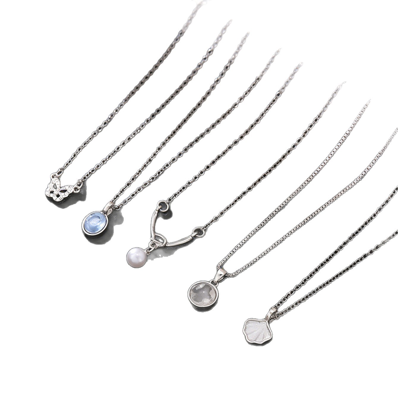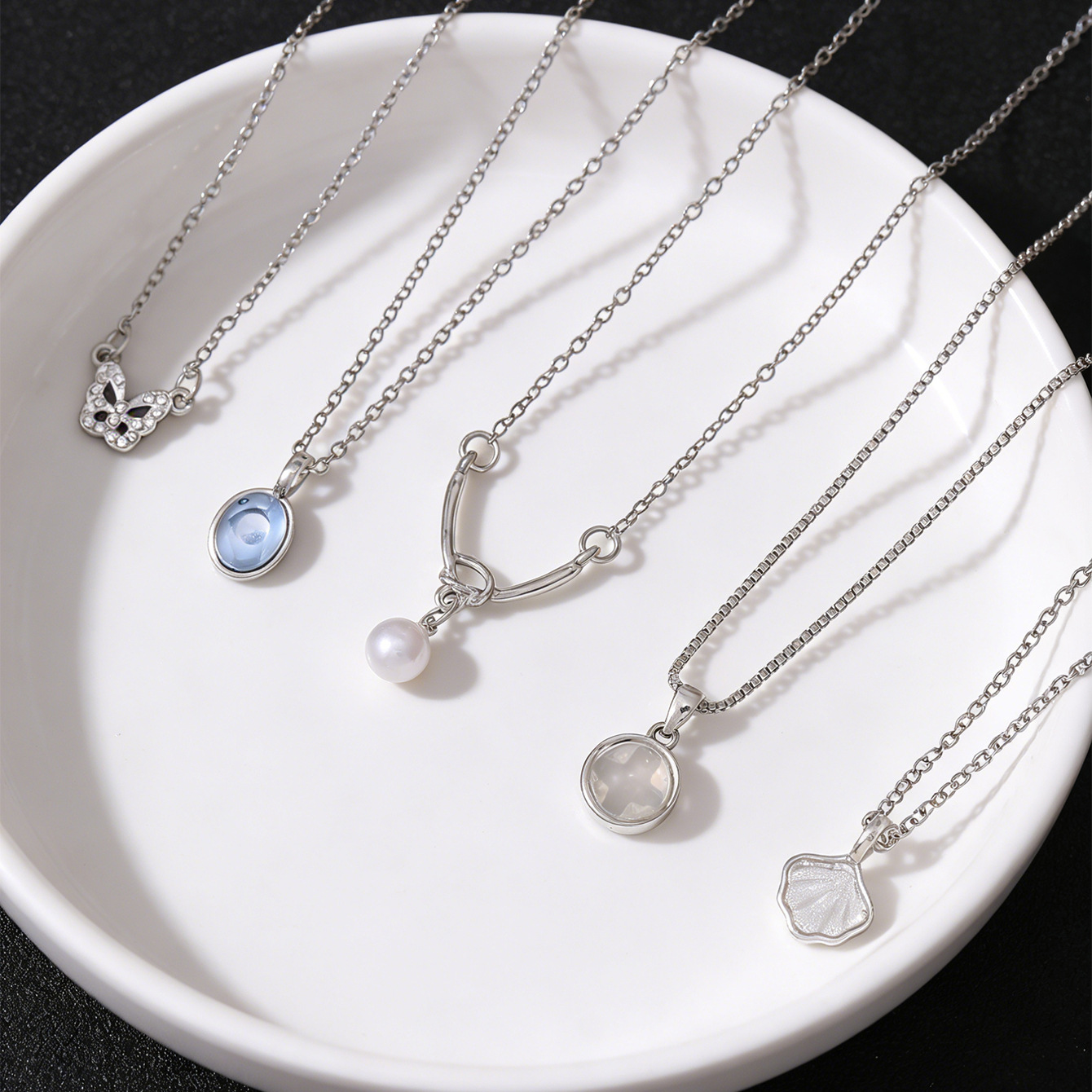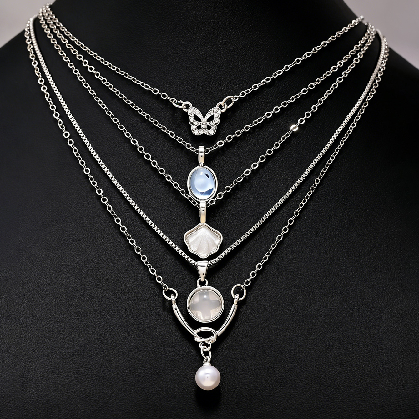 5-piece pearl butterfly shell necklace-silver