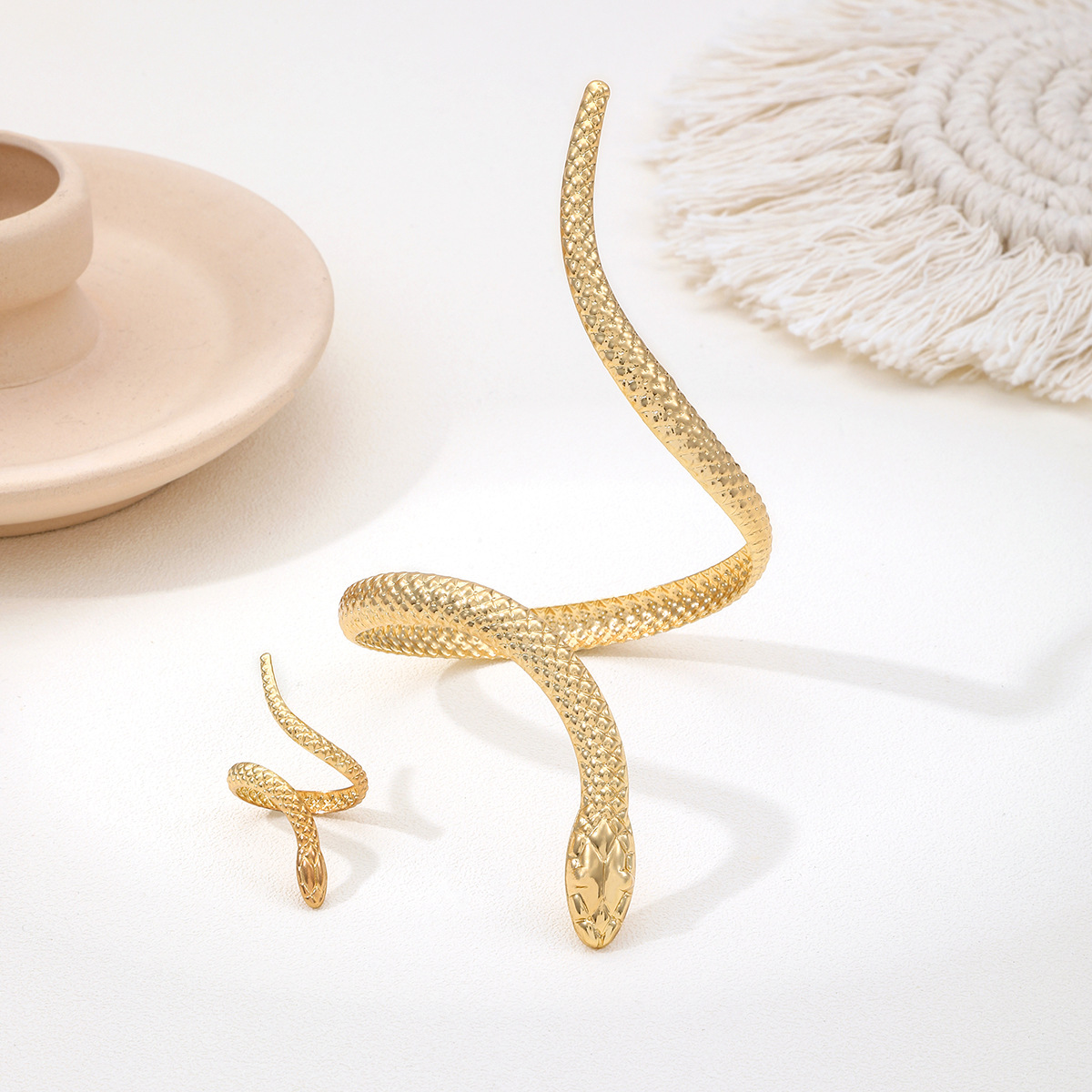 europe and america cross border fashion exaggerated high sense bracelet female golden yellow snake-shaped opening adjustable bracelet & ring set