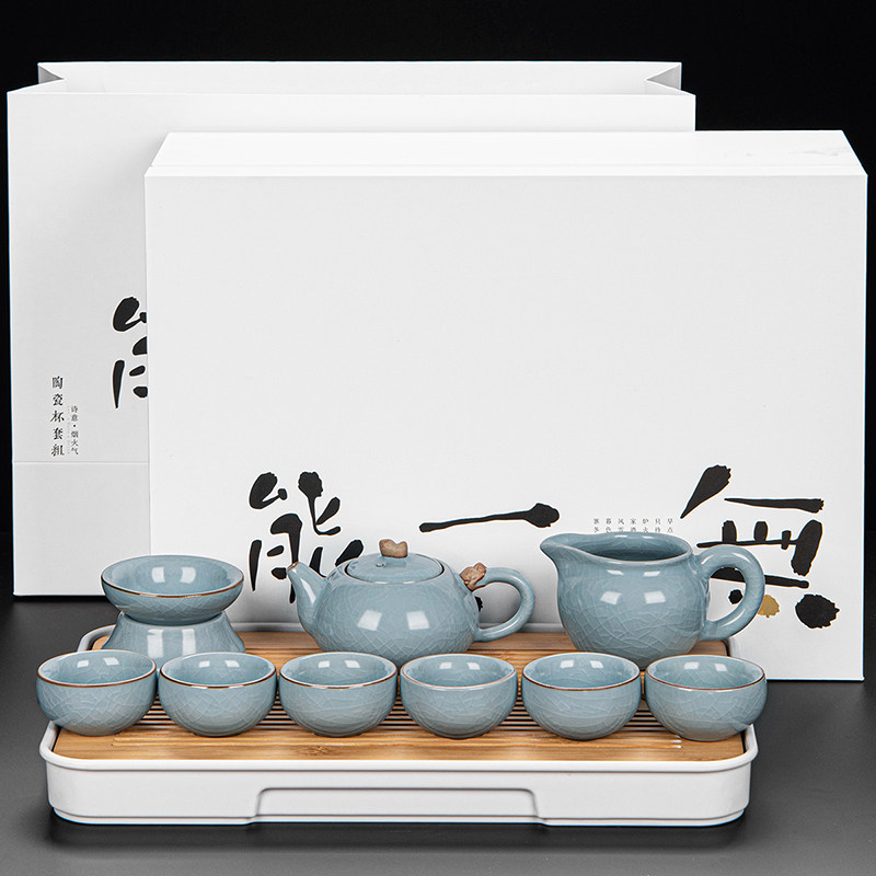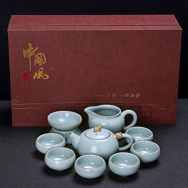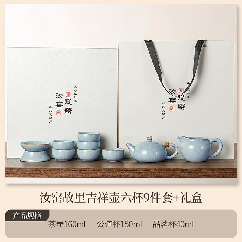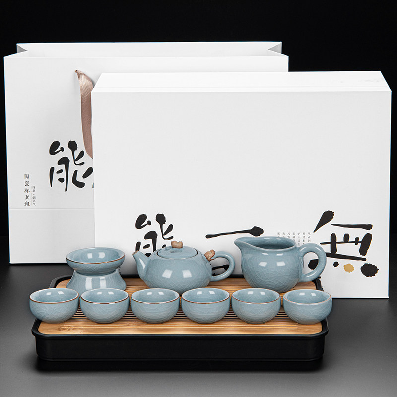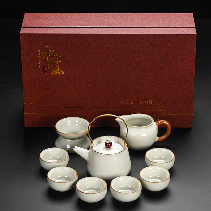 ru ware hometown loop-handled teapot tureen eight cups with tea ceremony tea pot tea basin 15-piece set + happy gift box-large