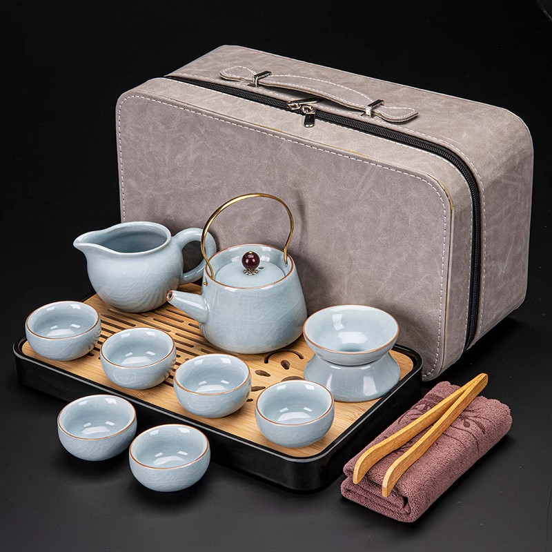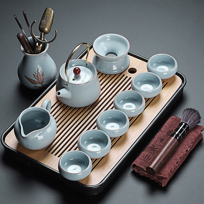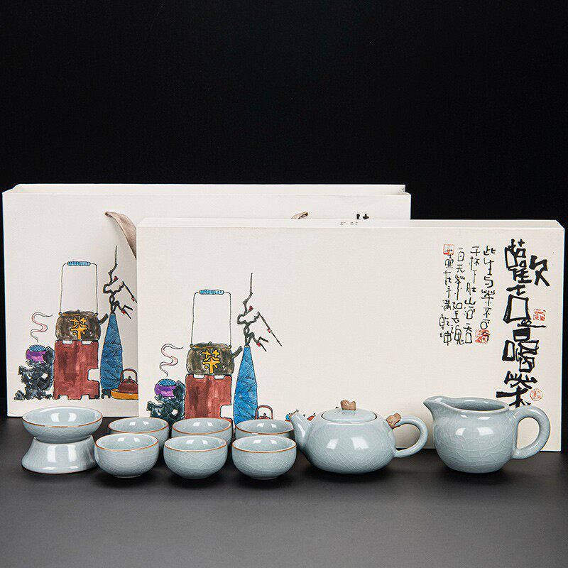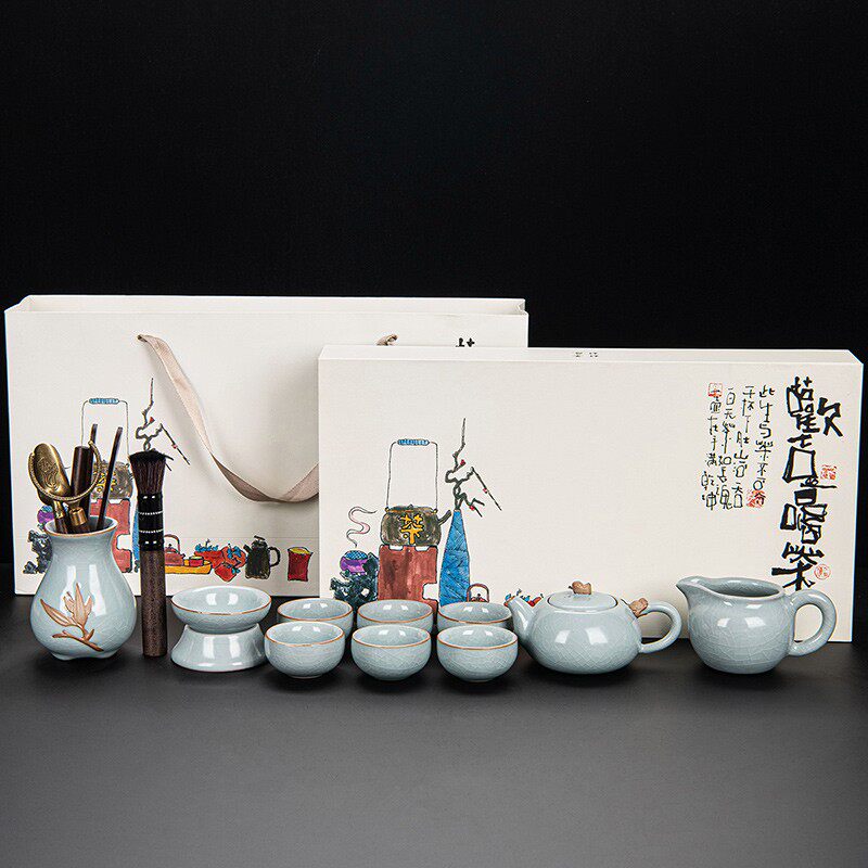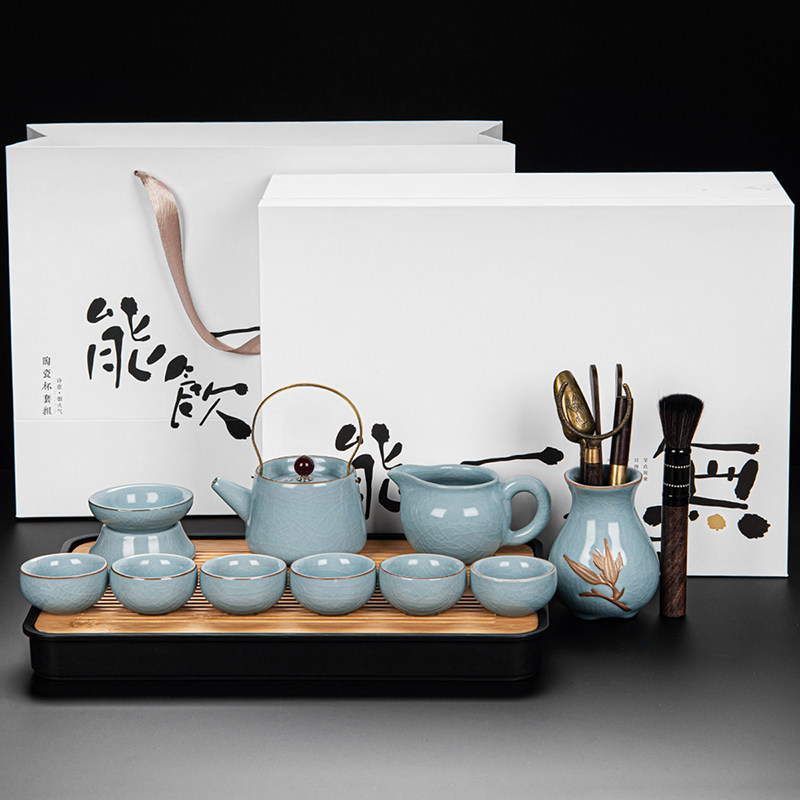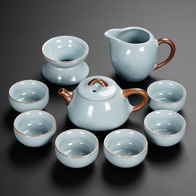 ru ware hometown loop-handled teapot tureen eight cups with tea ceremony tea pot tea basin 15-piece set + happy gift box-large