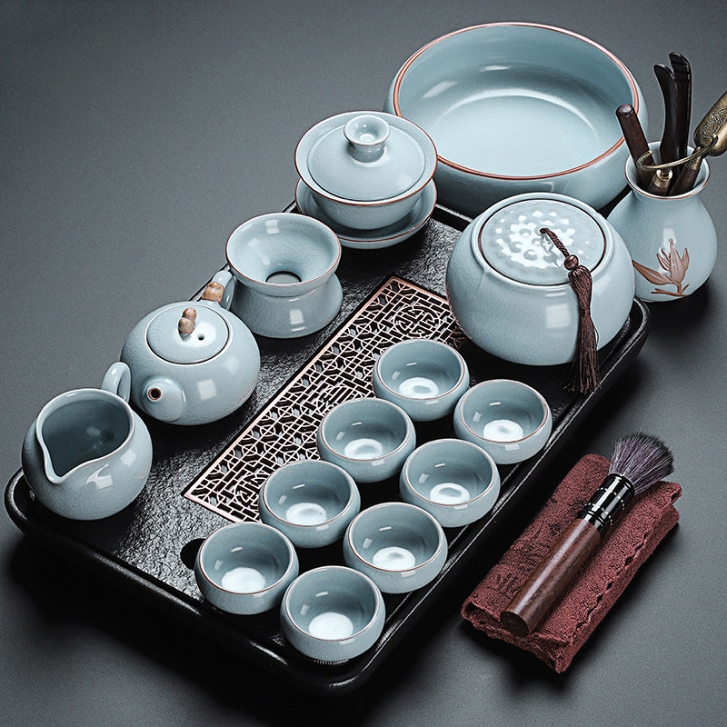beige ru ware hometown lucky pot tureen eight cups with tea ceremony tea warehouse tea basin 15-piece set + rectangular black tea tray