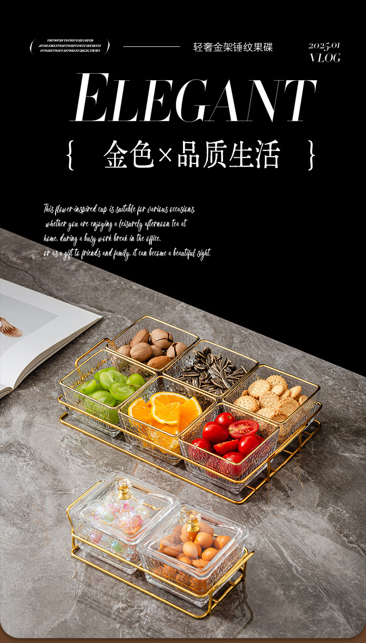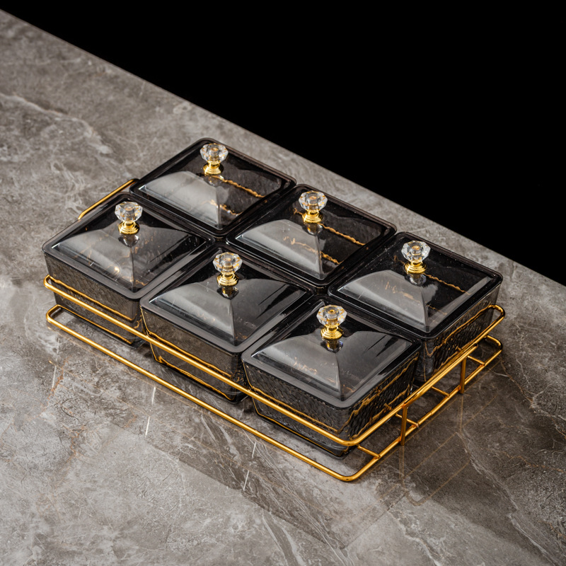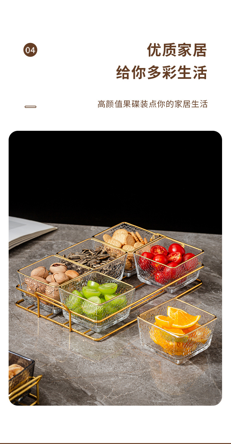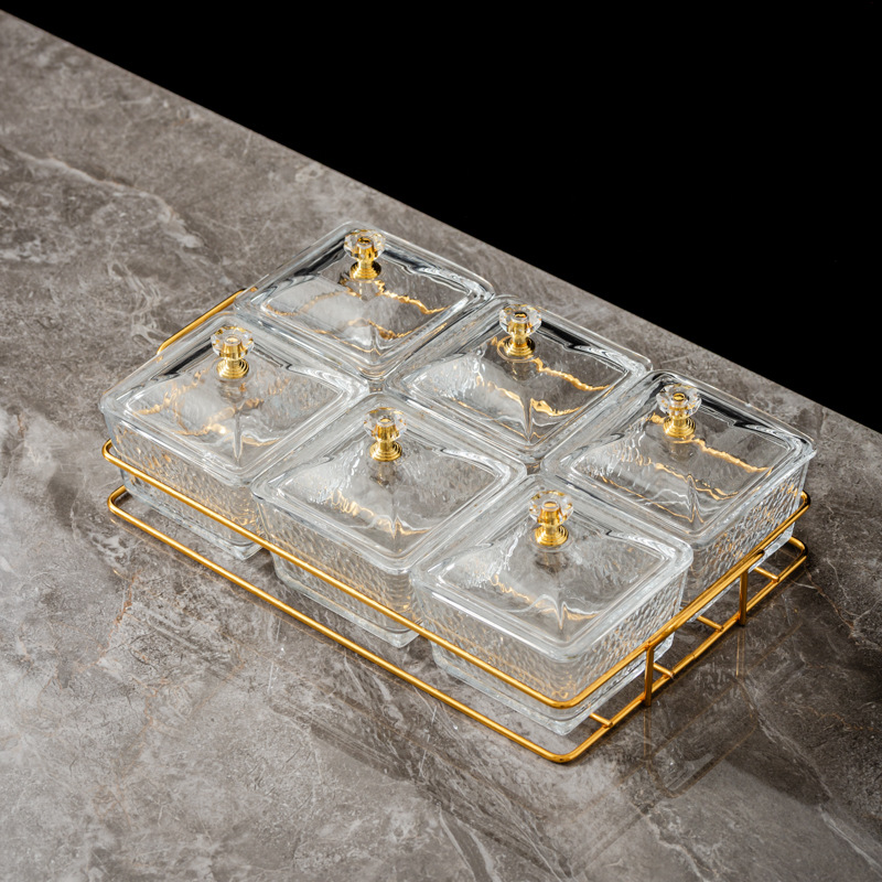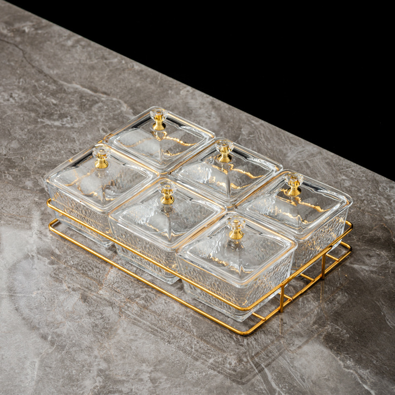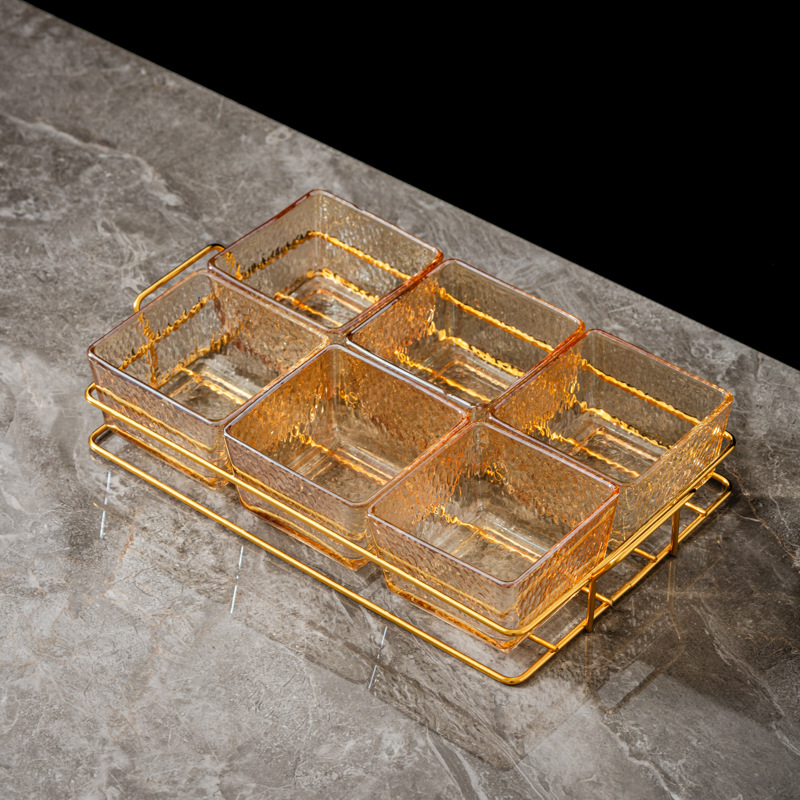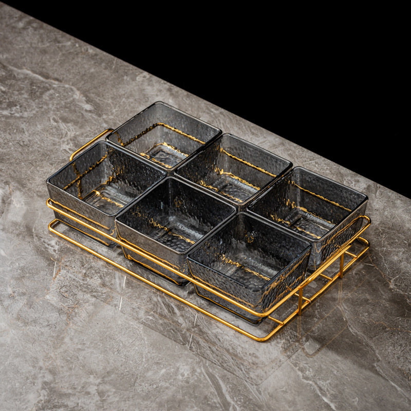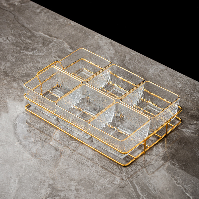 six-compartment transparent hammered plastic dish + square-ear metal frame
