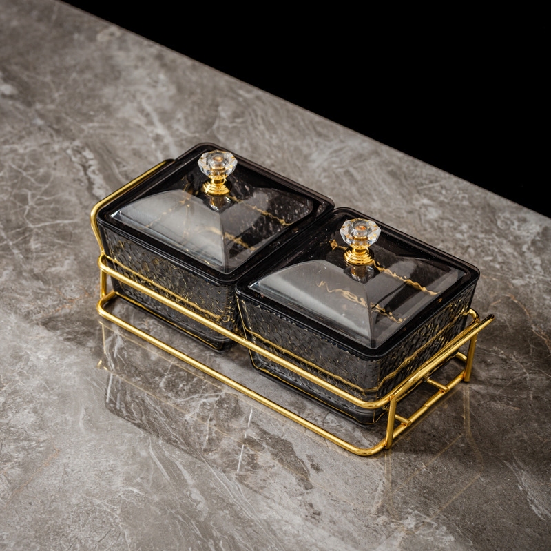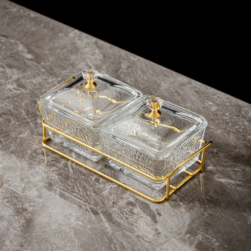 two-compartment transparent hammered plastic dish + square-ear metal frame + lid