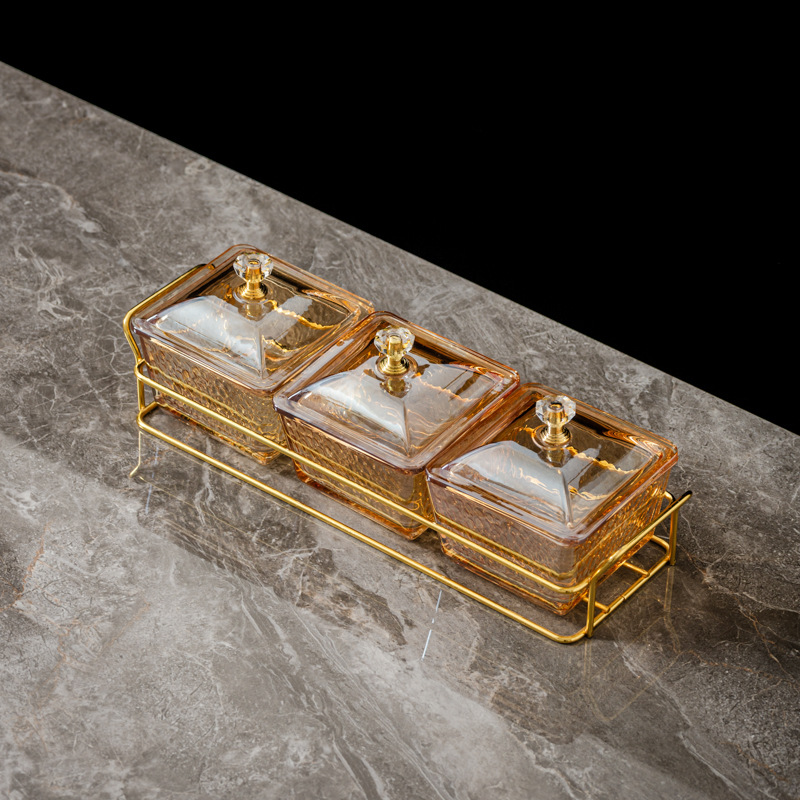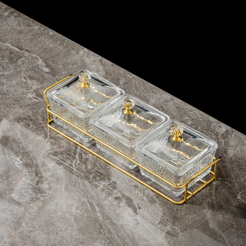 three-compartment transparent hammered plastic dish + square-ear metal frame + lid