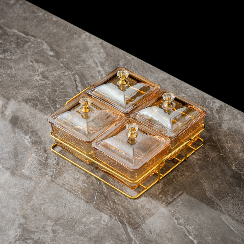 four-compartment amber hammered plastic dish + square-ear metal frame + lid