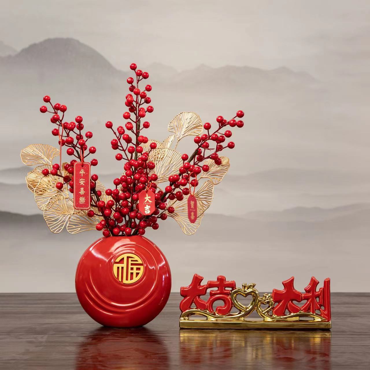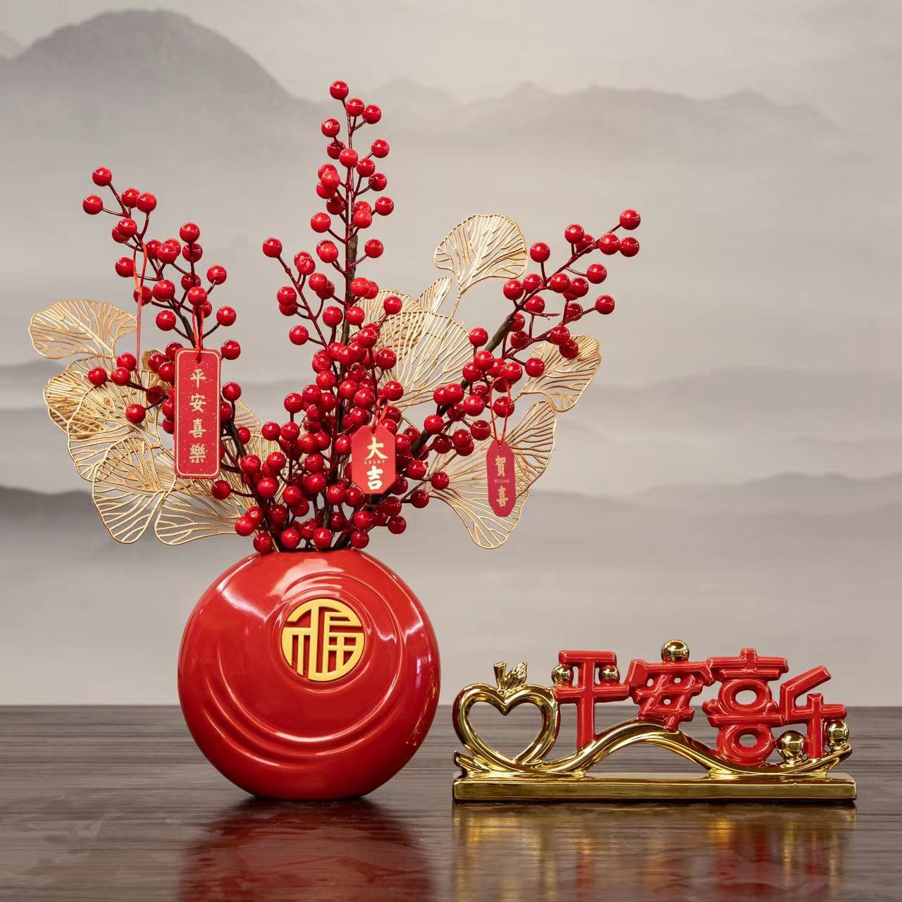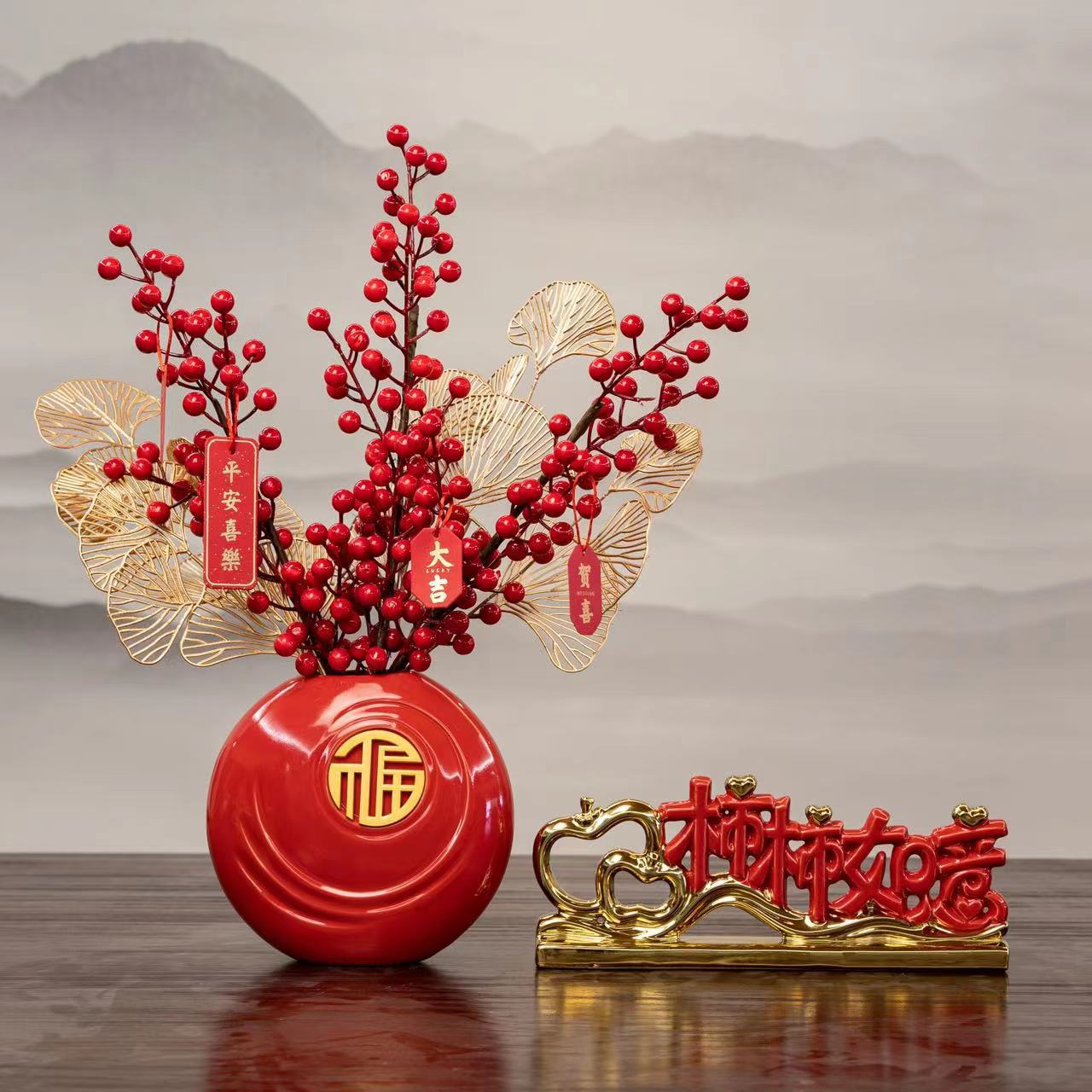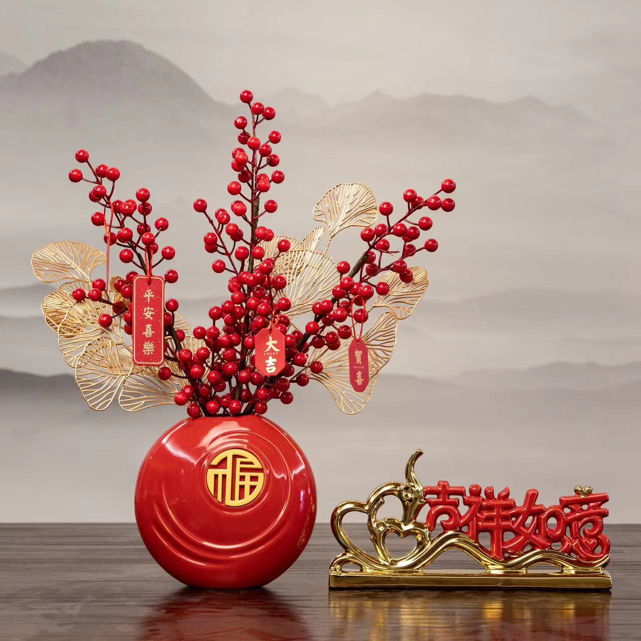 peace joy + vase + chinese hawthorn, good luck + vase + red