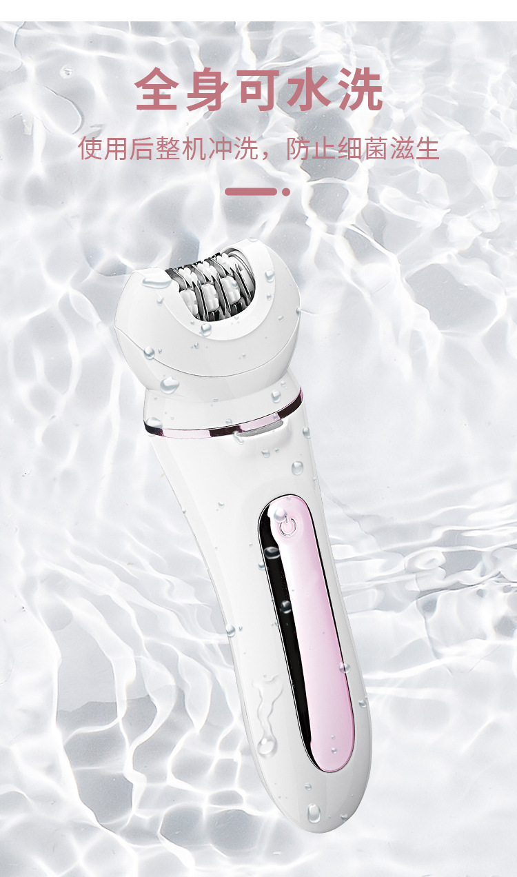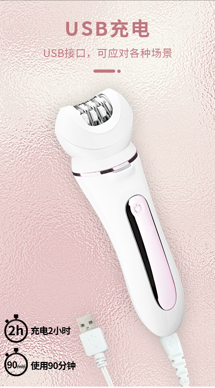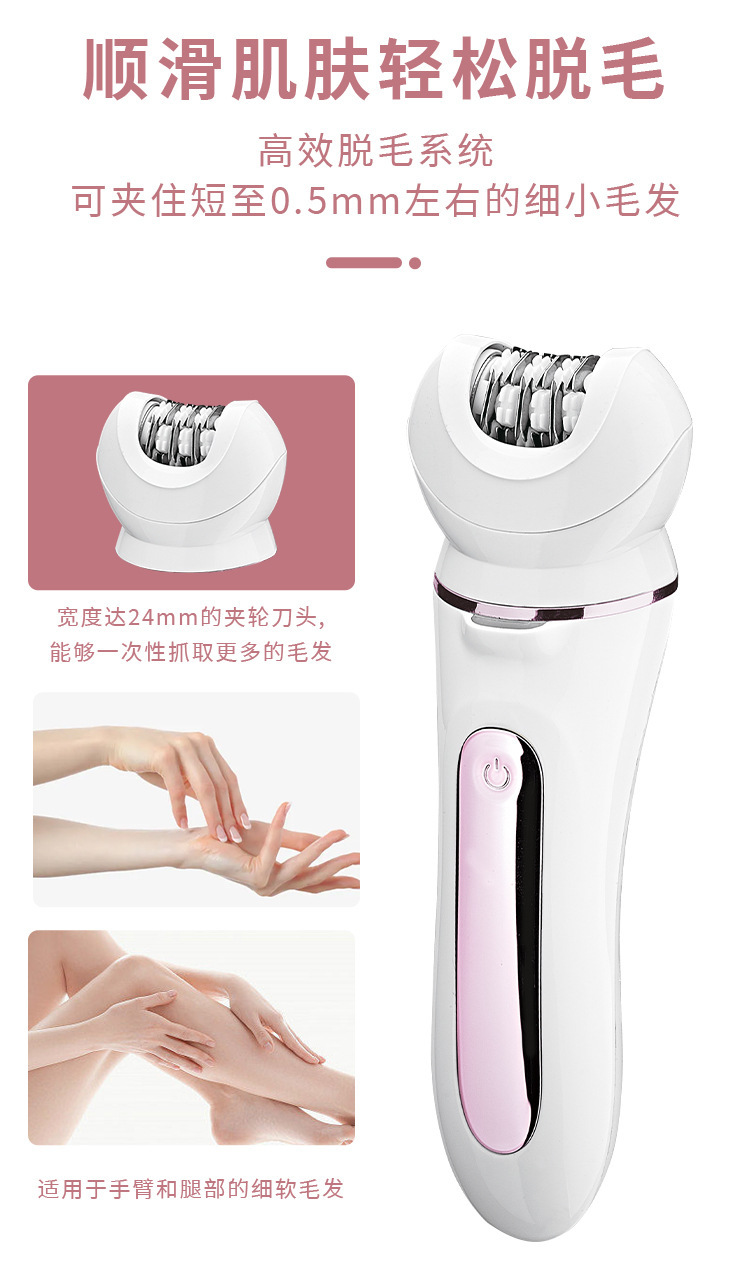 Set configuration: hair removal device, hair removal device cover, shaver, skin polisher, massage head, facial cleanser, charging base, USB cable, cleaning brush.
