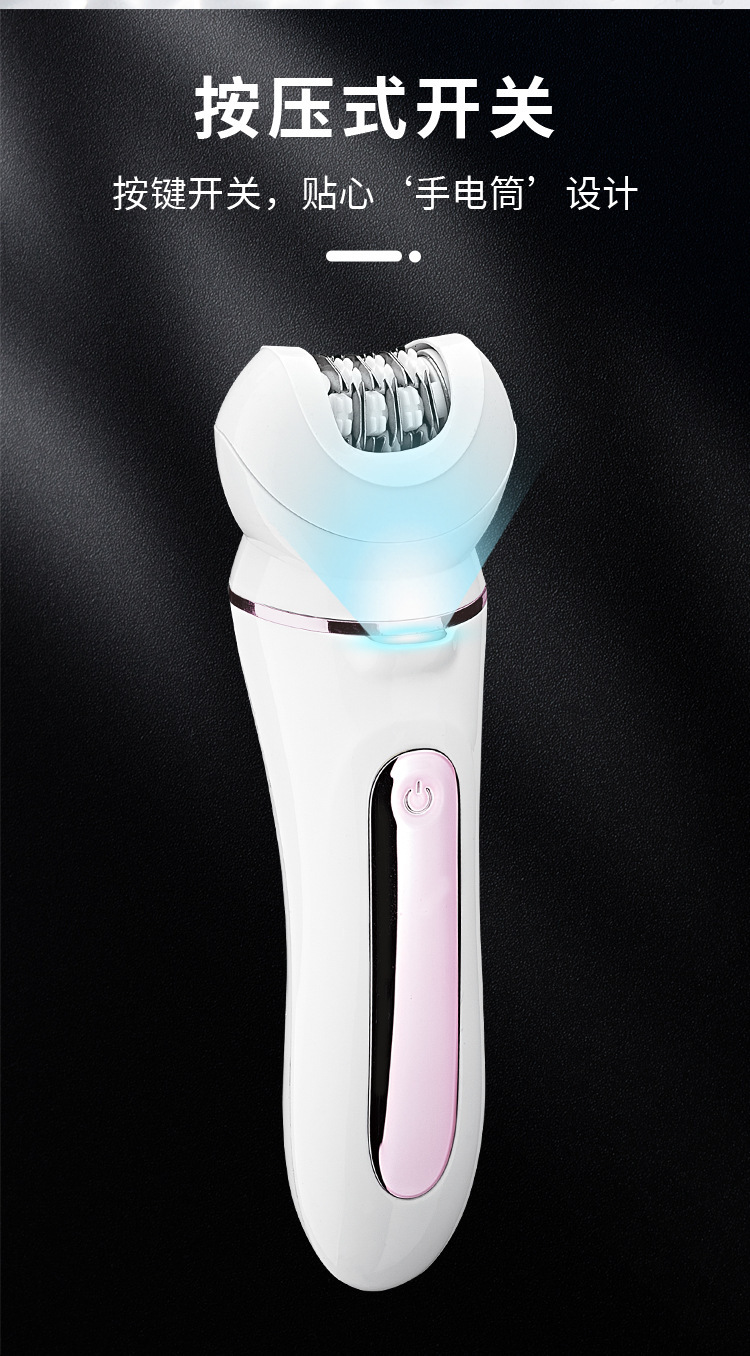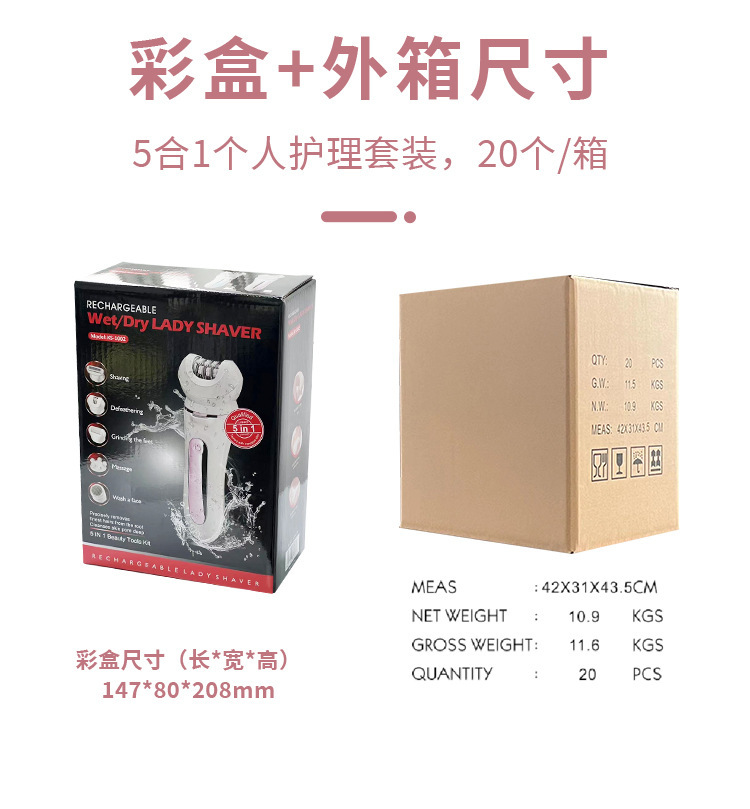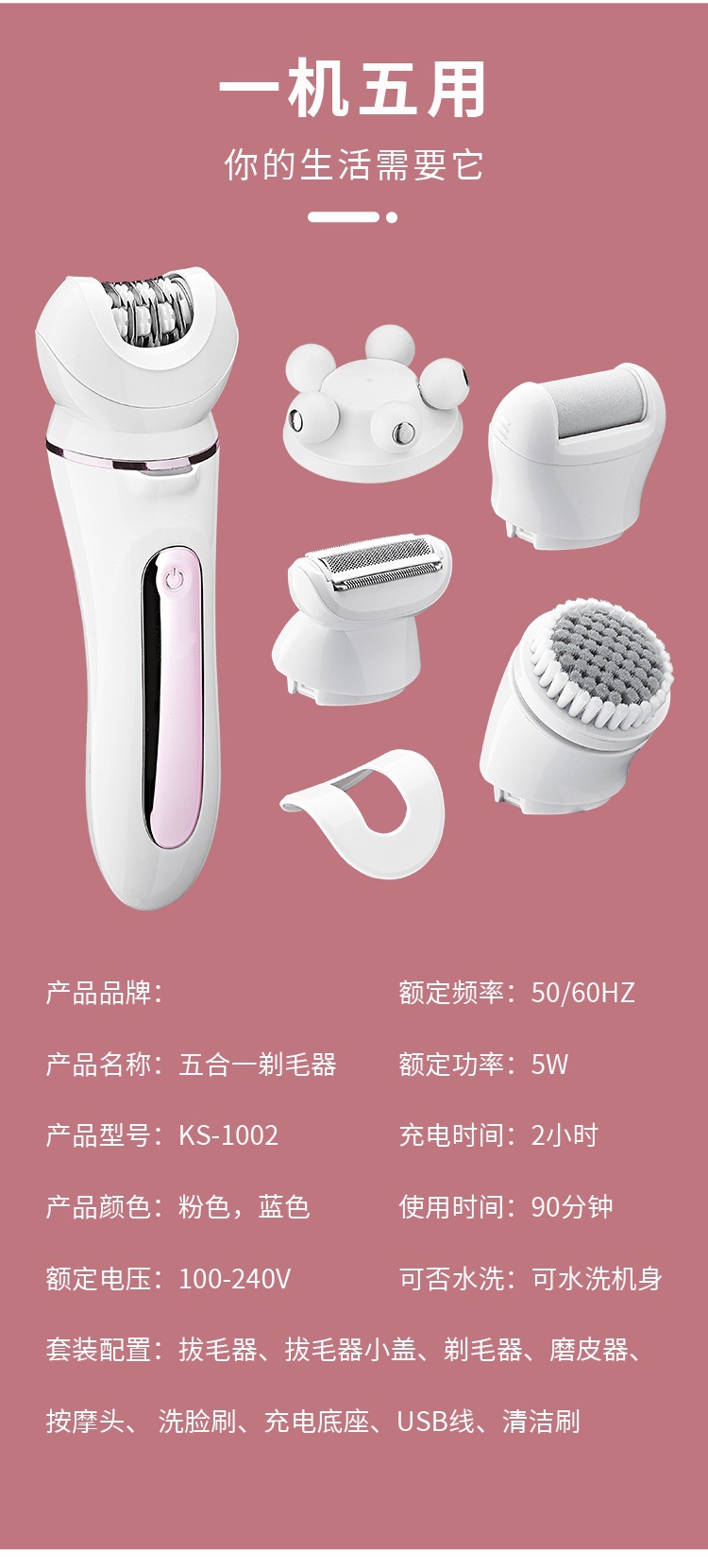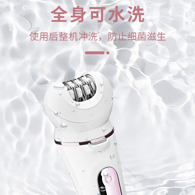 Set configuration: hair removal device, hair removal device cover, shaver, skin polisher, massage head, facial cleanser, charging base, USB cable, cleaning brush.