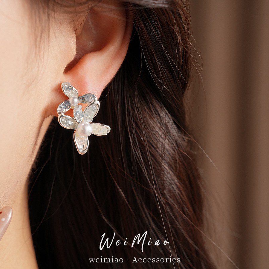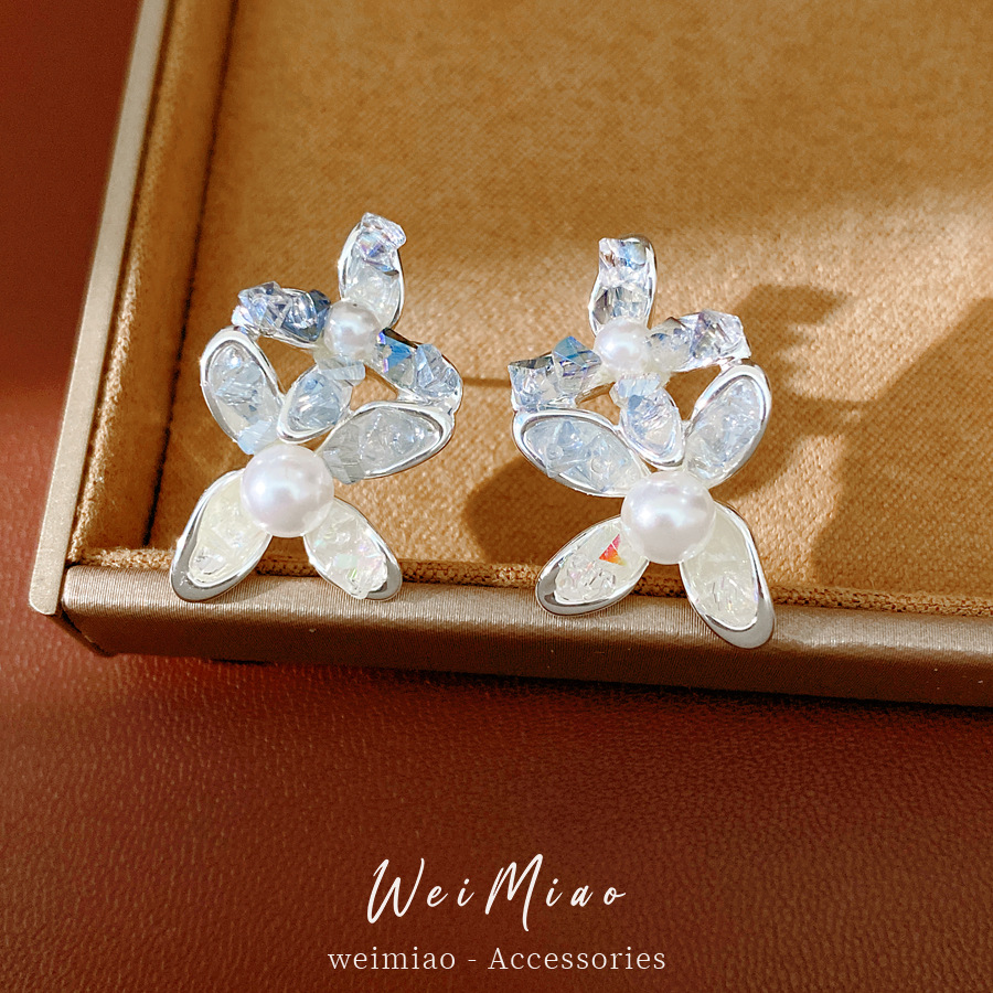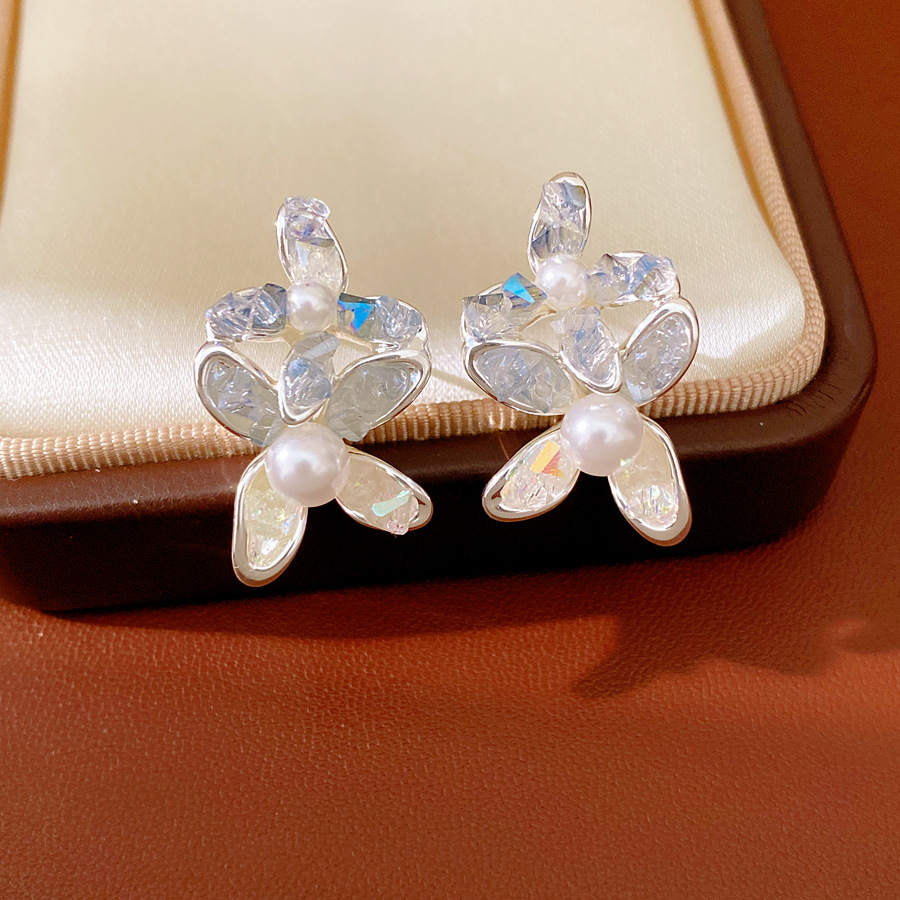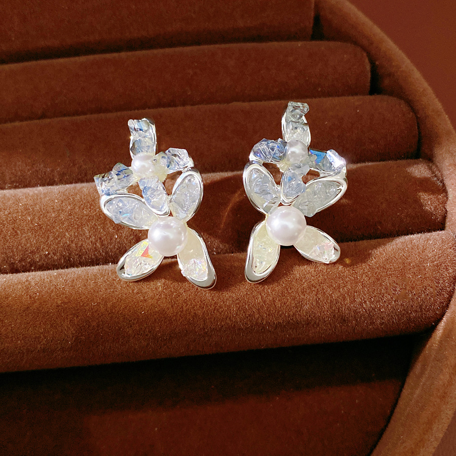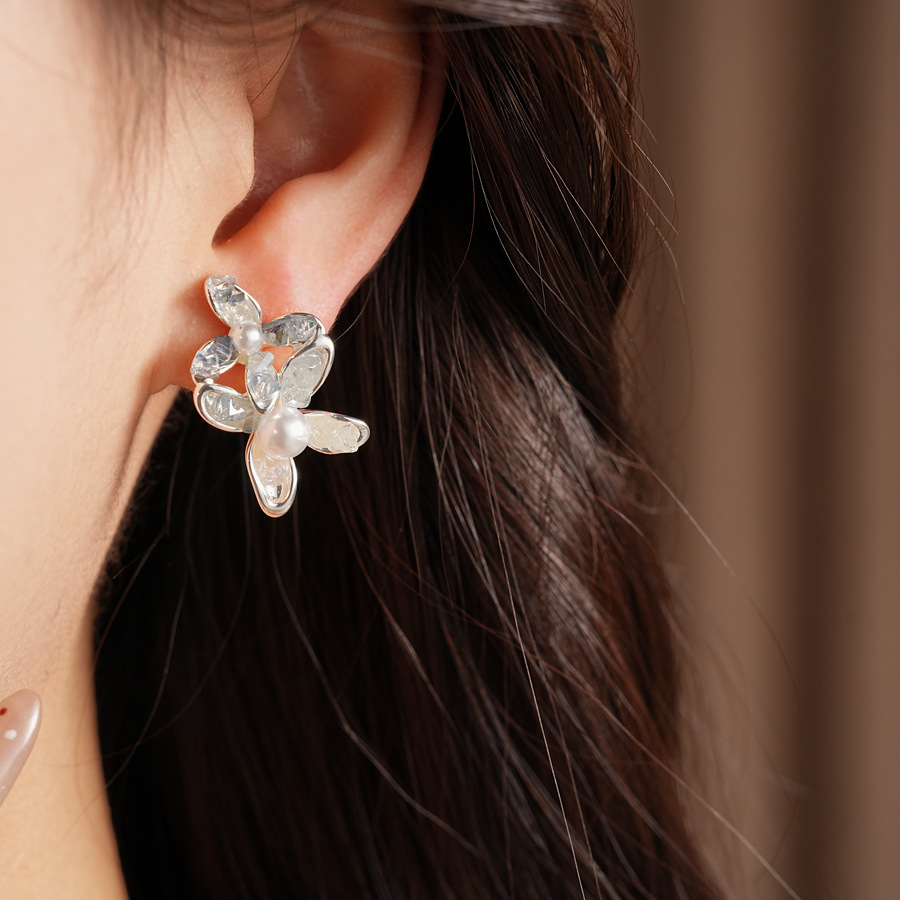 silver needle glass flower pearl stud earrings fresh sweet style beautiful fashion earrings light luxury high-grade earrings wholesale