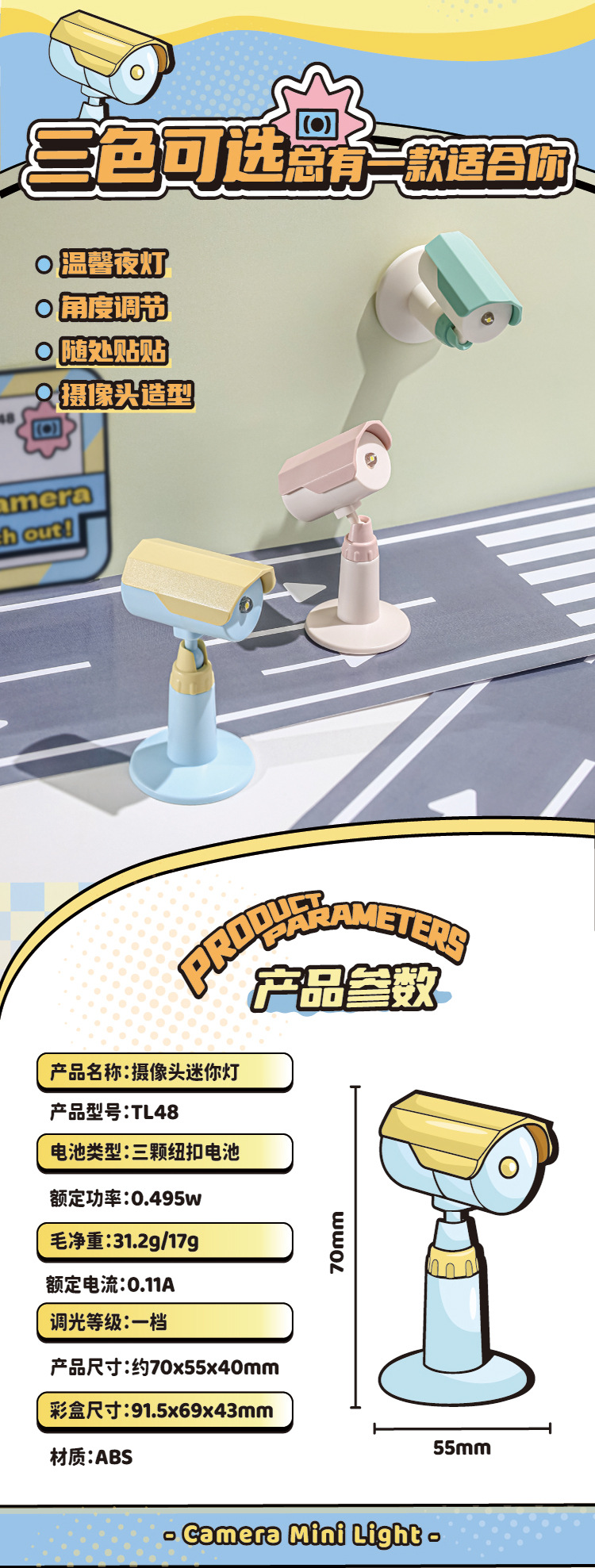 light color: white and green camera light, blue and yellow camera light, pink camera light