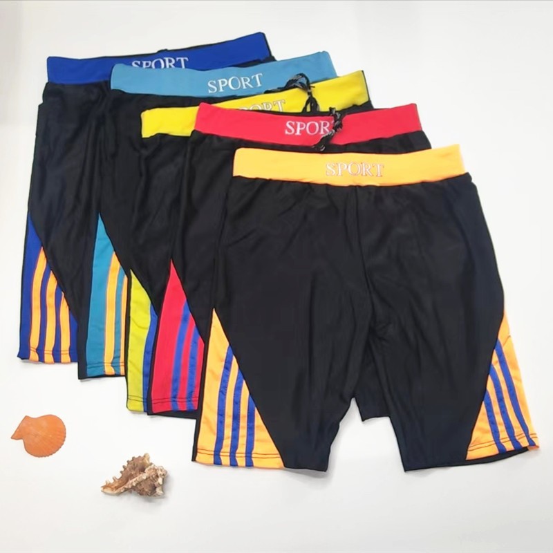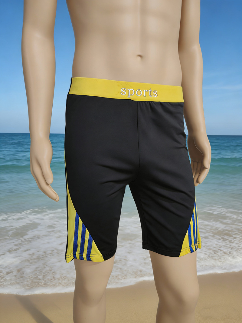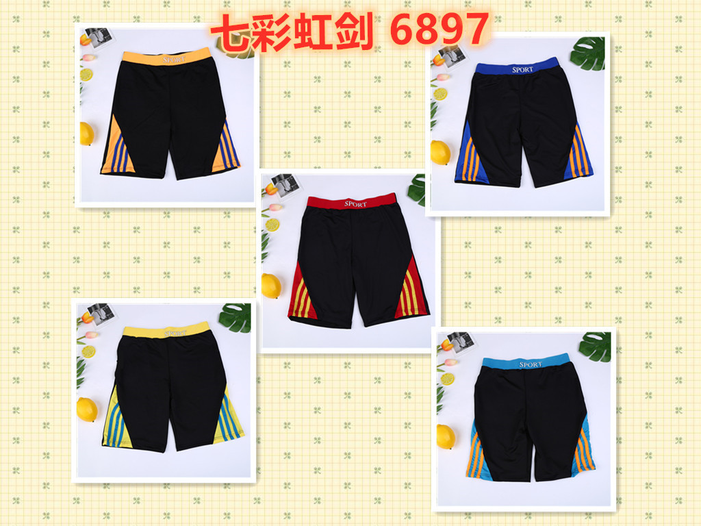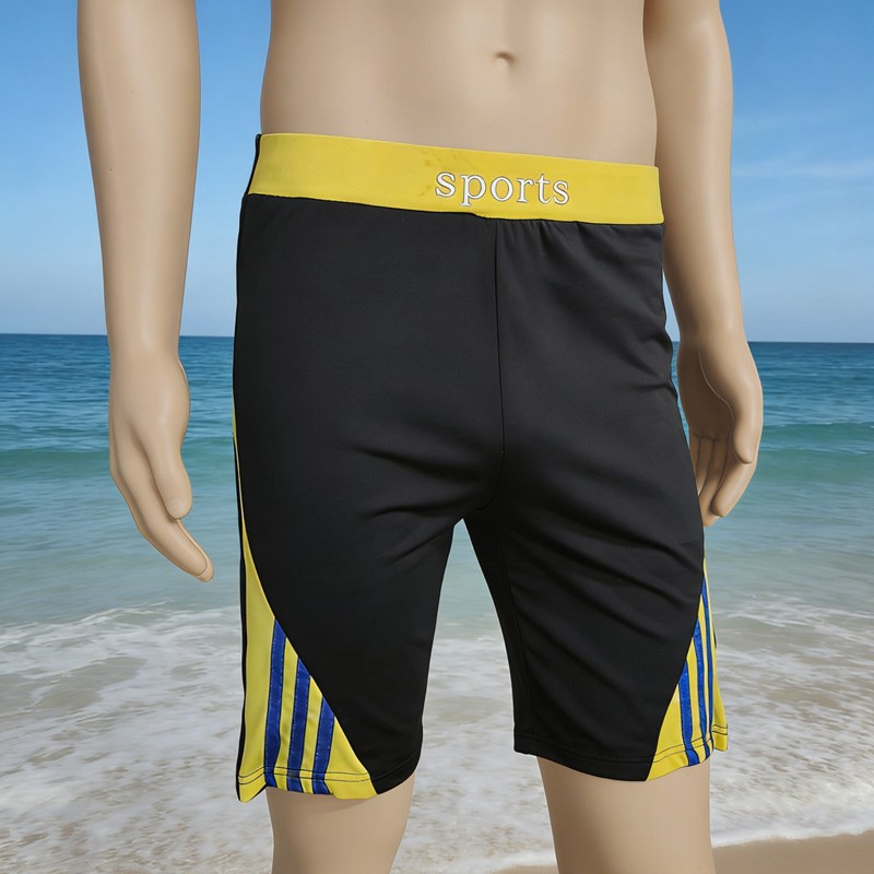 主体为黑色,腰头是彩色并印SPORTS 整体设计偏向休闲运动与游泳場景. 裤腿两侧的拼接设计.视觉上更具动感.