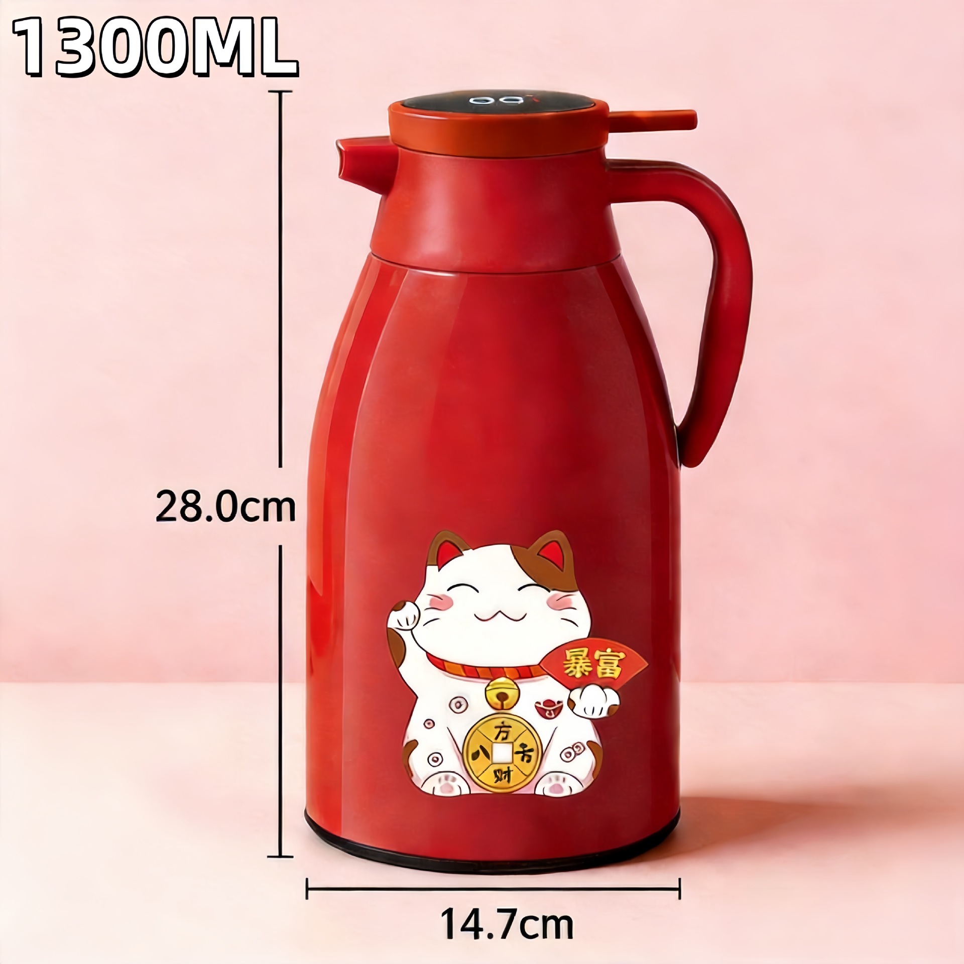 red 1.3l digital display thermal flask + lucky cat sticker