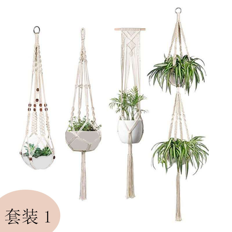 cross-border temu hanging flower pot net pocket cotton string four-piece set decorative wall hangings gardening balcony plant hanging bag
