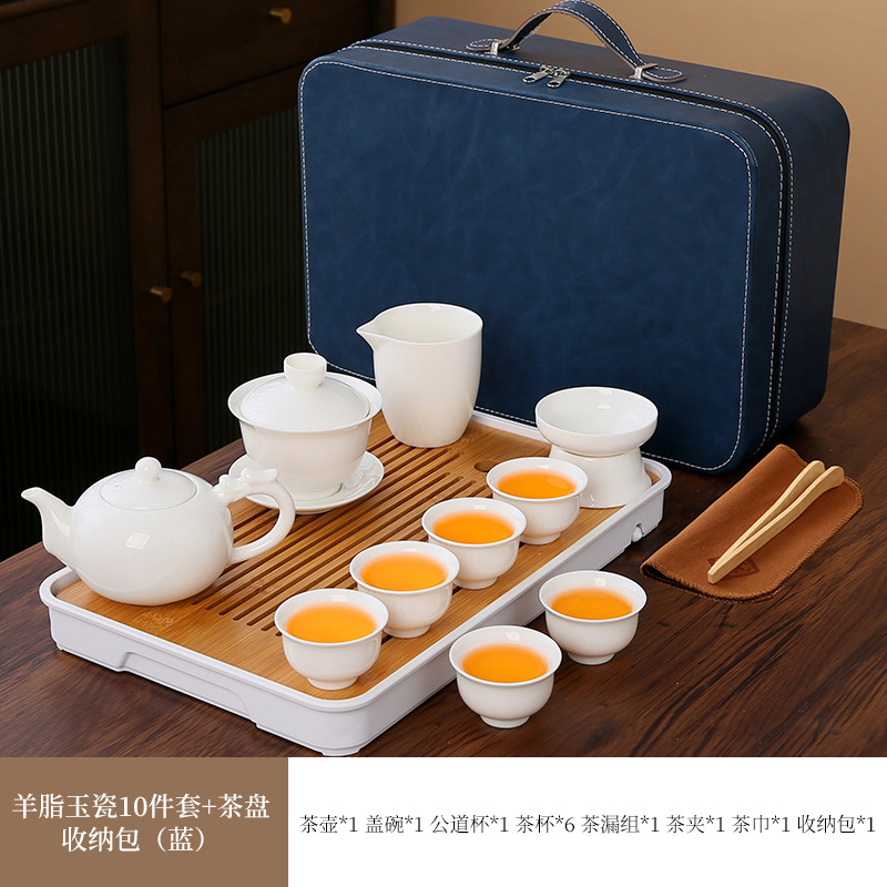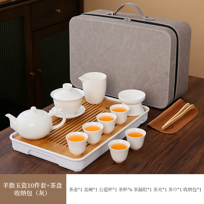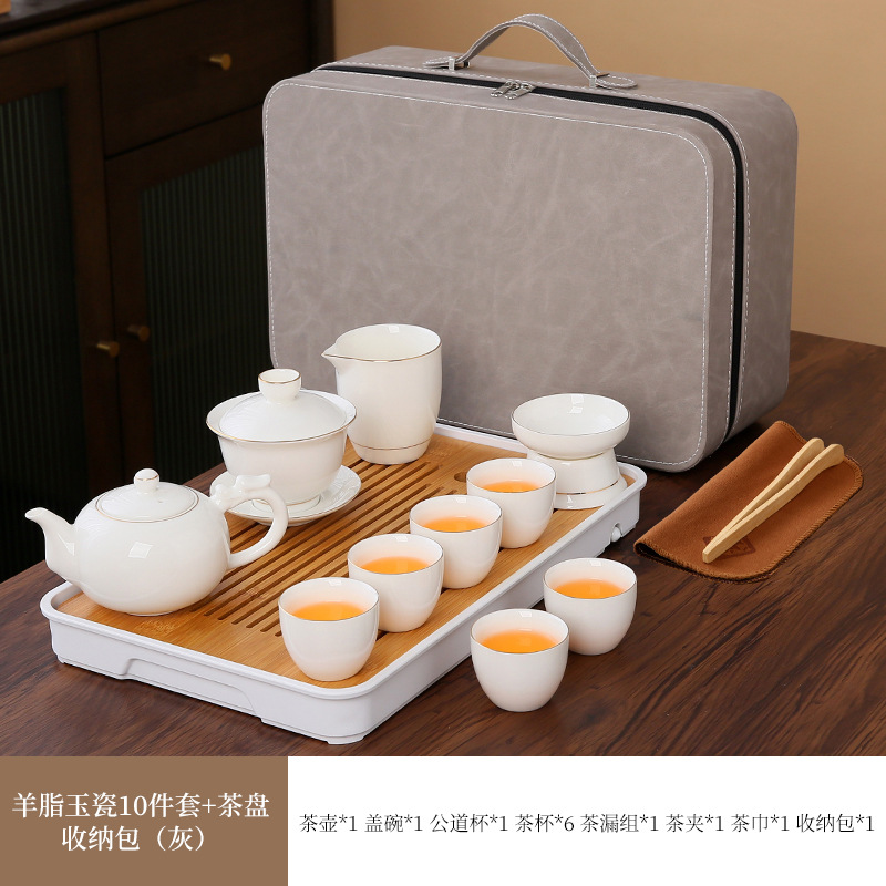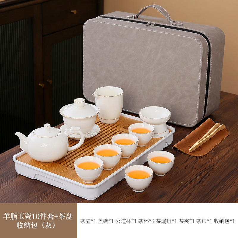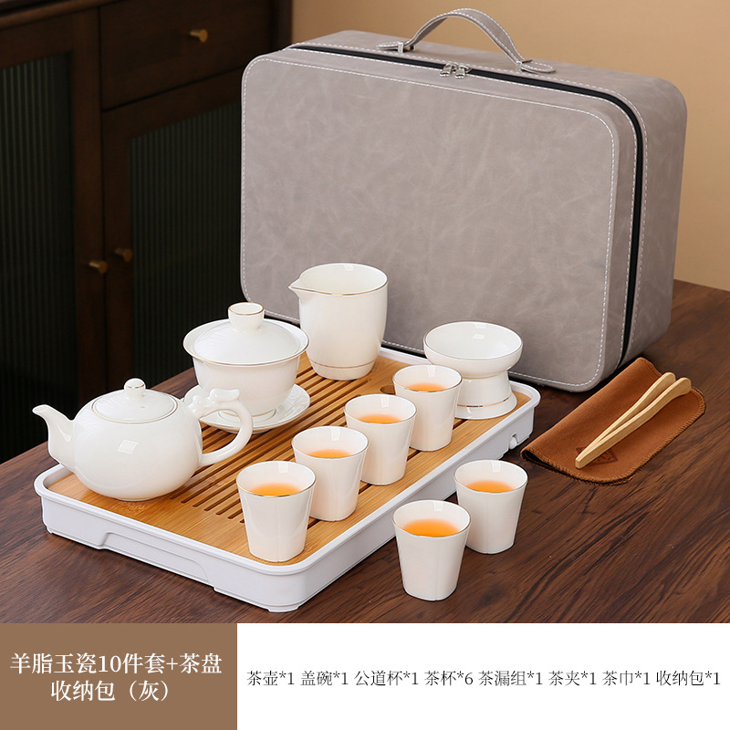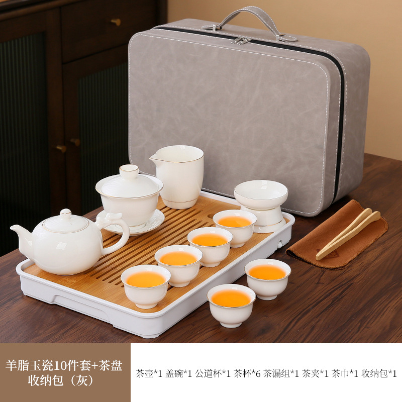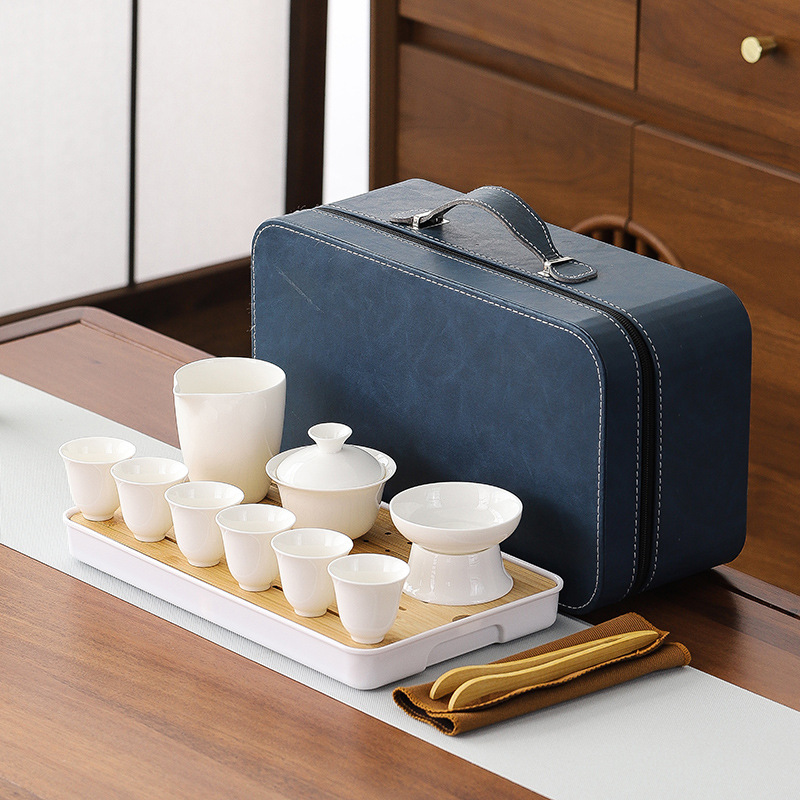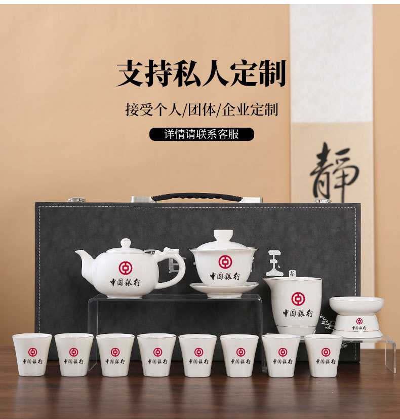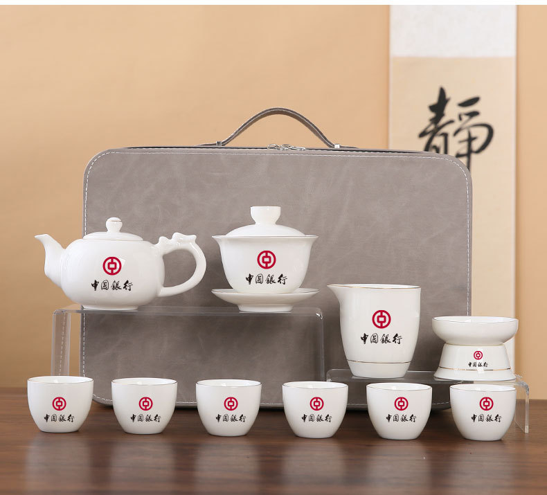 large leather bag 13-piece white jade tea cup with gold trimming (leather bag color to be noted)