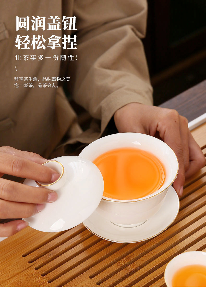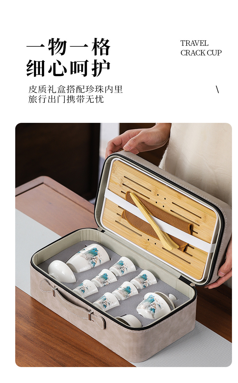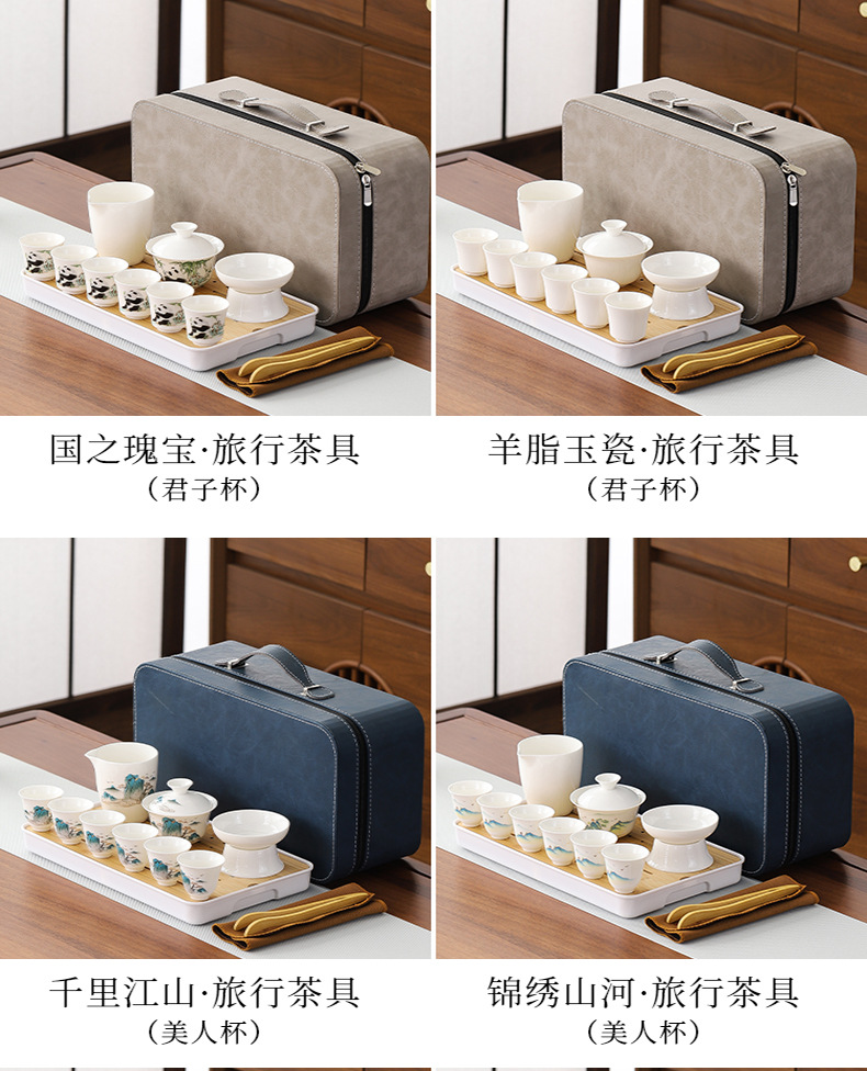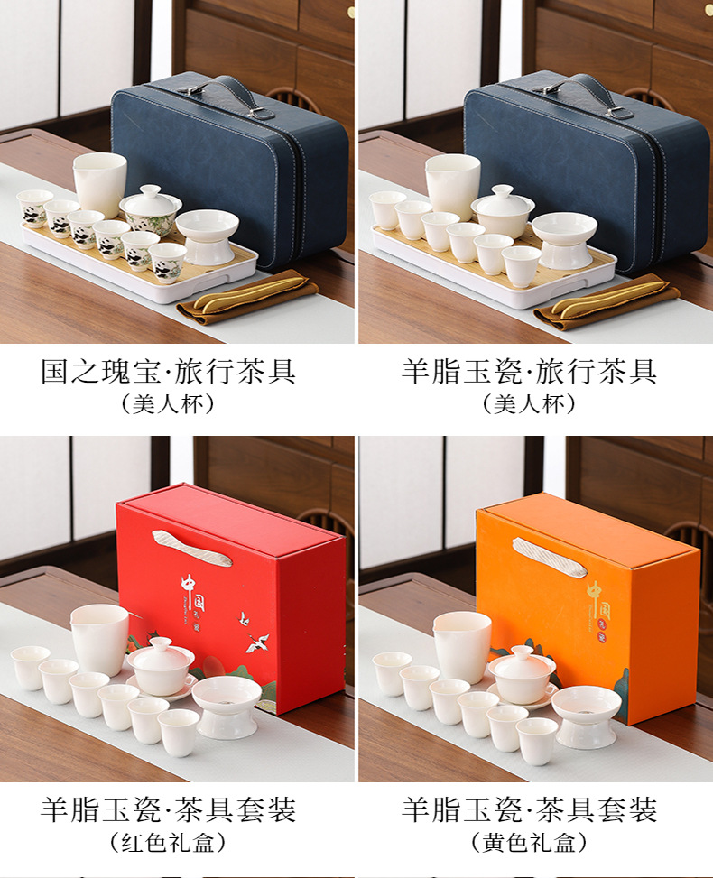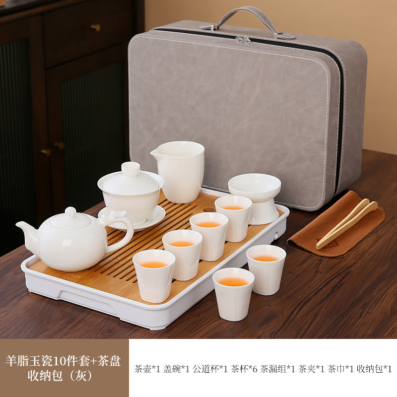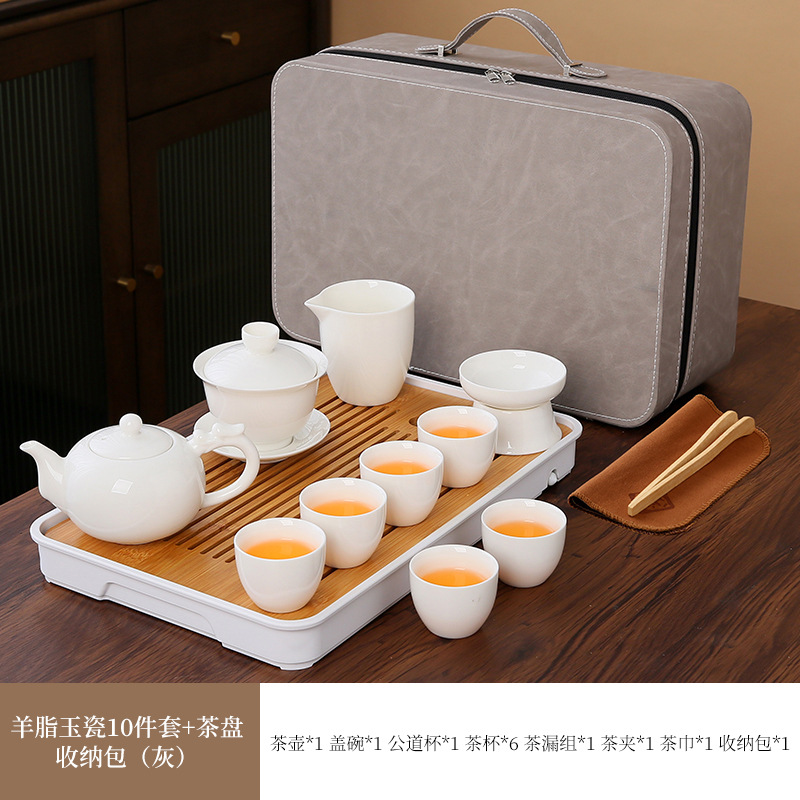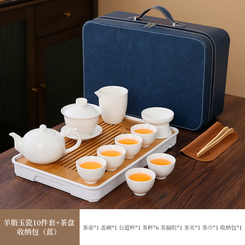 large leather bag 13-piece white jade tea cup with gold trimming (leather bag color to be noted)