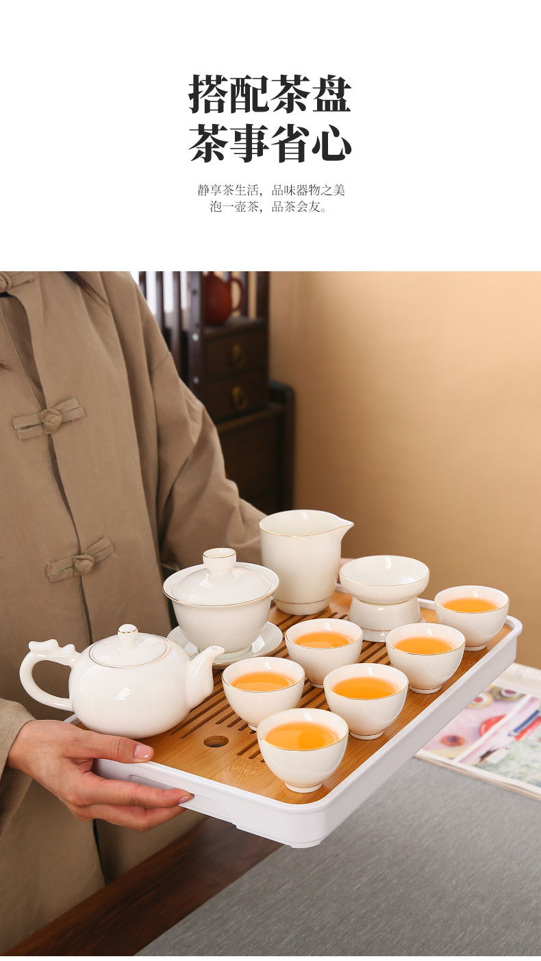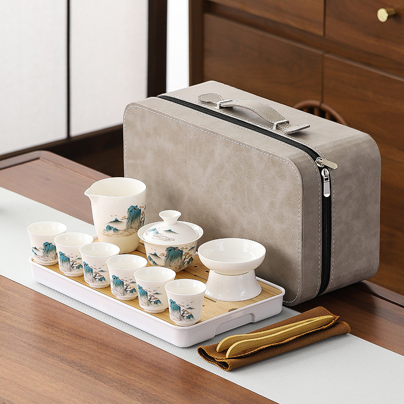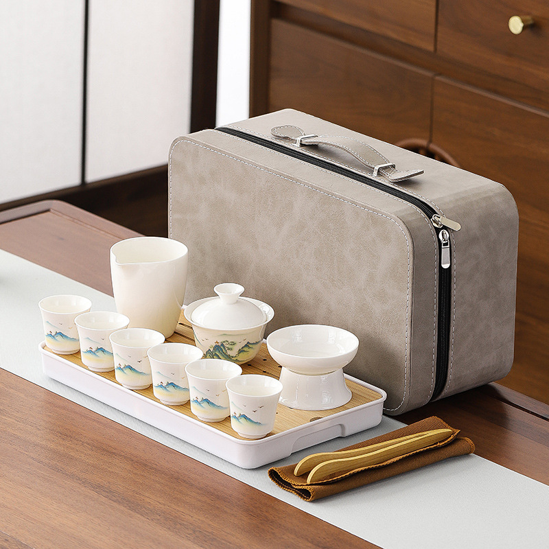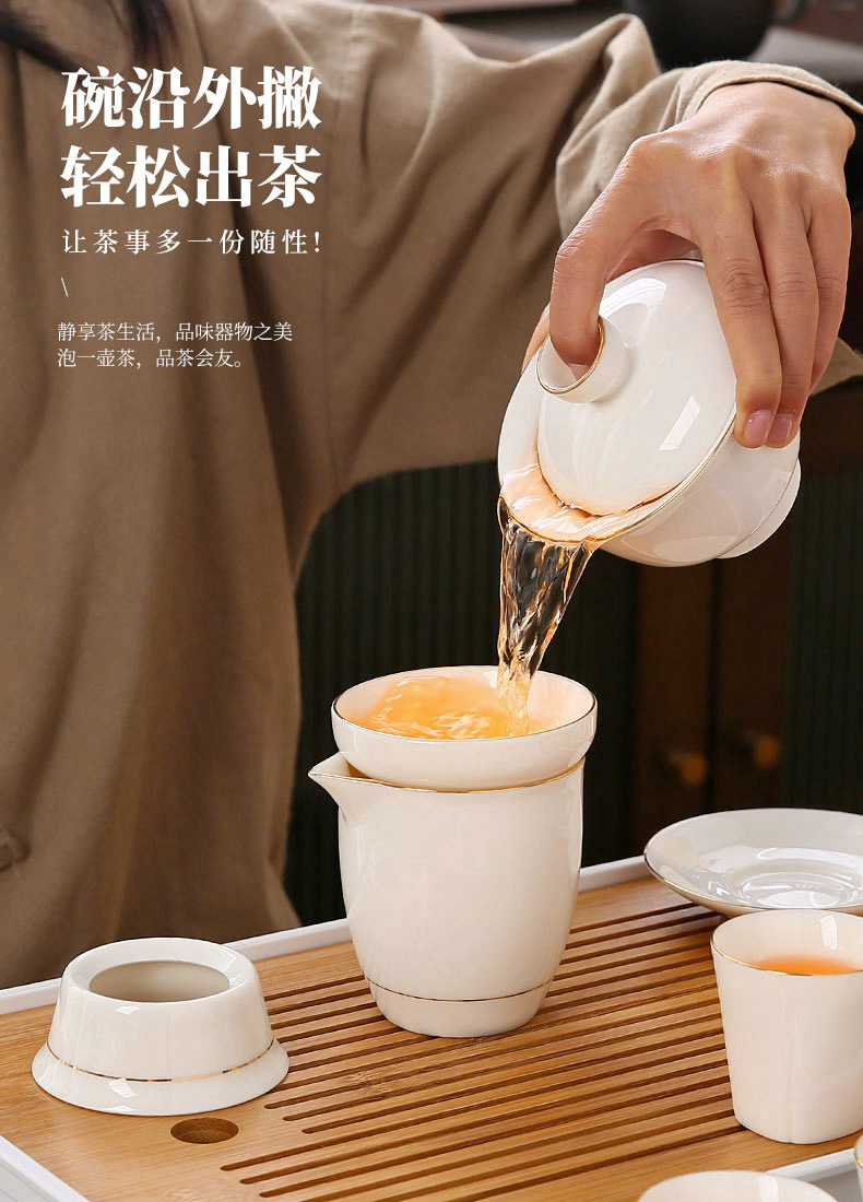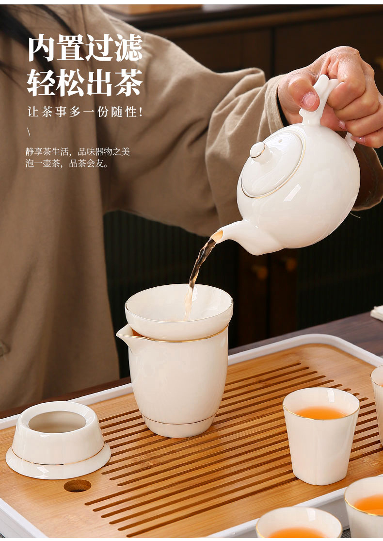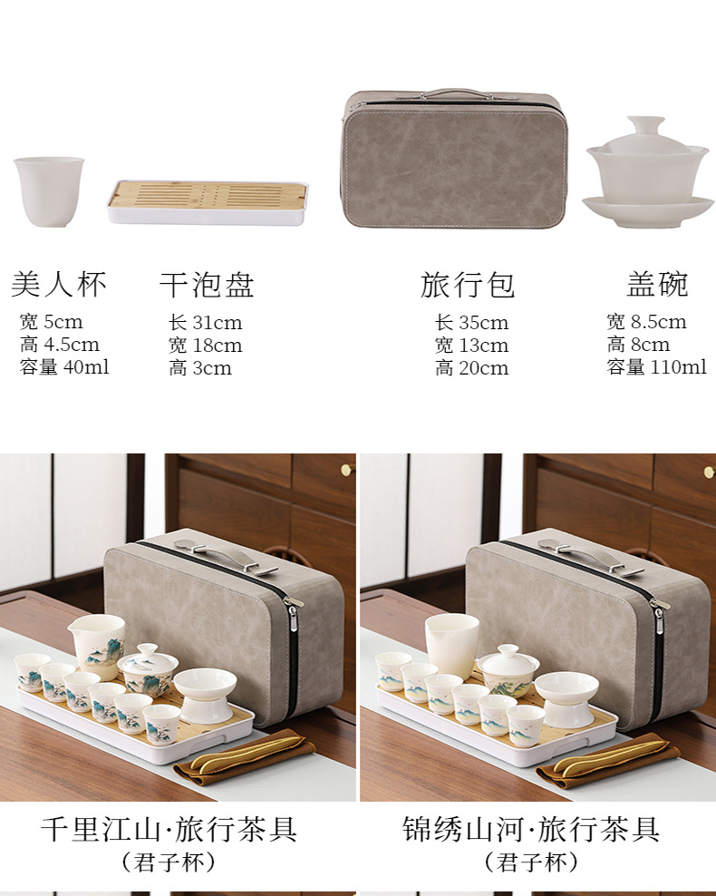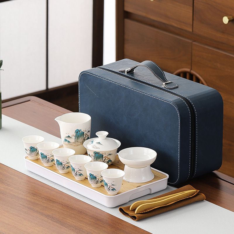 large leather bag 13-piece white jade tea cup with gold trimming (leather bag color to be noted)