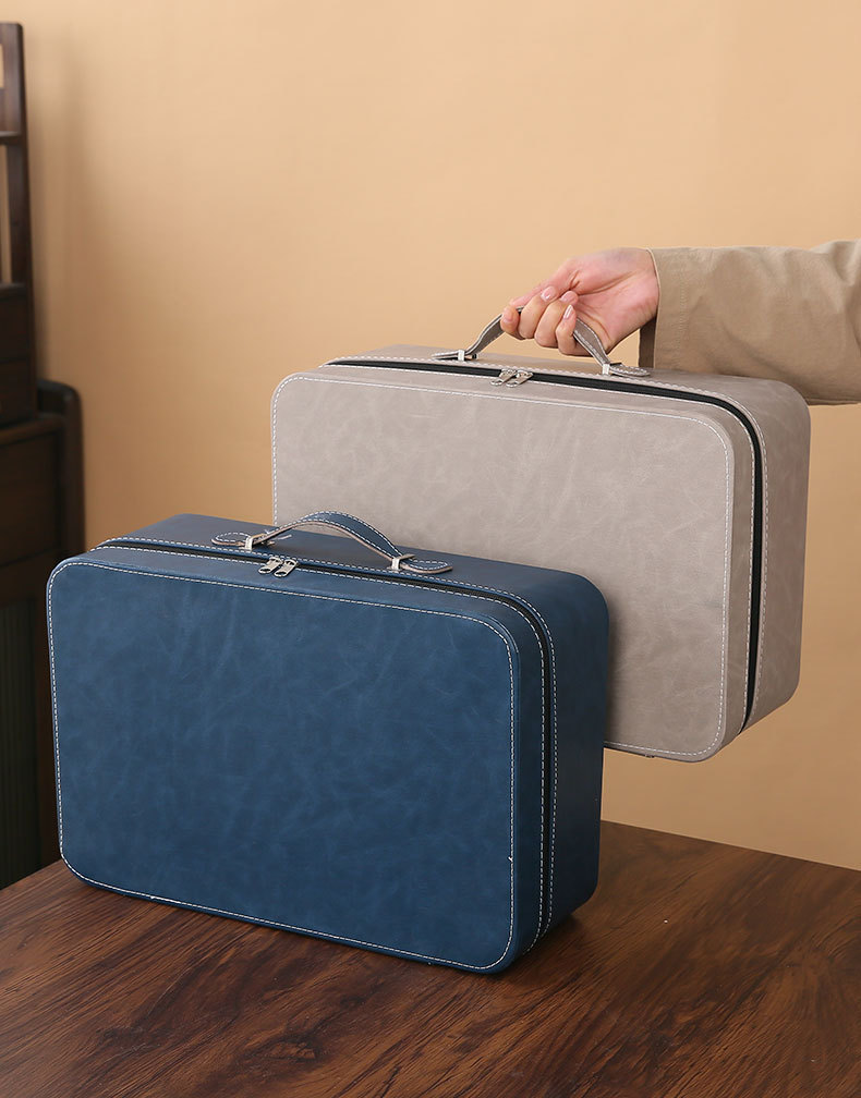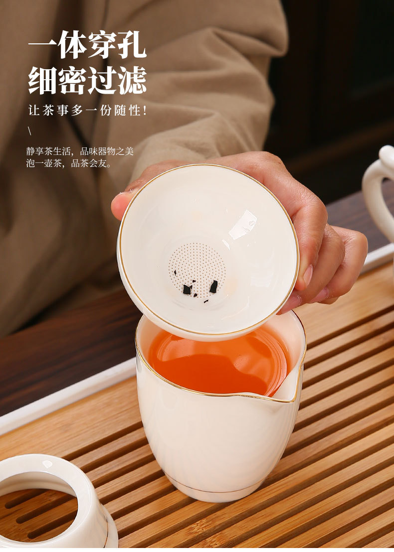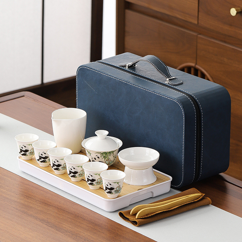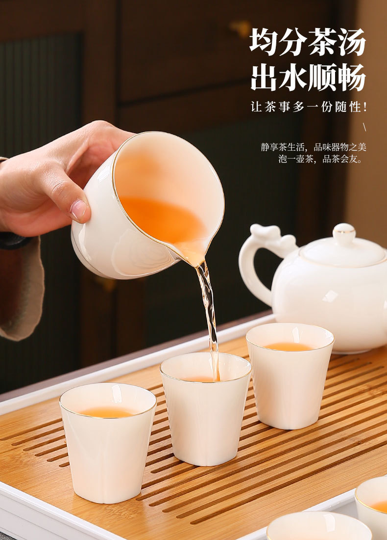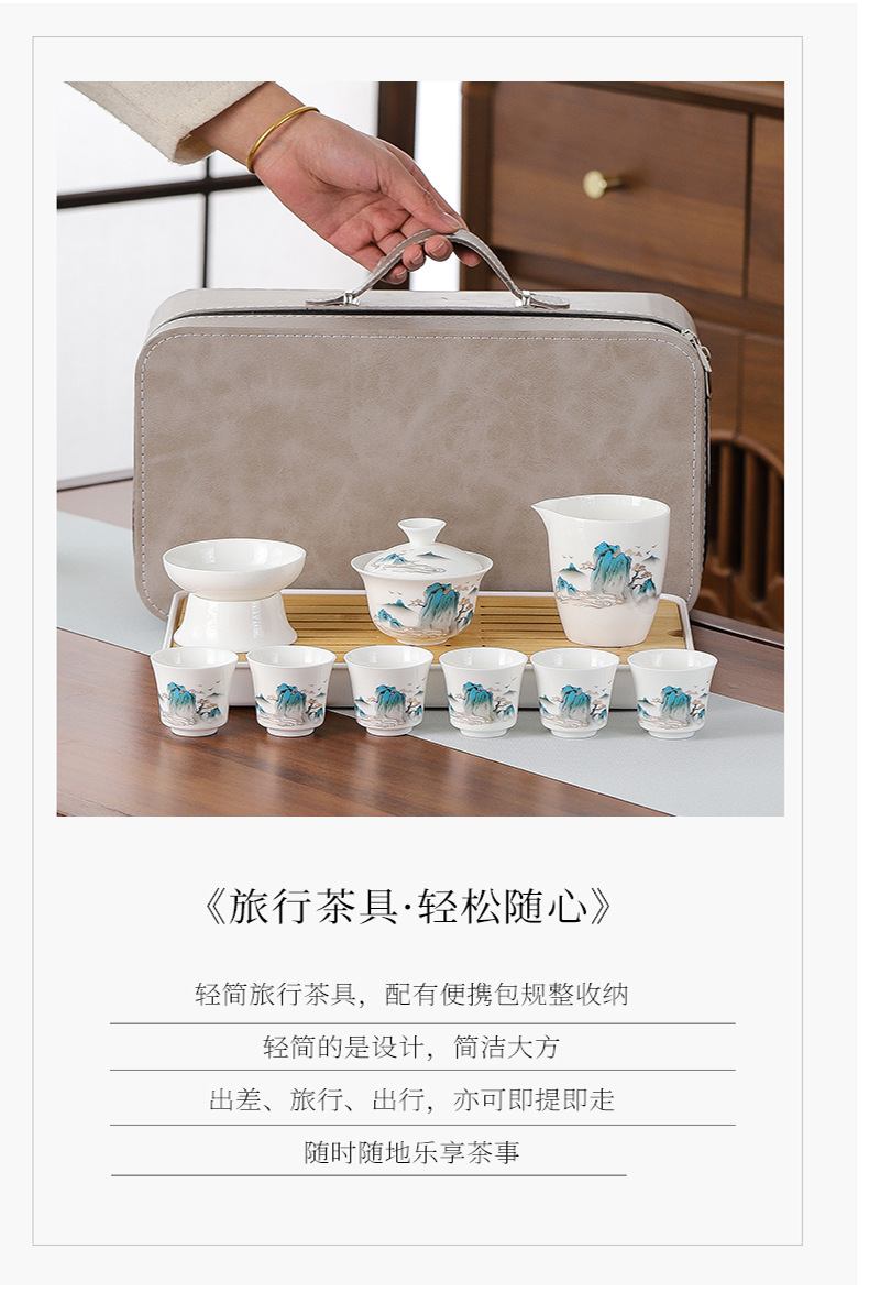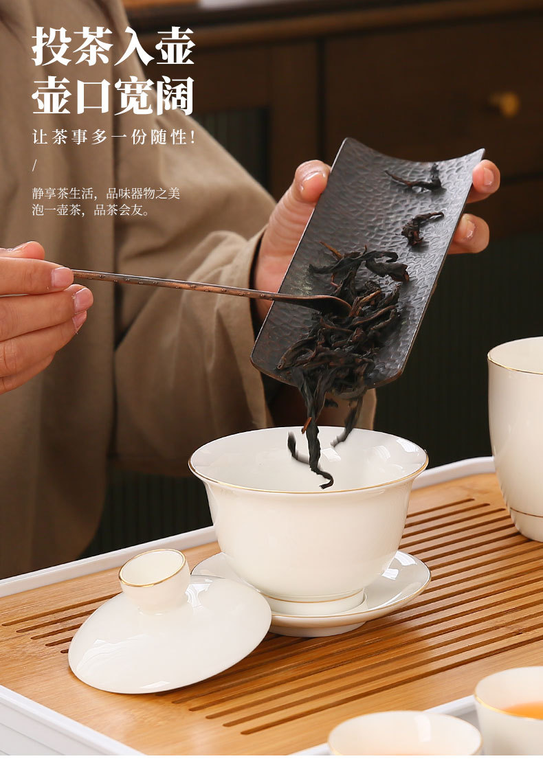large leather bag 13-piece white jade tea cup with gold trimming (leather bag color to be noted)