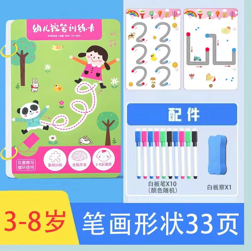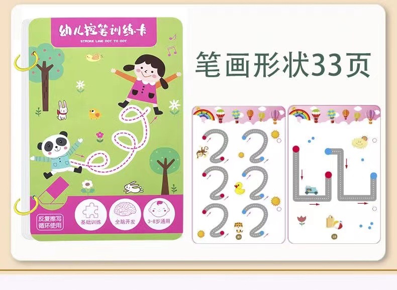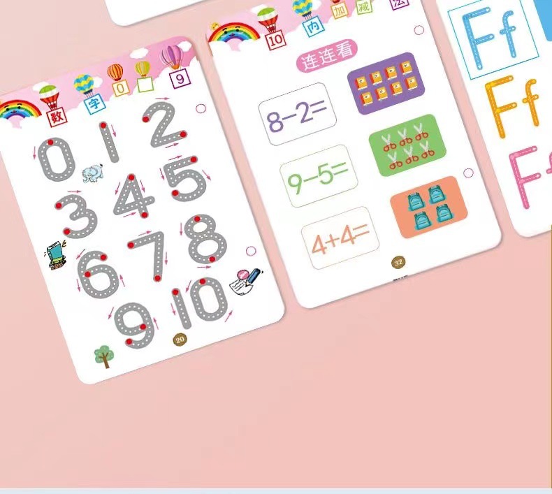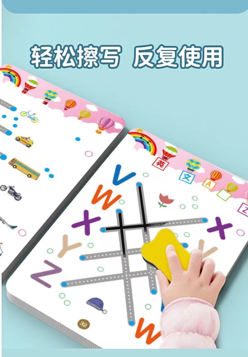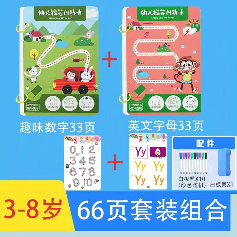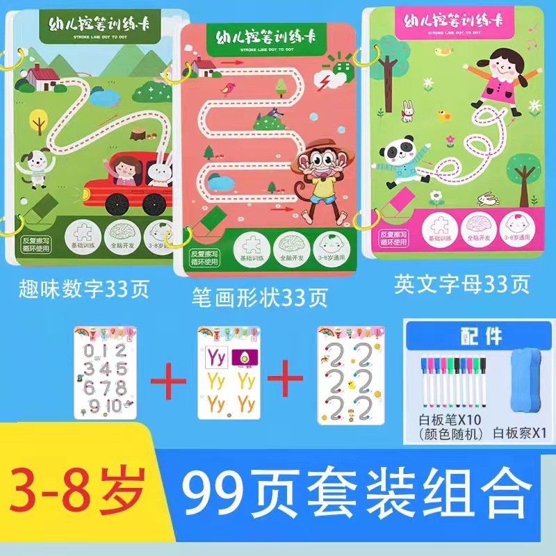 99 pages [numbers + letters + stroke order] complete 3-book set comes with 10 erasable pens.