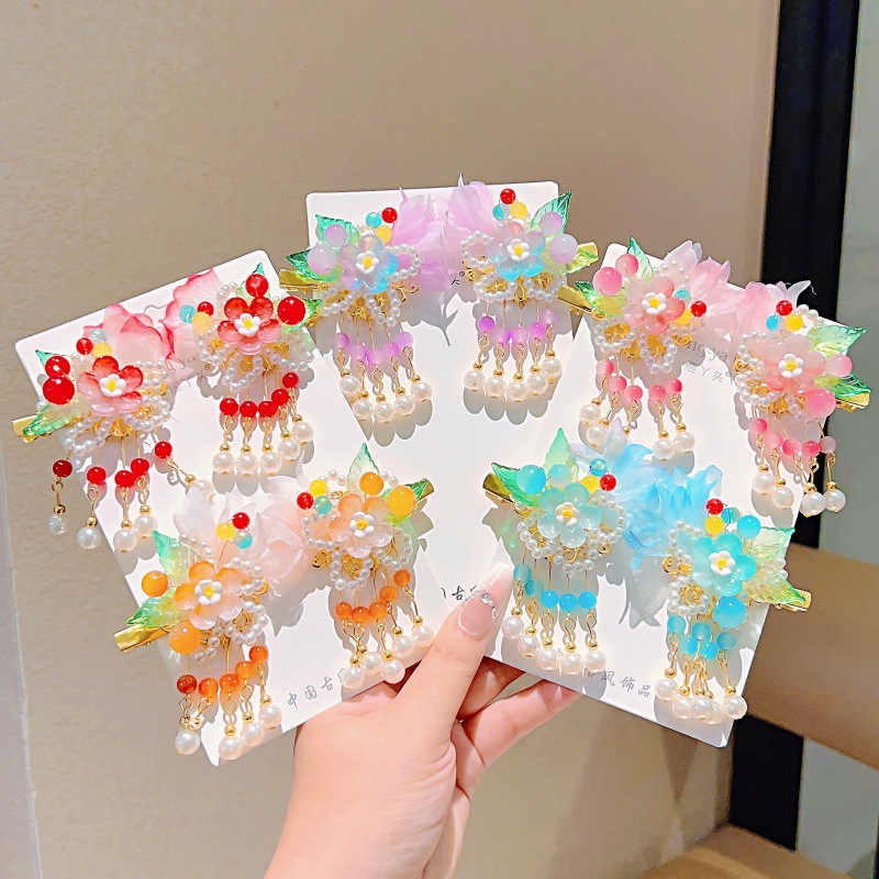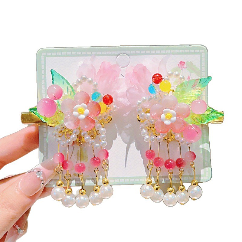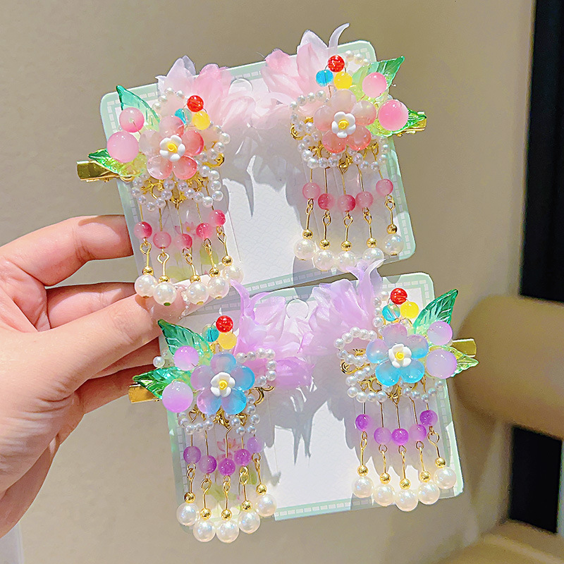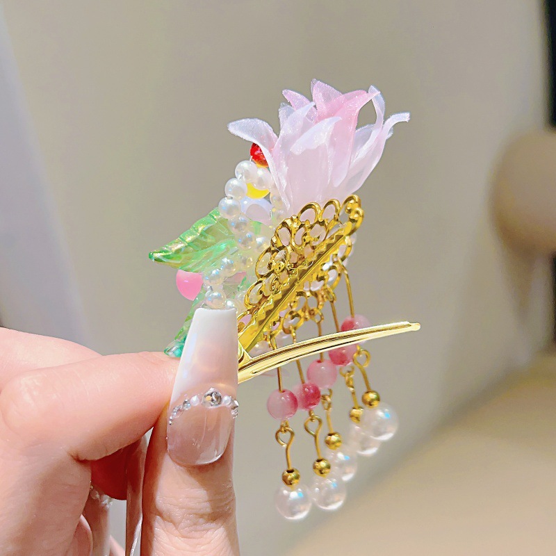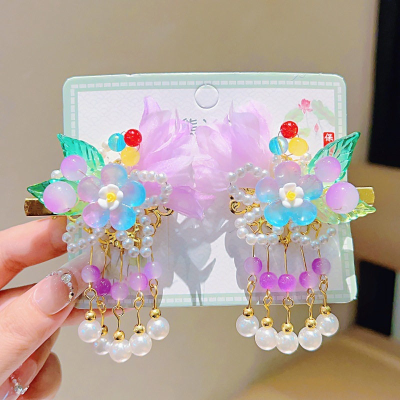 purple gauze flower with two leaves and five pearl pendants