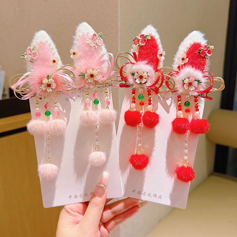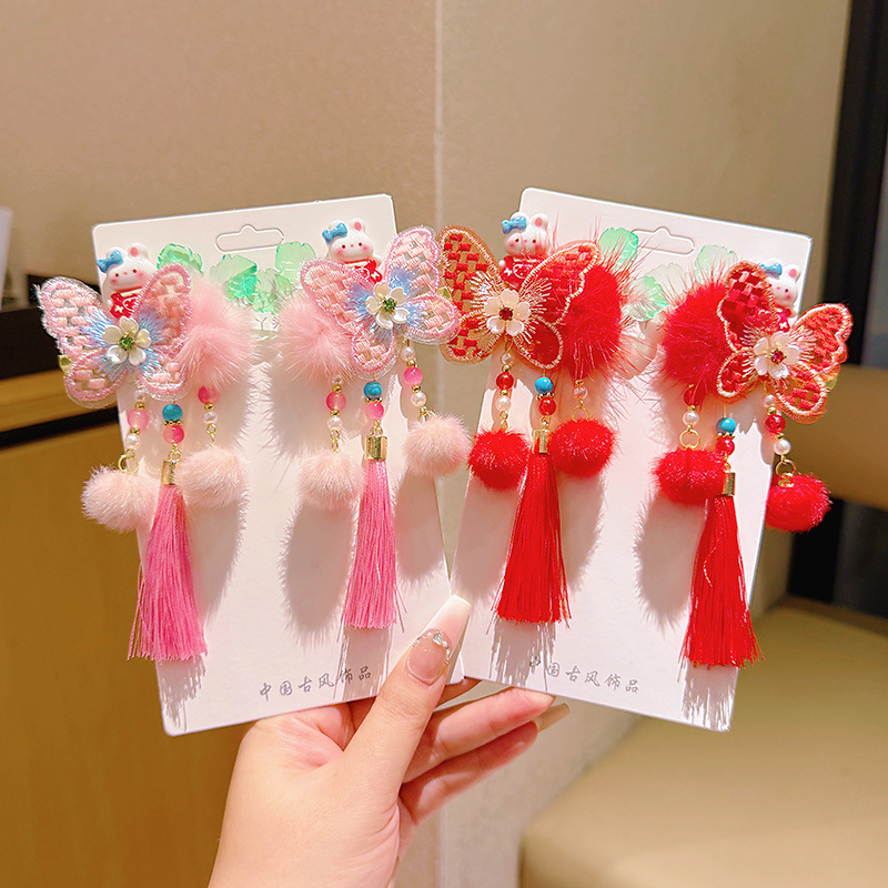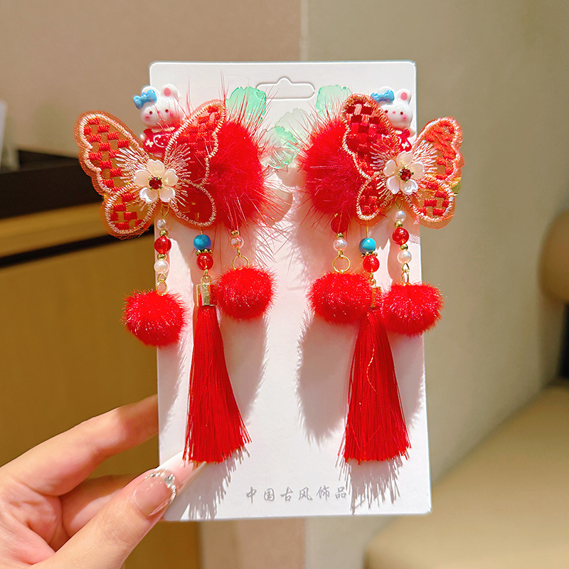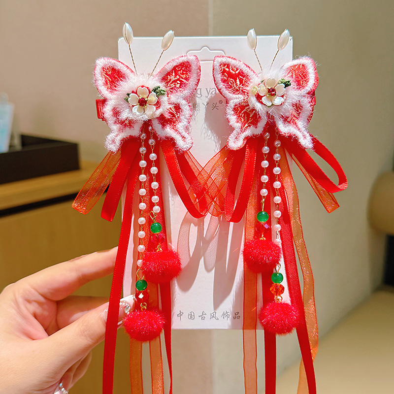 d1-2 red butterfly tassel rabbit a pair of hairclips