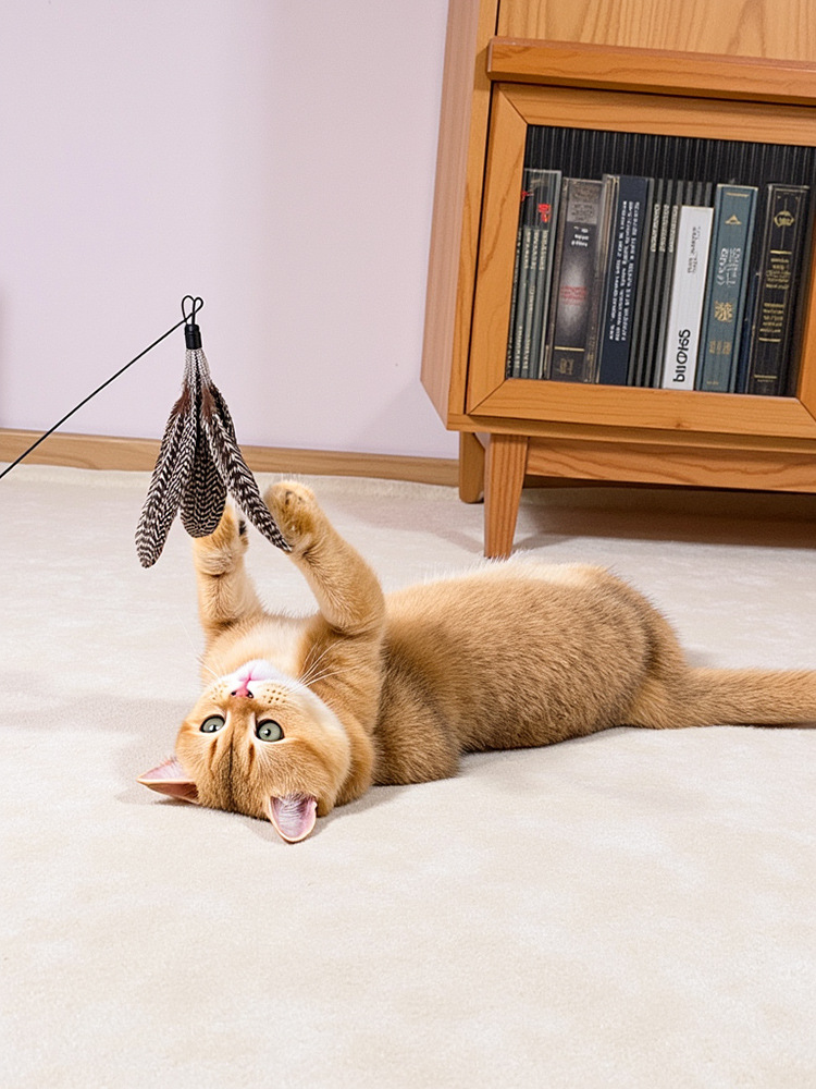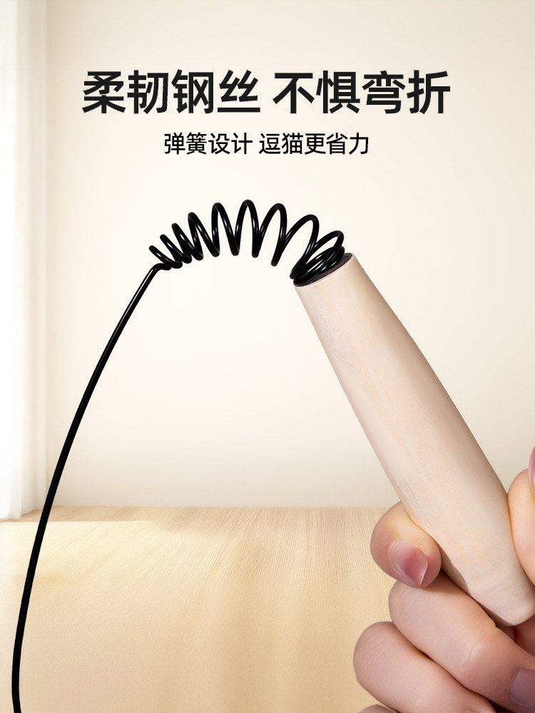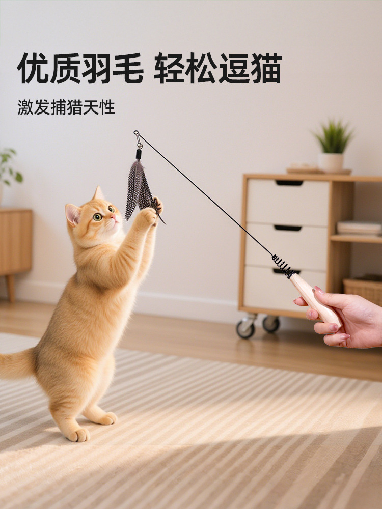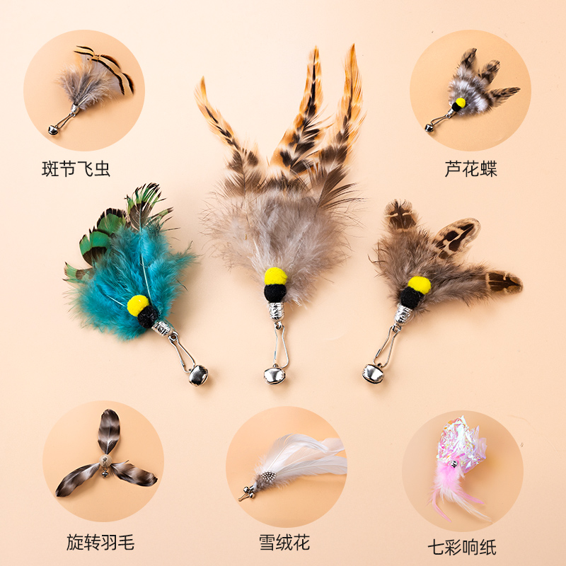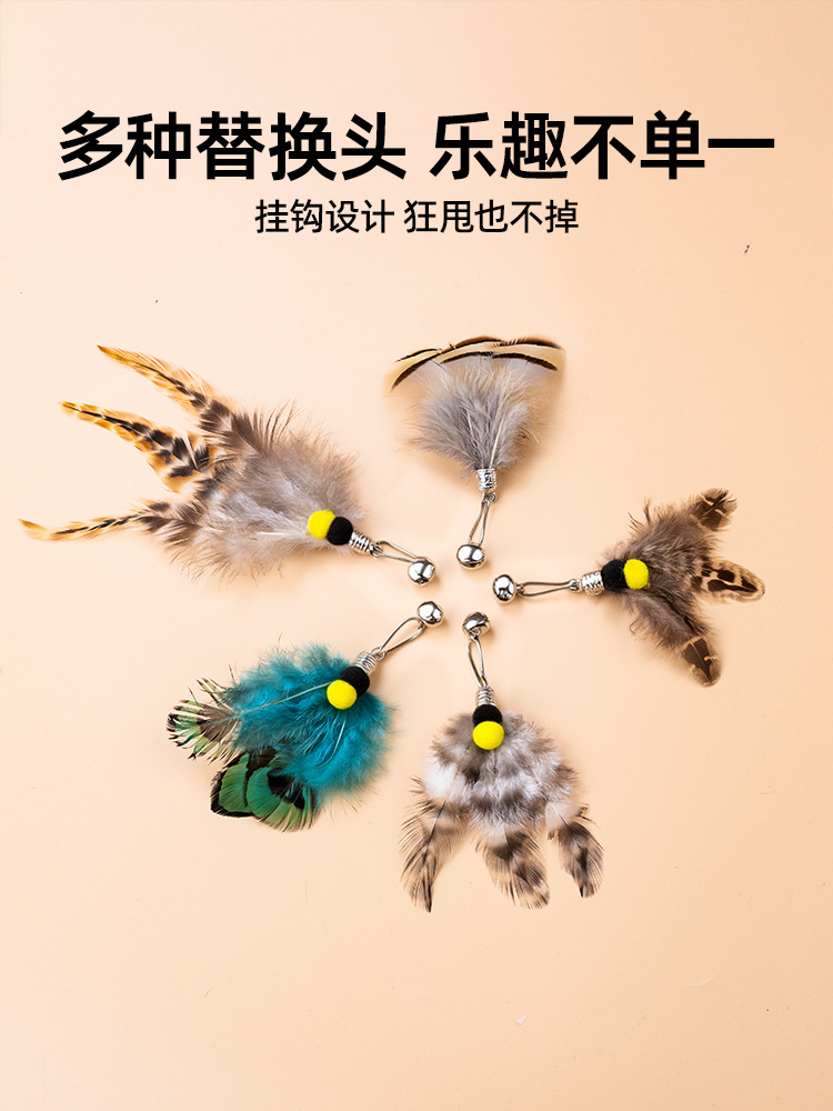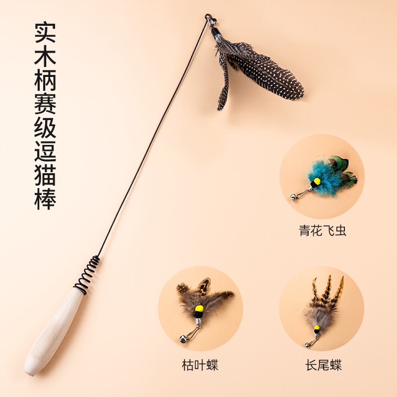 wooden handle cat teaser + white feather replacement head * 2 + rotating feather 4 heads in total