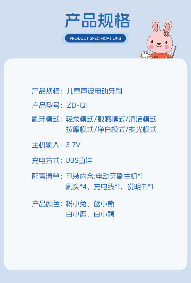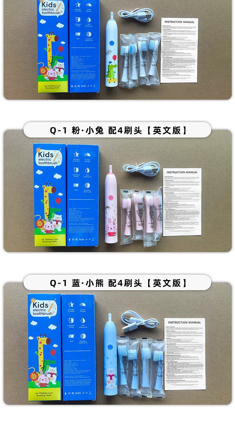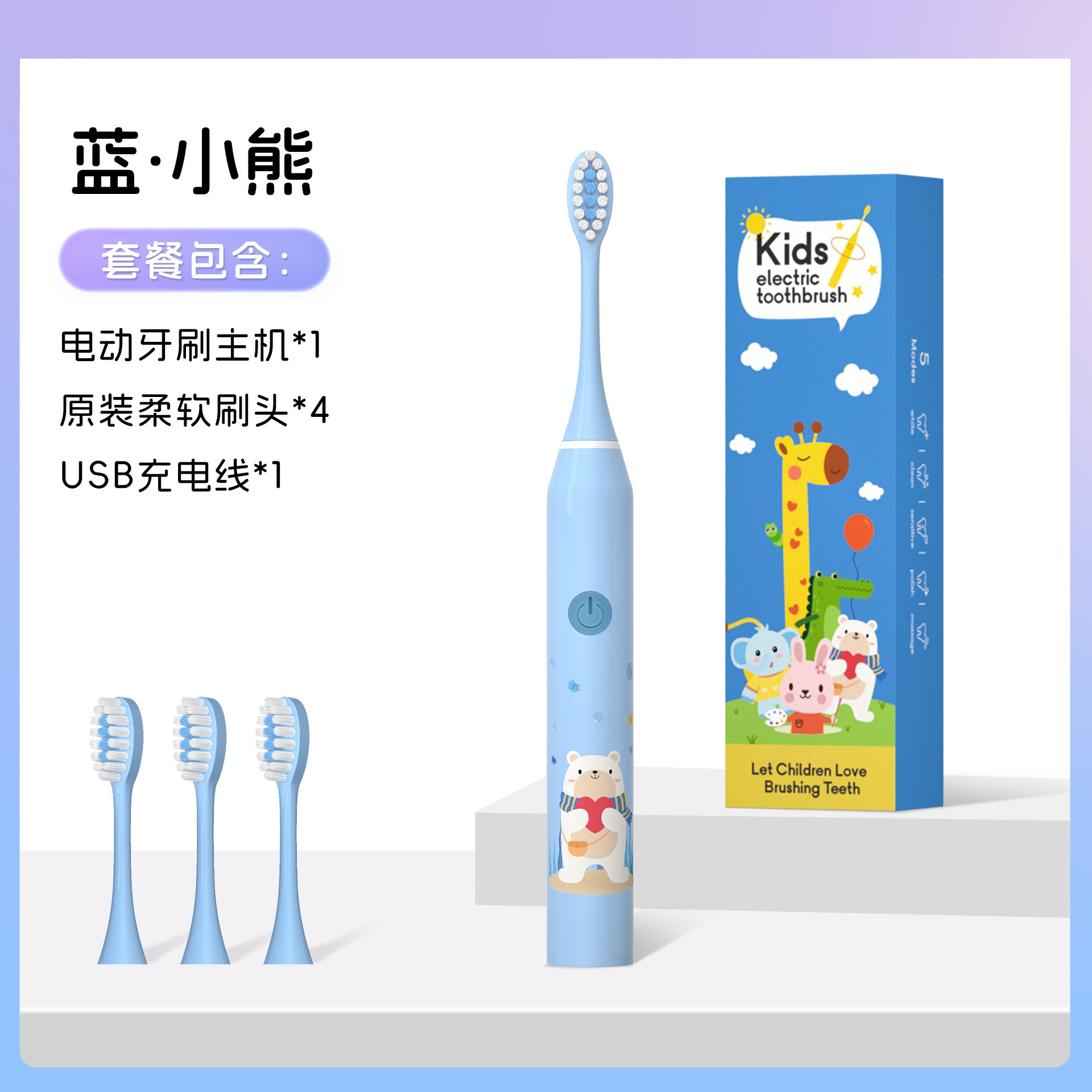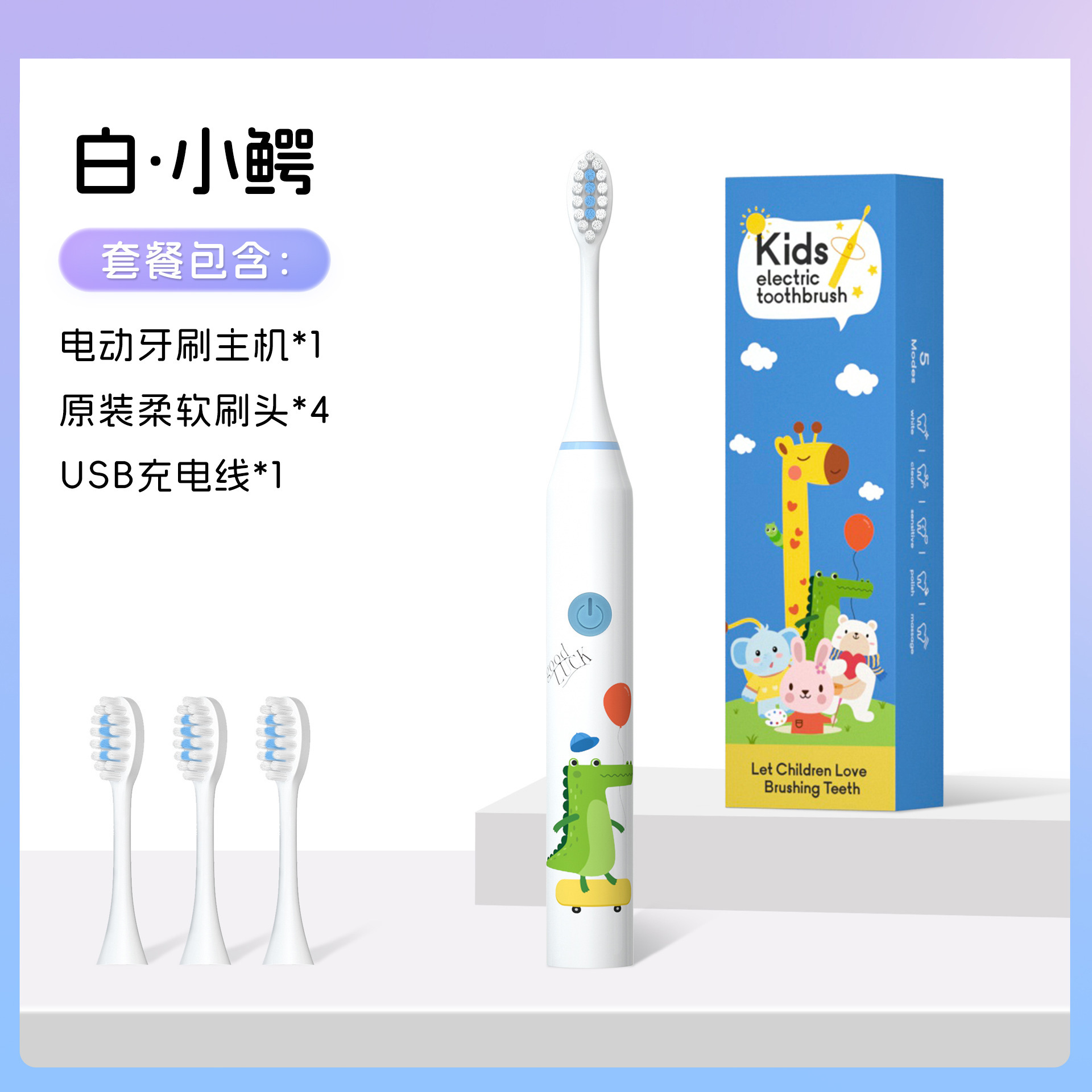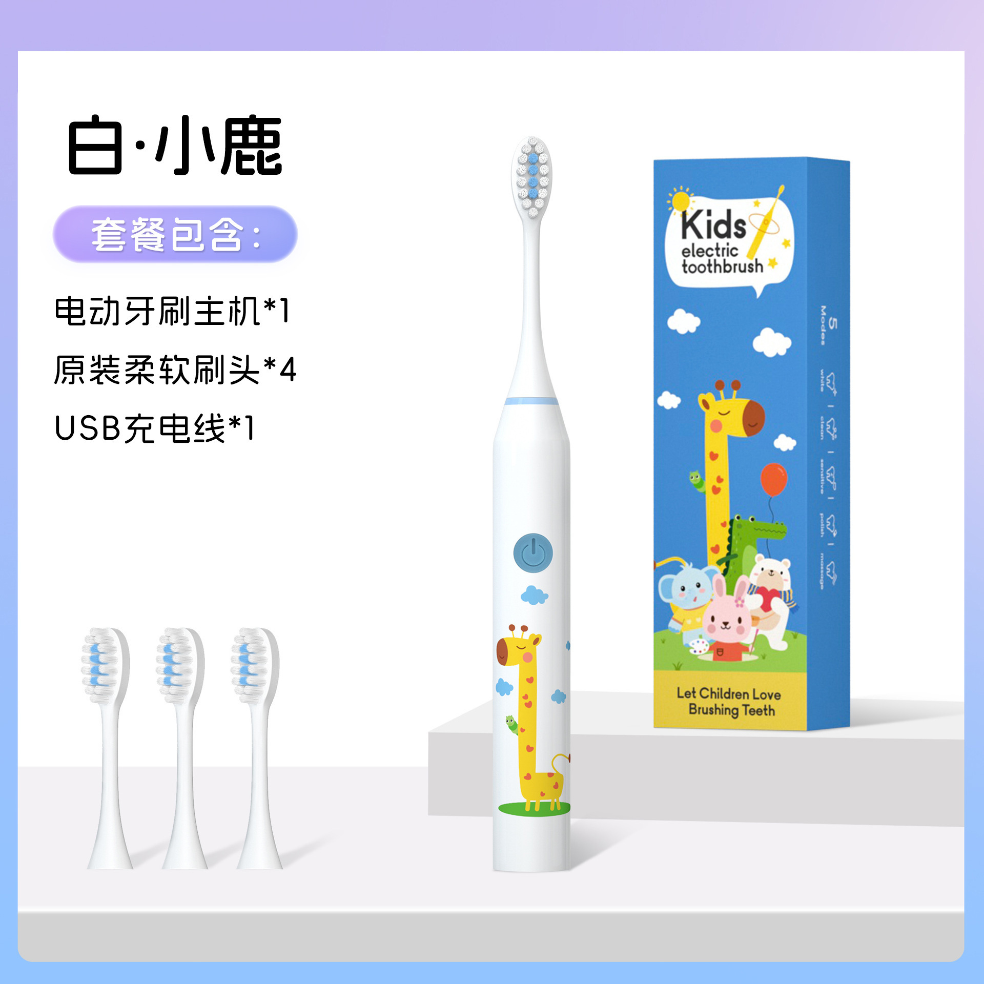 Accessories: Main unit + 4 brush heads + USB charging cable + instruction manual