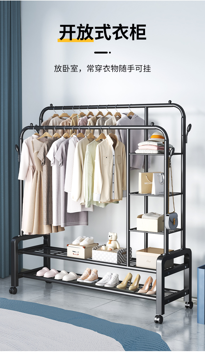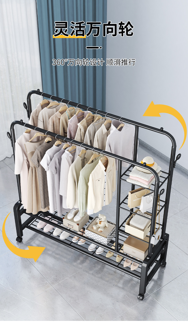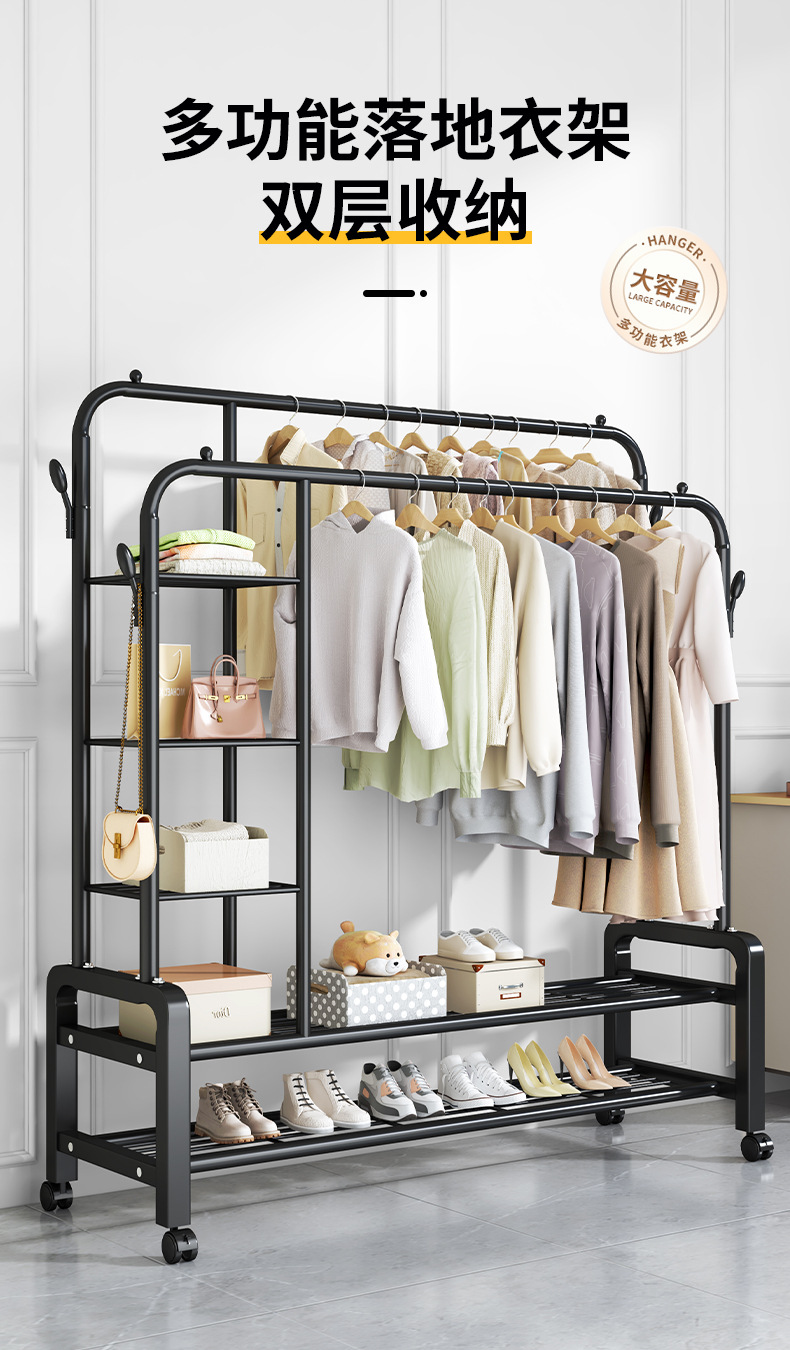 bl26h-iron coat rack side storage net double-layer double rod +4 coat hook 150 black + wheel