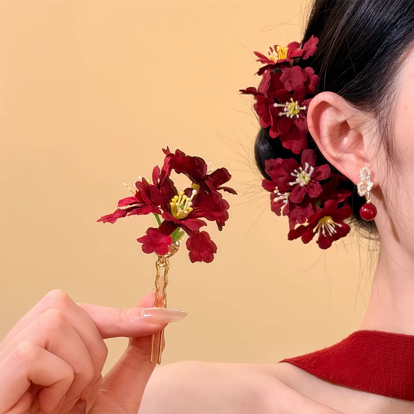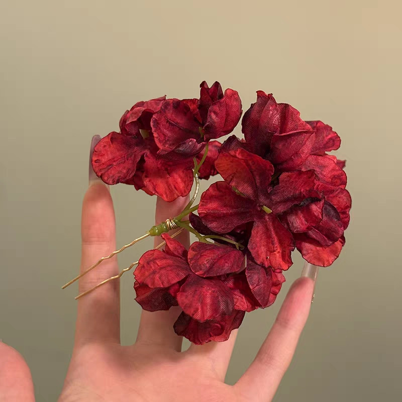 wine red artificial flower hairpin