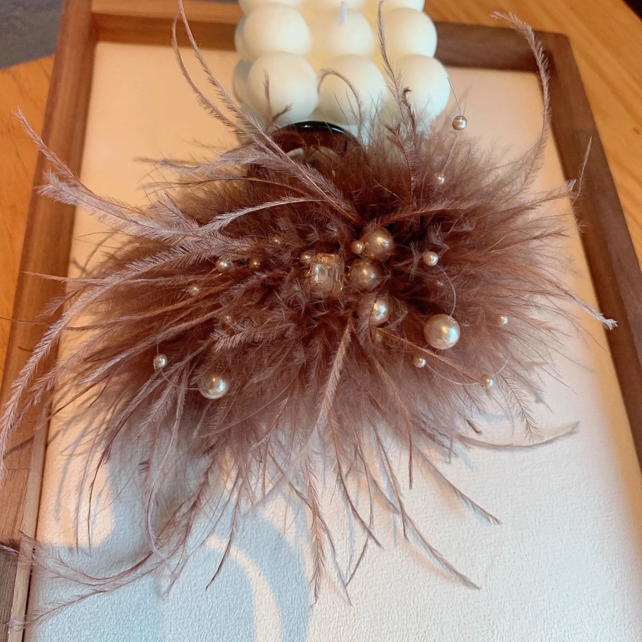 coffee color-ostrich feather rhinestone pearl clip about 13cm (pc clamp is drop-resistant and scratch-resistant)