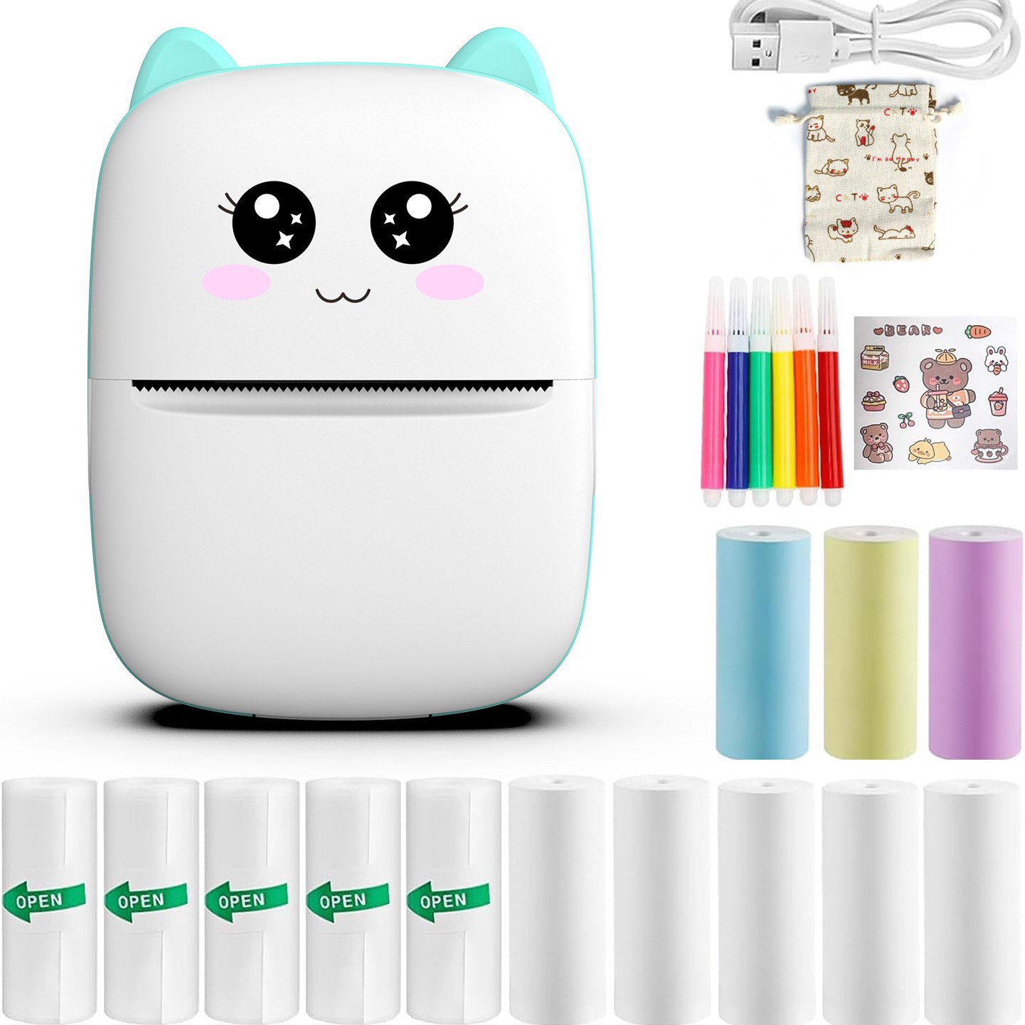 x5 blue +5 rolls of thermosensitive paper +5 rolls of adhesive paper +3 rolls of fancy paper +6 crayons