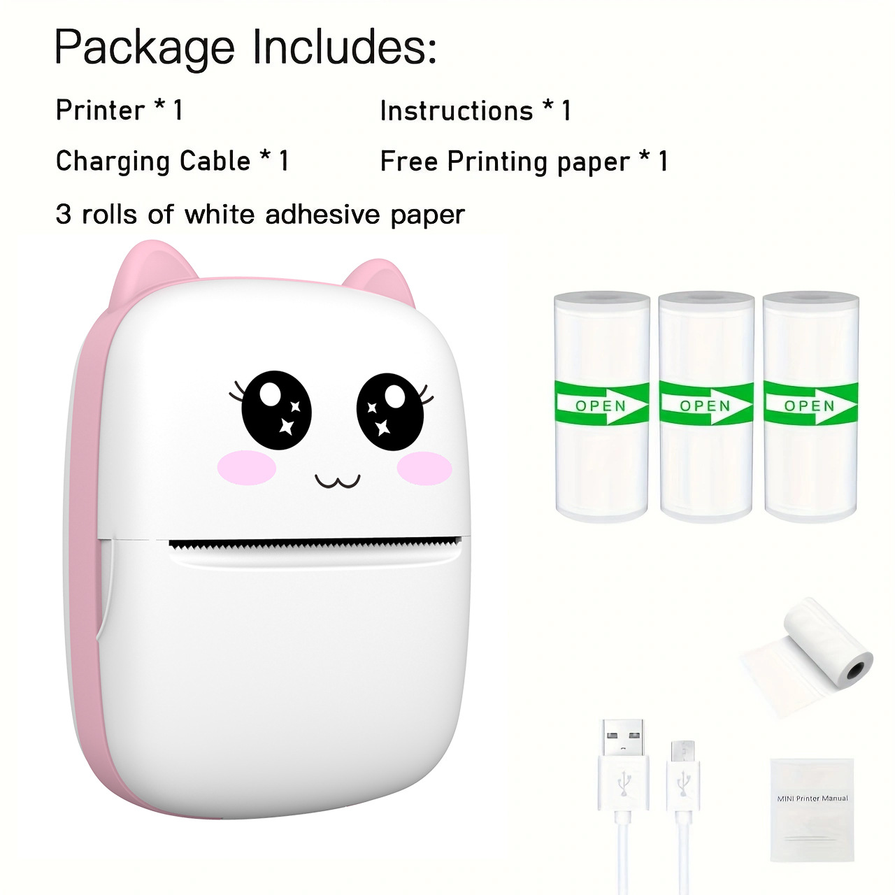 x5 pink +5 rolls of thermosensitive paper +5 rolls of adhesive paper +3 rolls of fancy paper +6 crayons