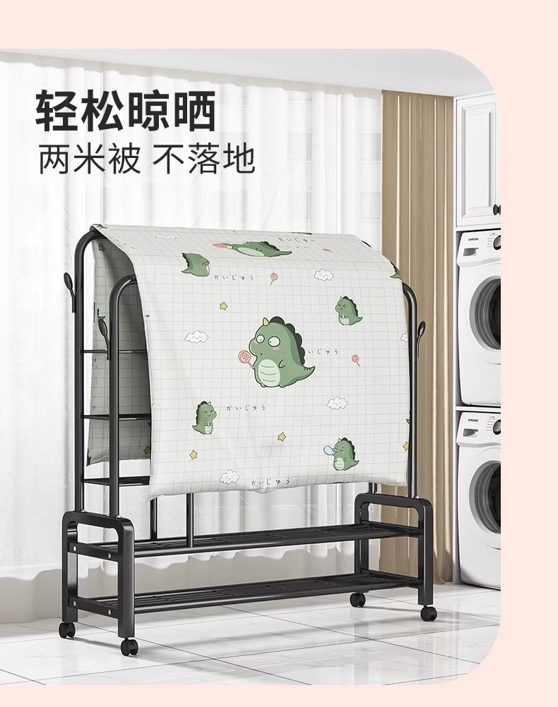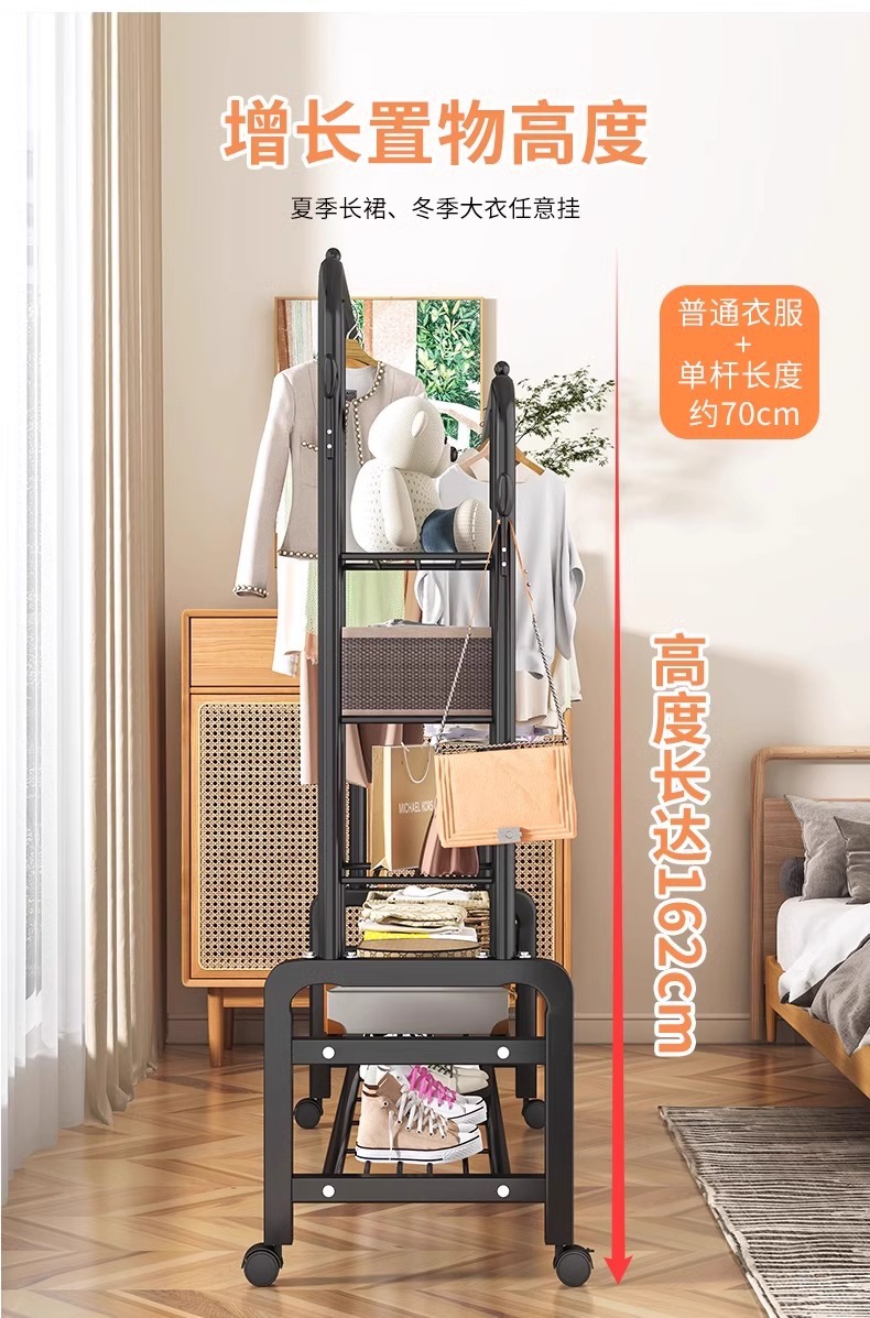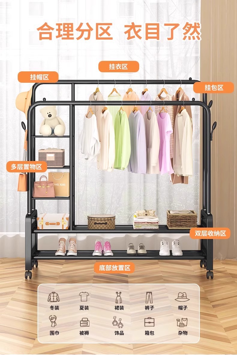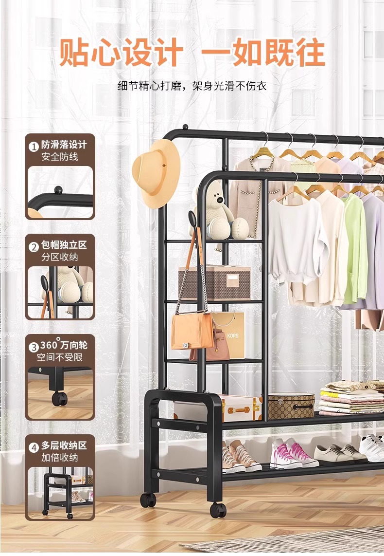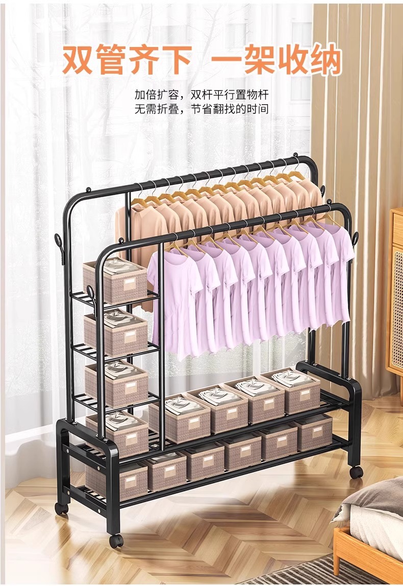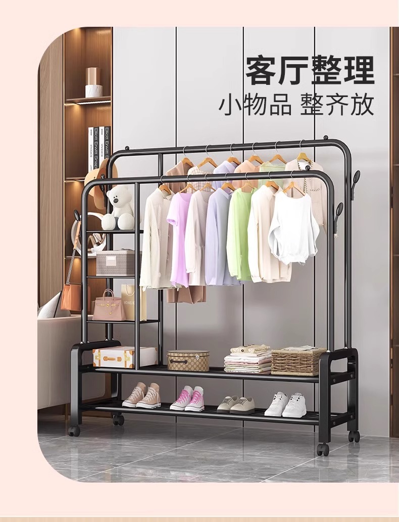 double rod * double layer 150cm black-wheeled-storage rack-4 coat hook