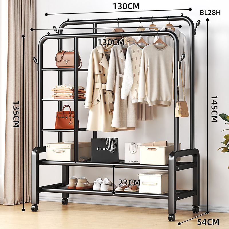 double rod * double layer 130cm black-wheeled-storage rack-4 coat hook