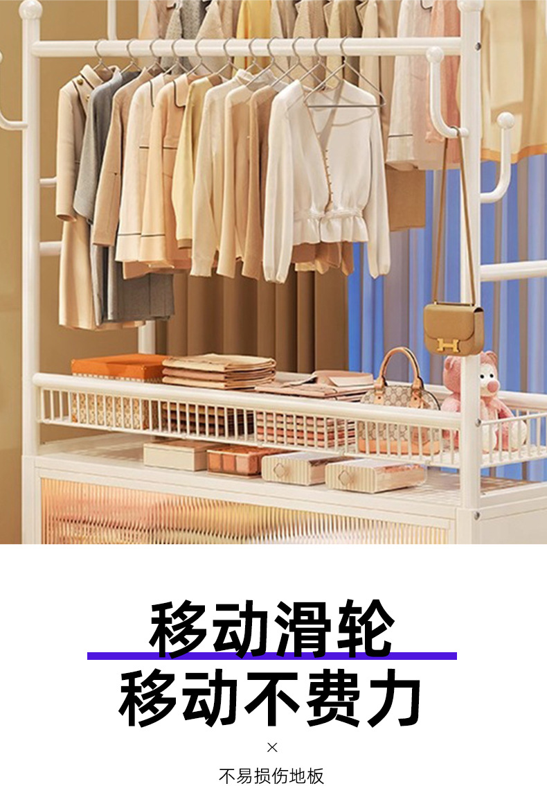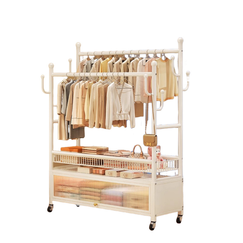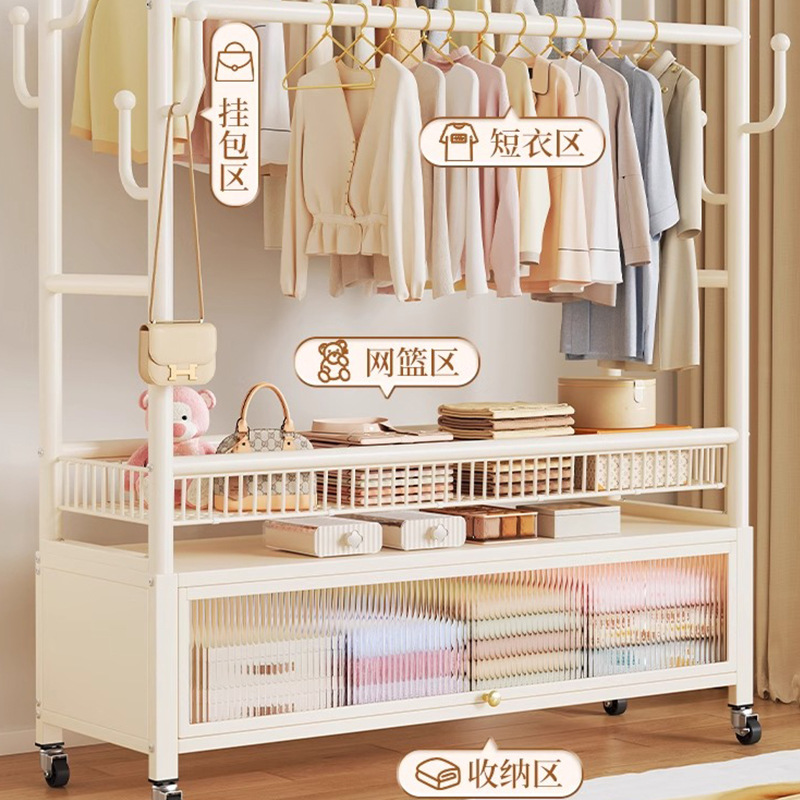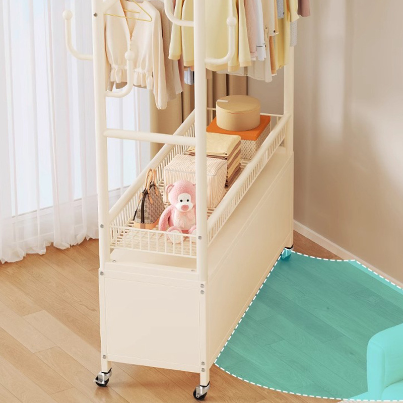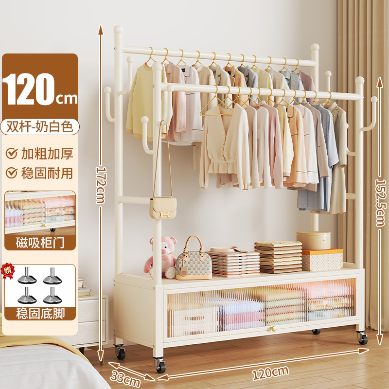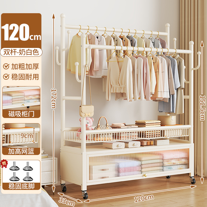 cream white 120cm double-row hanging rod +8 hooks [storage mesh basket + dustproof storage cabinet] free wheels + base feet