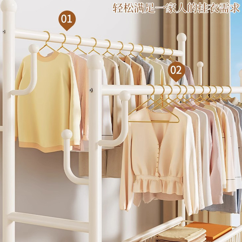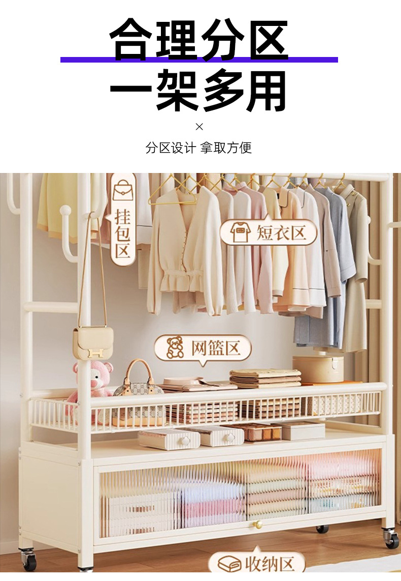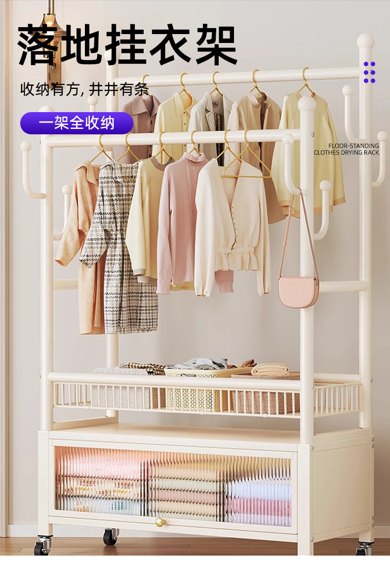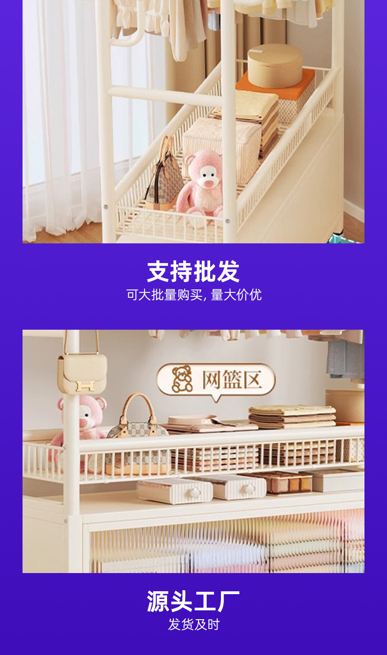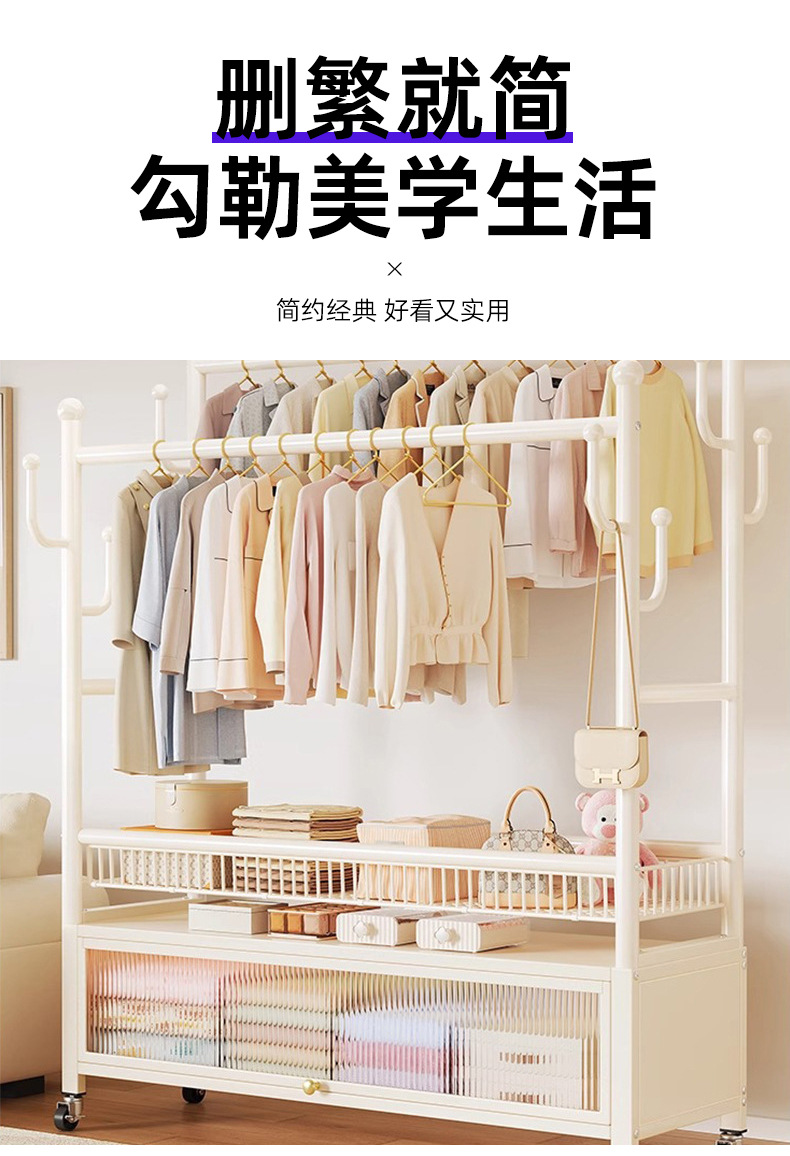 cream white 120cm double-row hanging rod +8 hooks [storage mesh basket + dustproof storage cabinet] free wheels + base feet