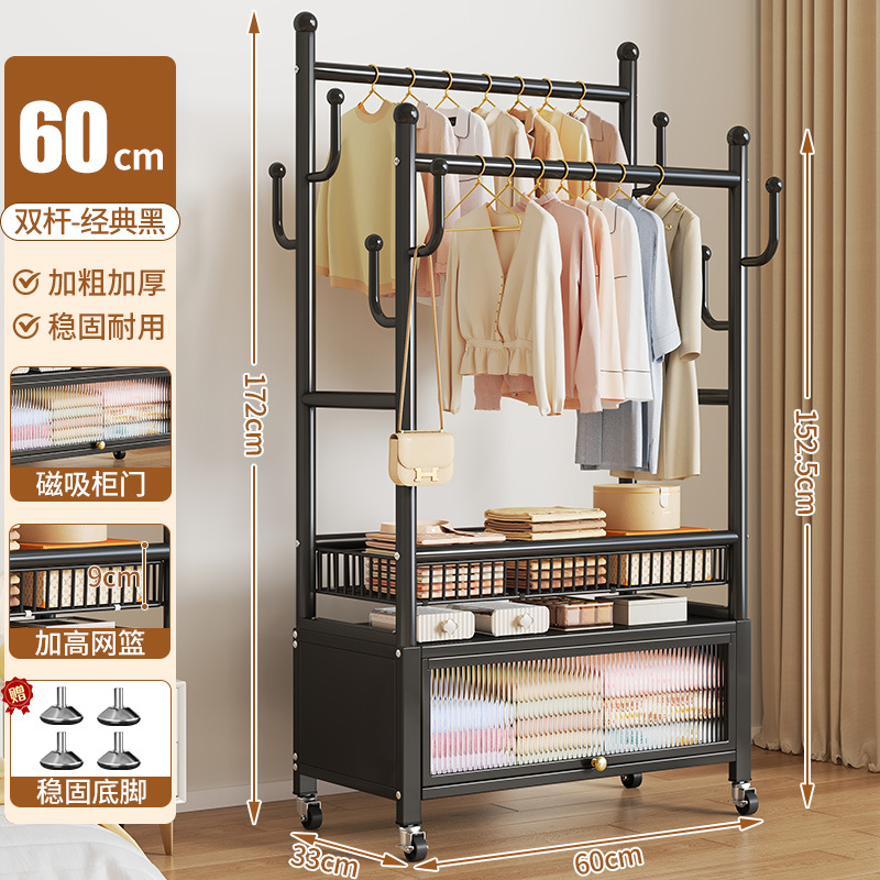high-end black 60cm double-row hanging rod +8 hooks [storage mesh basket + dust-proof storage cabinet] free wheels + base feet