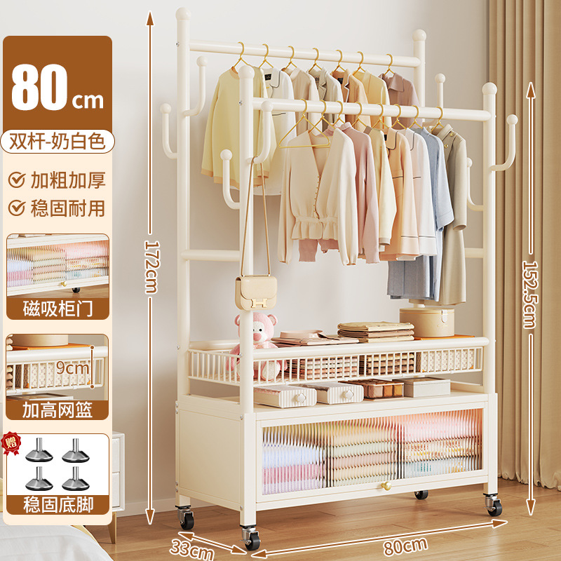 cream white 80cm double-row hanging rod +8 hooks [storage mesh basket + dustproof storage cabinet] free wheels + feet