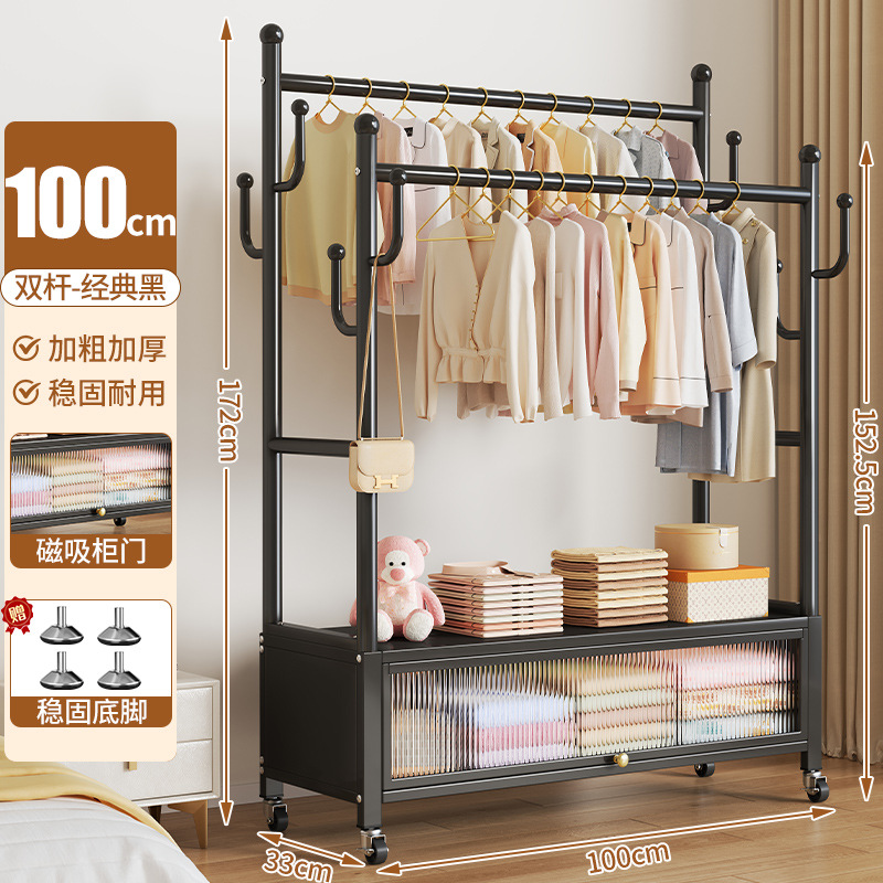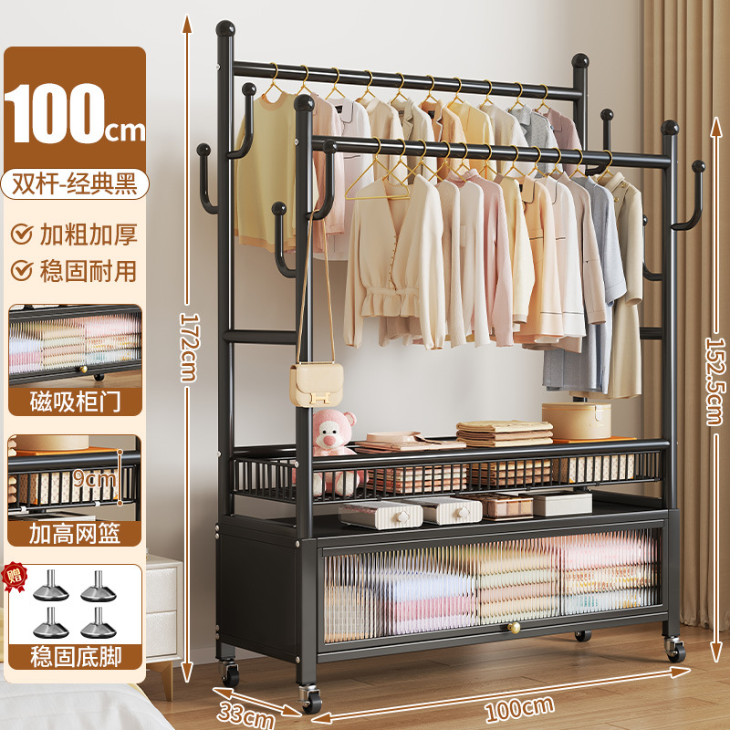 high-end black 100cm double-row hanging rod +8 hooks [storage mesh basket + dust-proof storage cabinet] free wheels + base feet