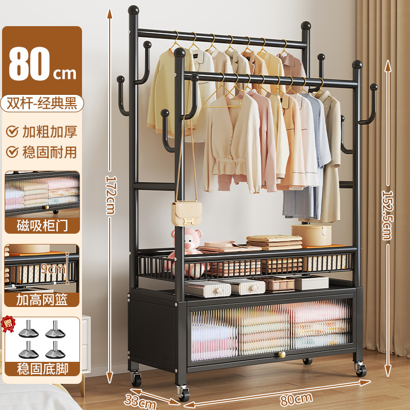 high-end black 80cm double-row hanging rod +8 hooks [storage mesh basket + dustproof storage cabinet] free wheels + bottom feet