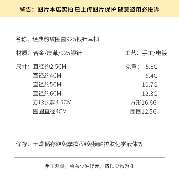 3758 fine circle 6cm classic leopard pattern circle 925 silver needle ear clip