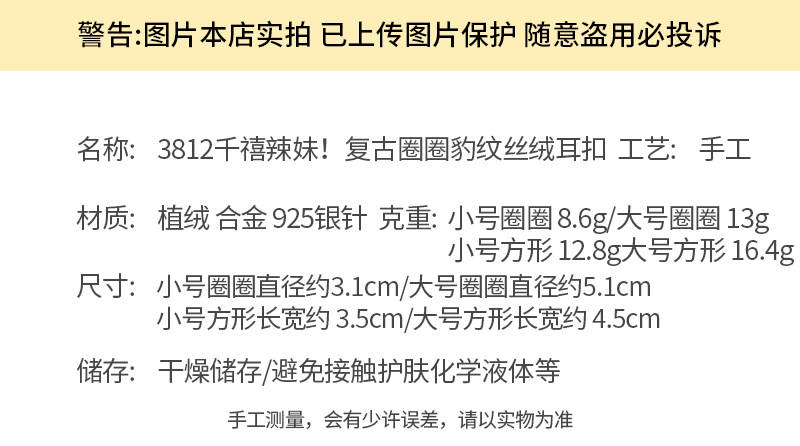 3812 square leopard flocking [3.5cm]925 silver needle