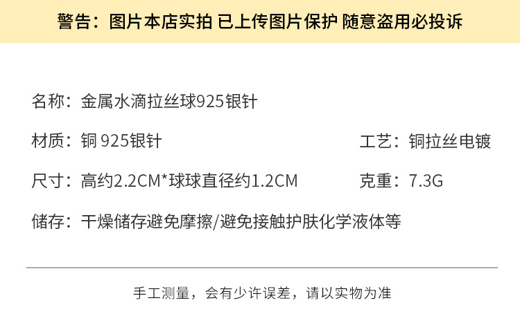 1914 golden water drop wire drawing ball ball 925 silver needle