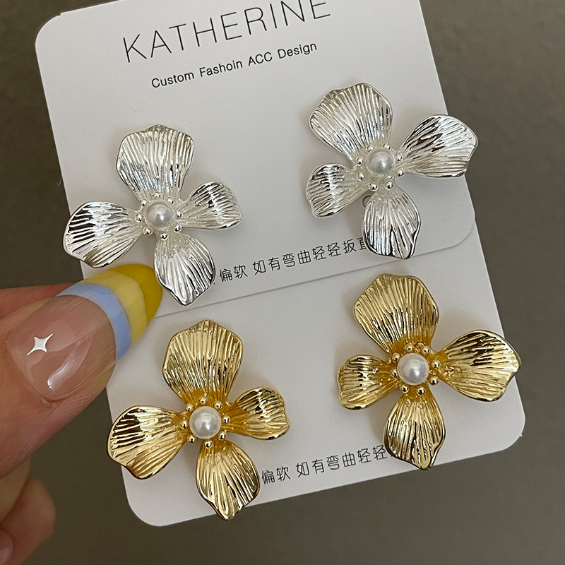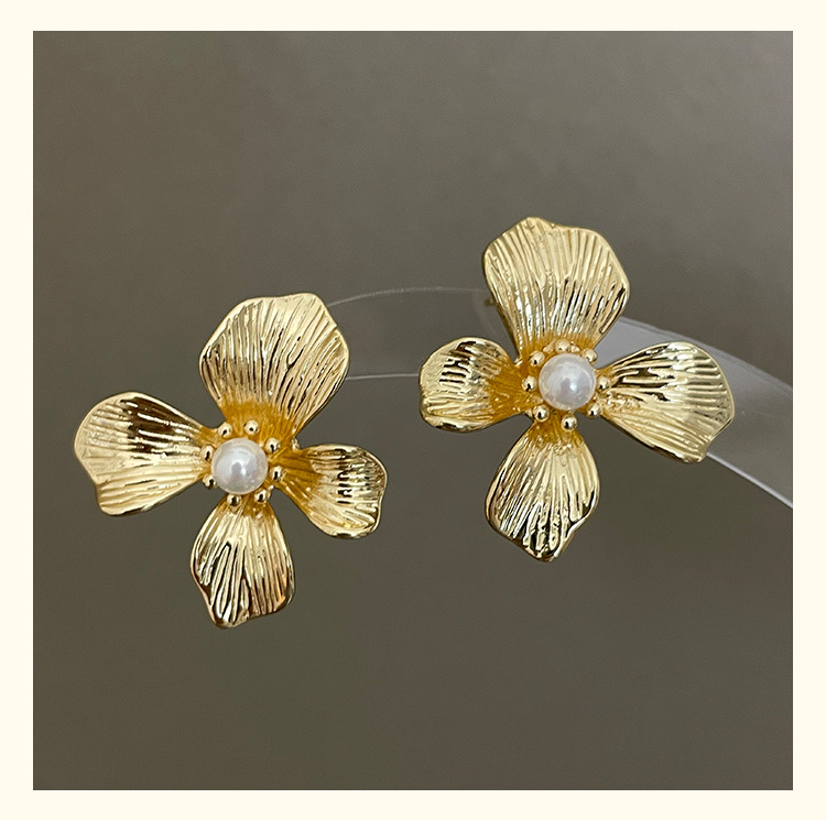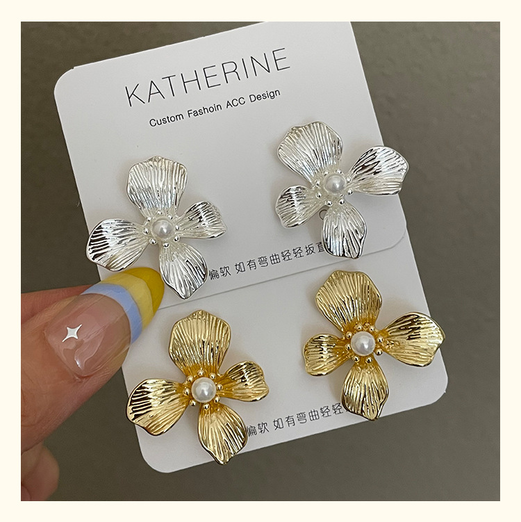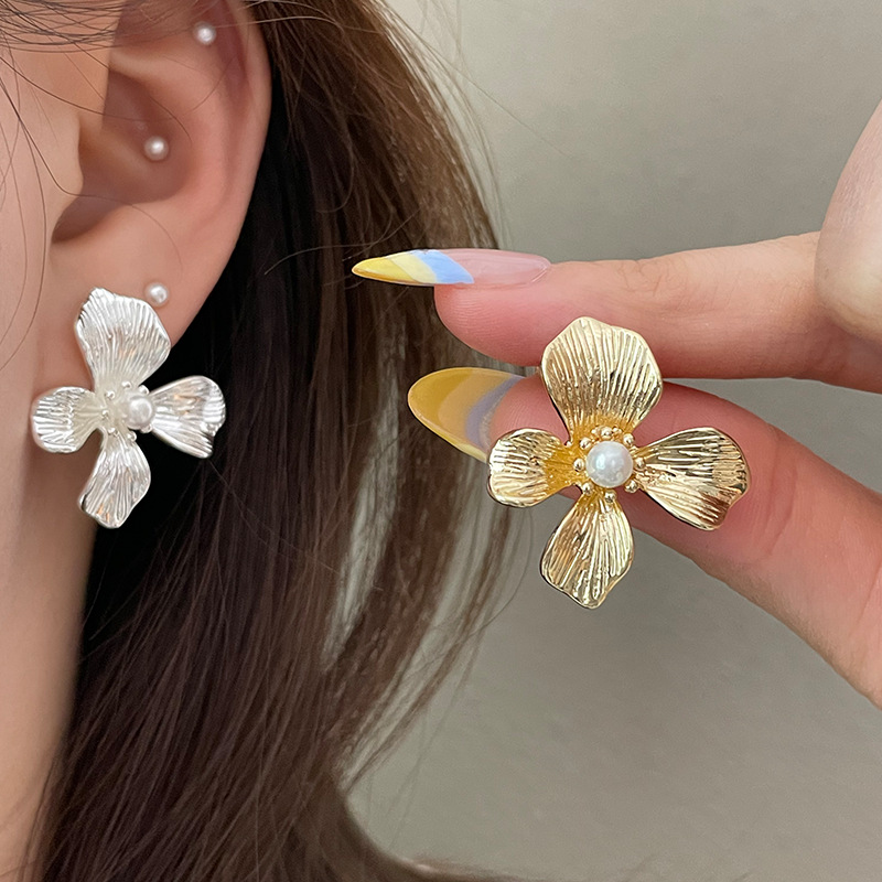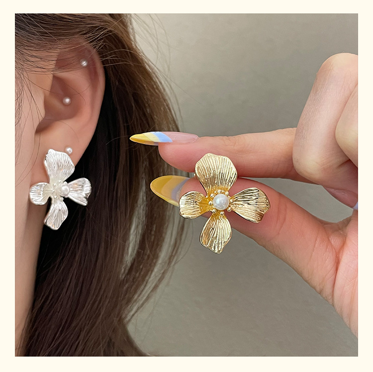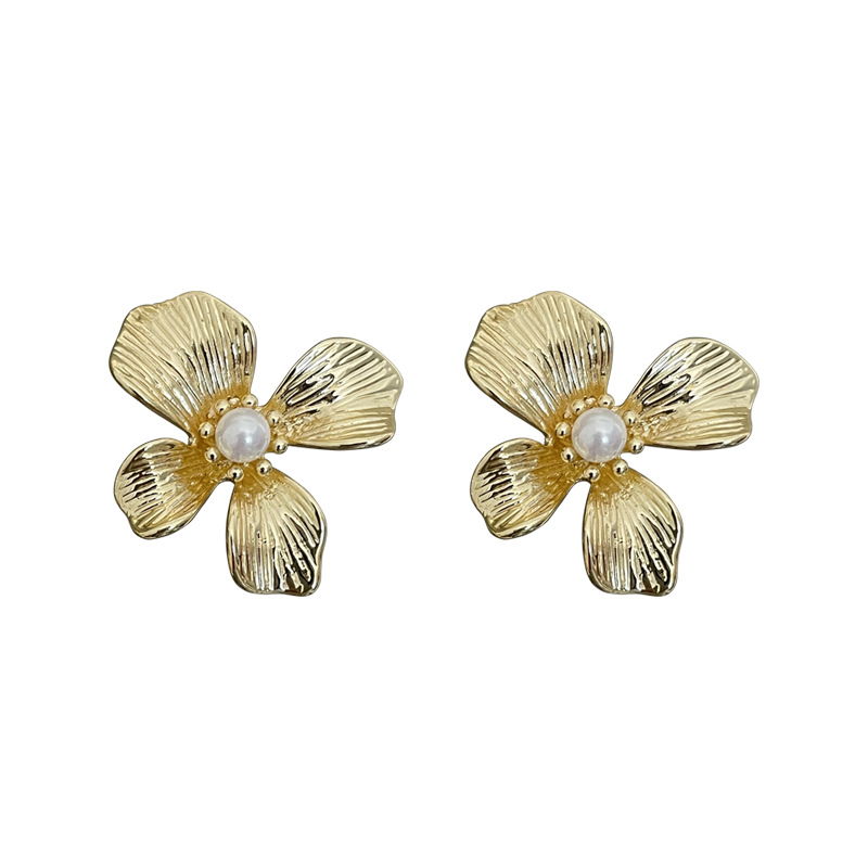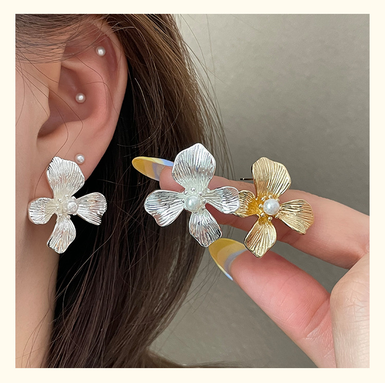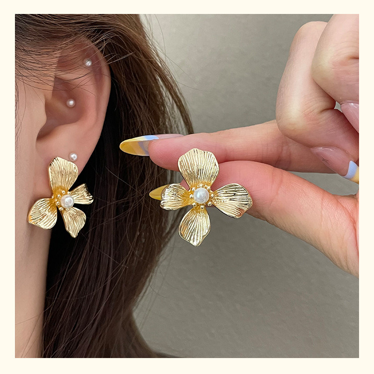 3305 gold-colored metal pearl center 925 silver needle earrings