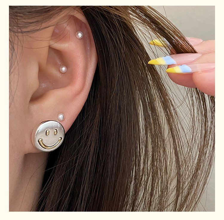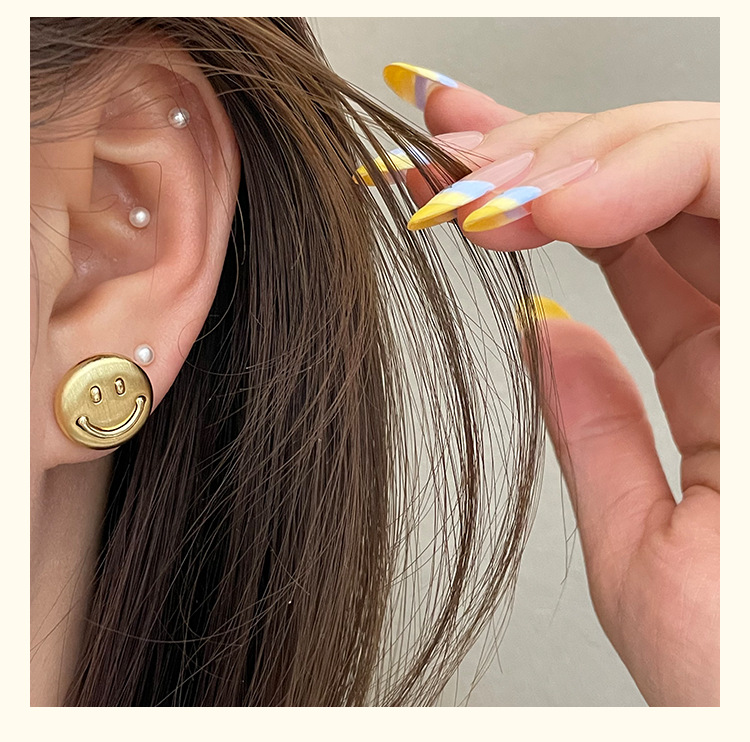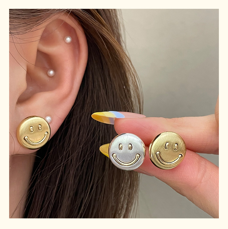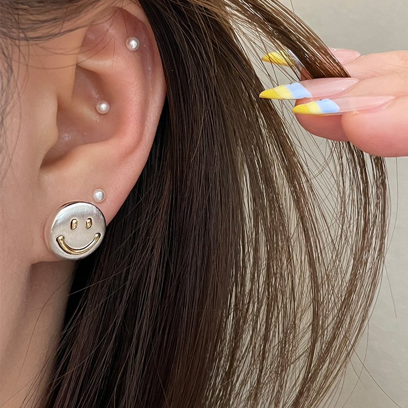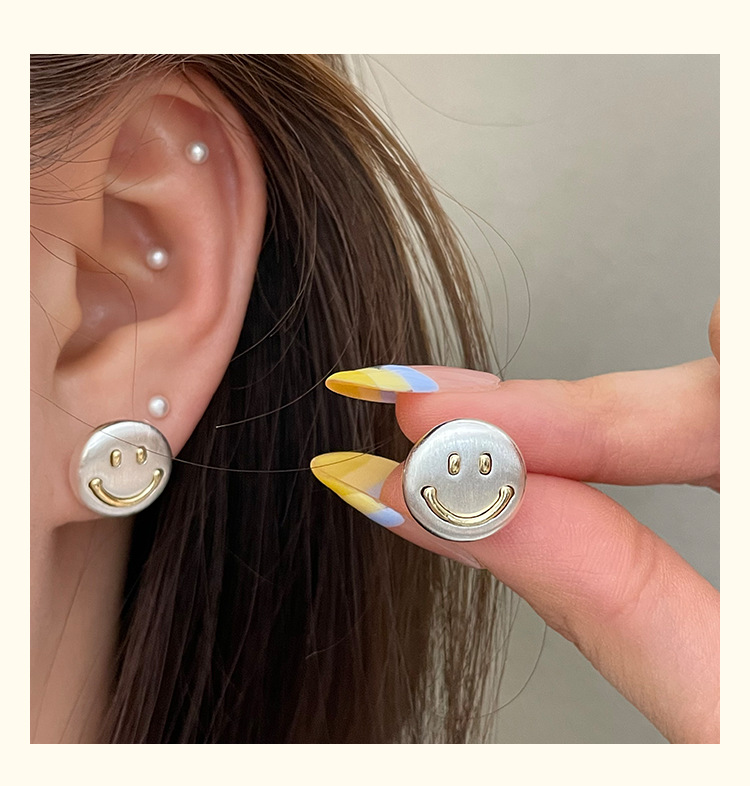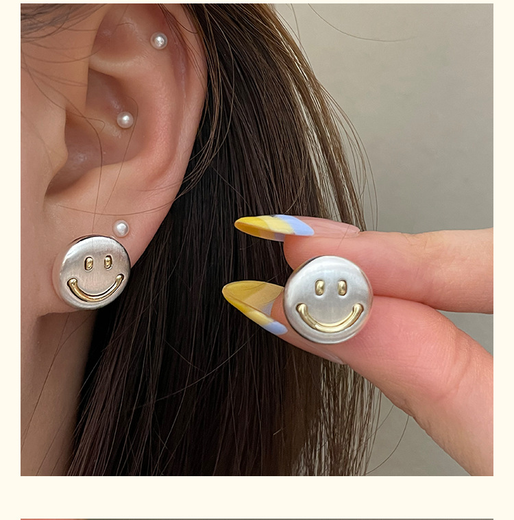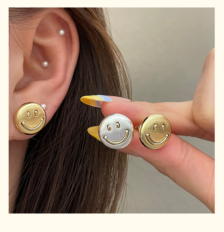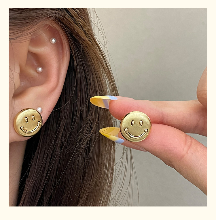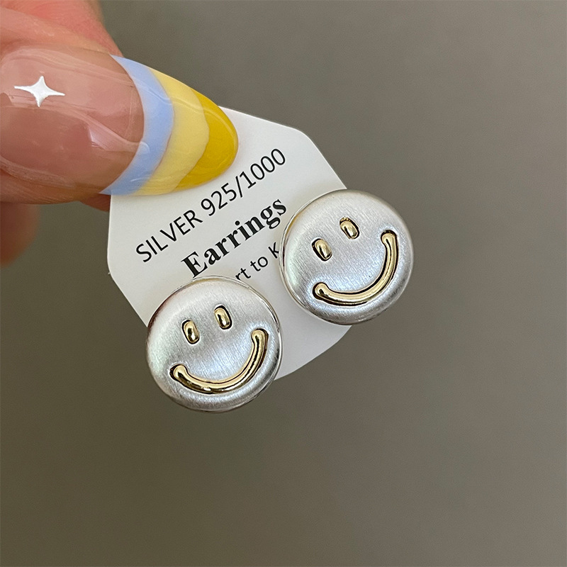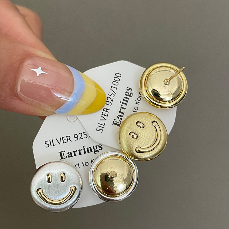 3281 metal brushed smiling face gold 925 silver stud earrings